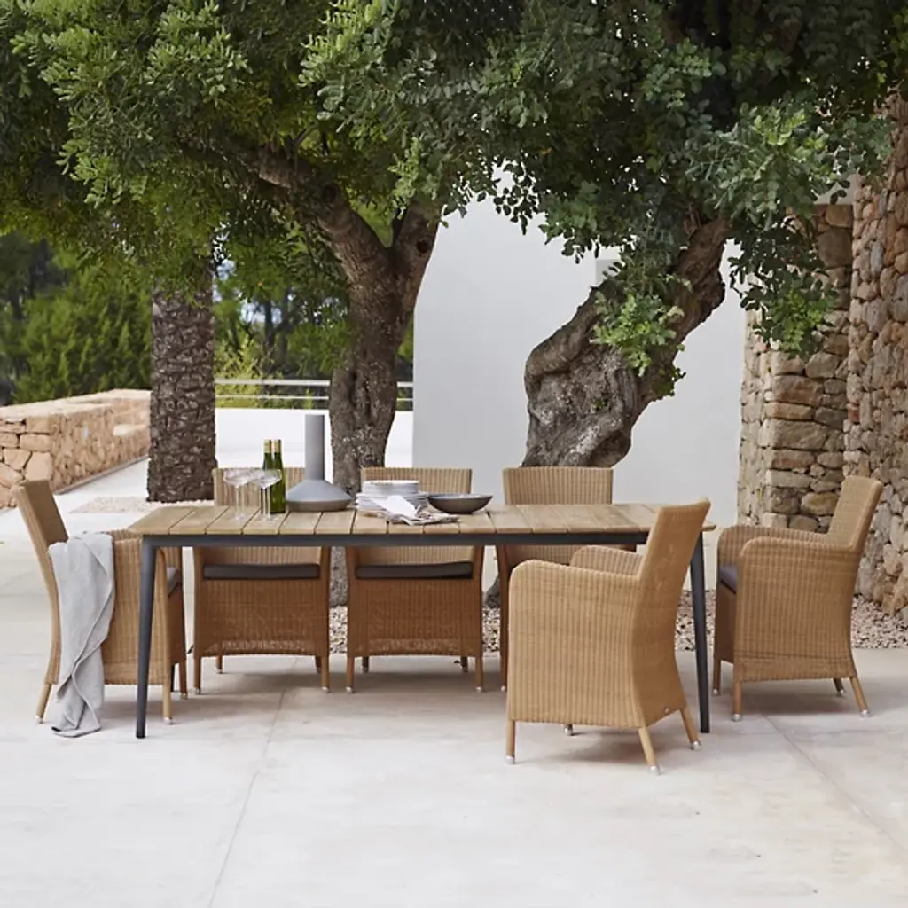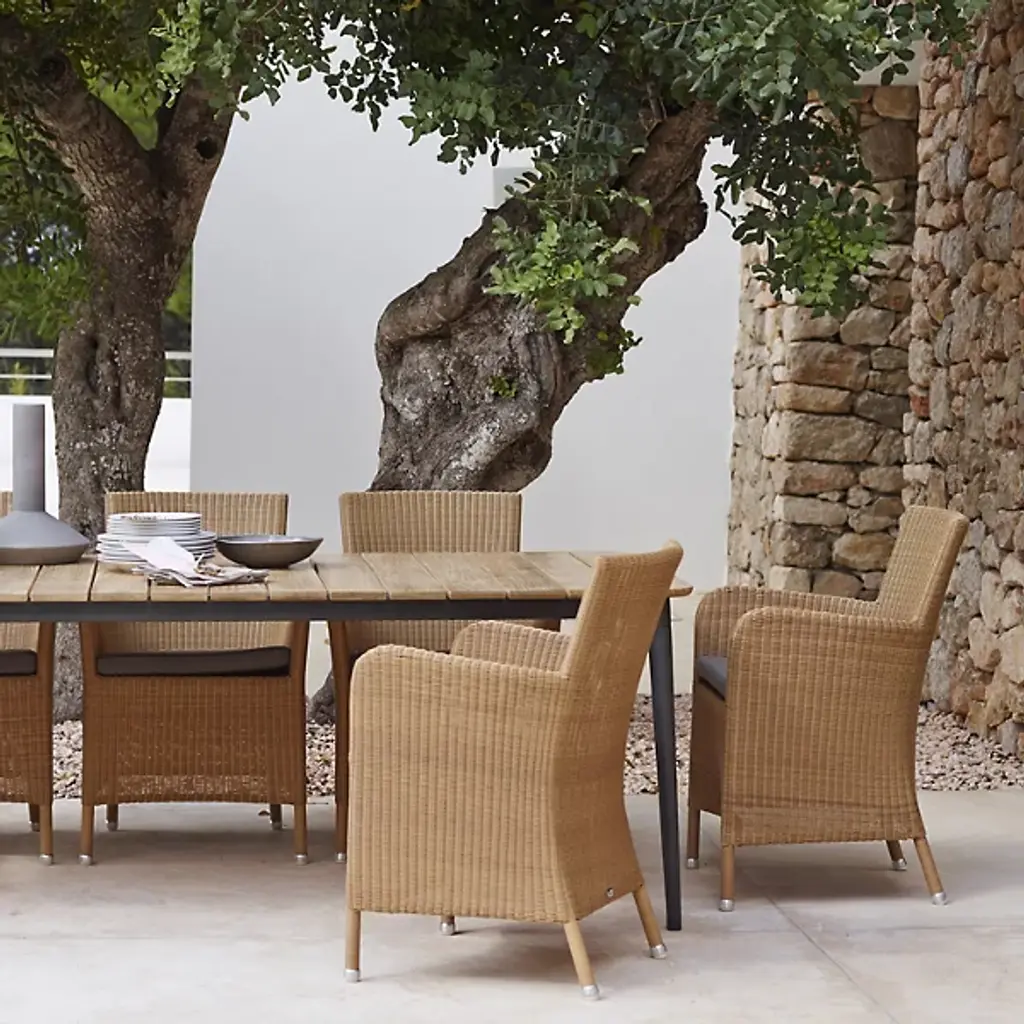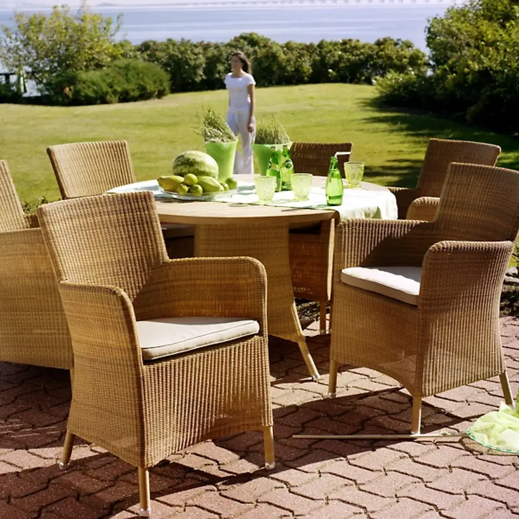Tall, tasteful, and tactile, the Hampsted Outdoor Armchair with Cushion from Cane-line brings commanding, comfortable seating to outside spaces. This Danish design starts with a strong tubular frame of galvanized steel surrounded by faux wicker loom-woven from wet and UV-resistant Cane-line weave with hours of craftsmanship perfecting the tactile loops. The curving arms and high back create an encompassing seat, while the rugged materials mean the chair can be left outside year-round, easily weathering extreme climate conditions.