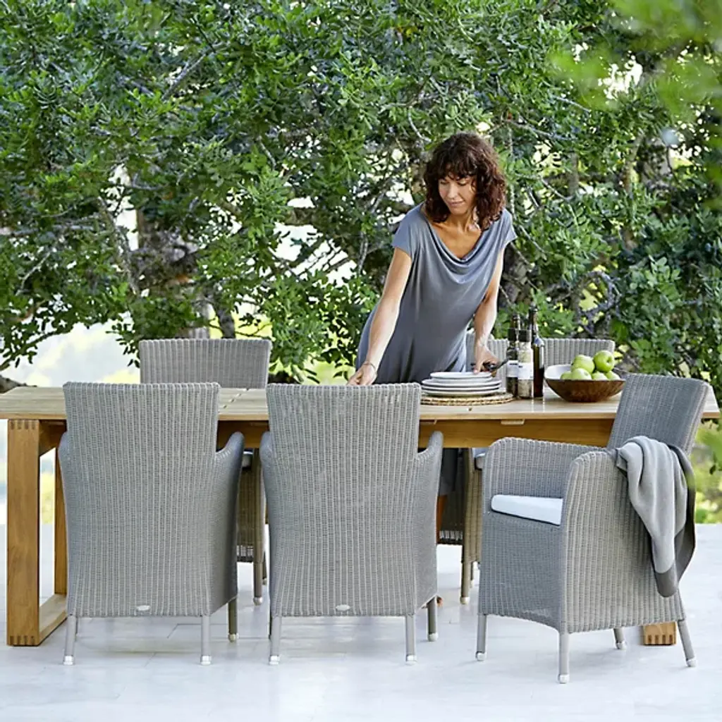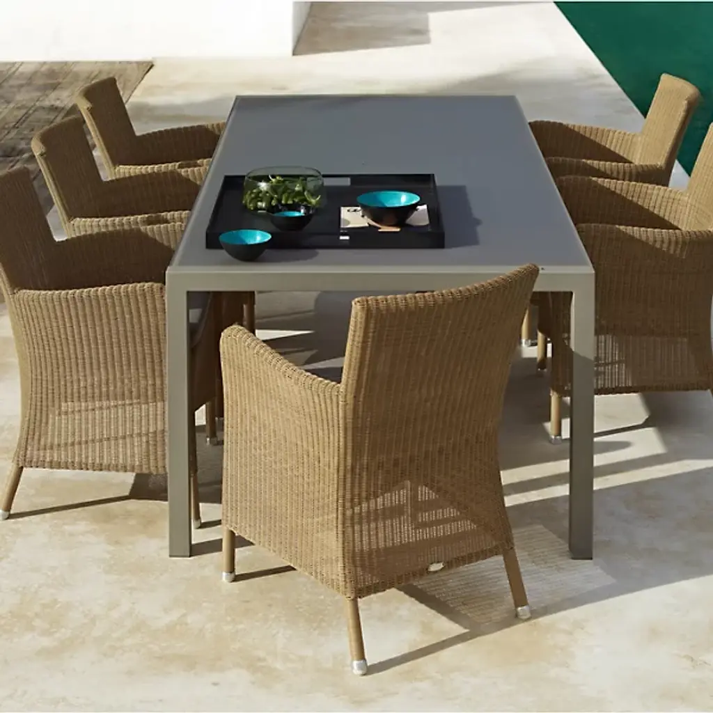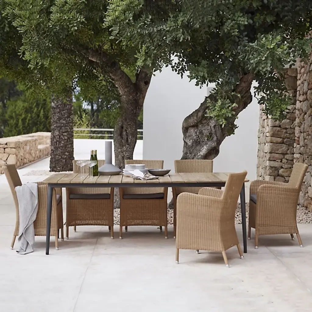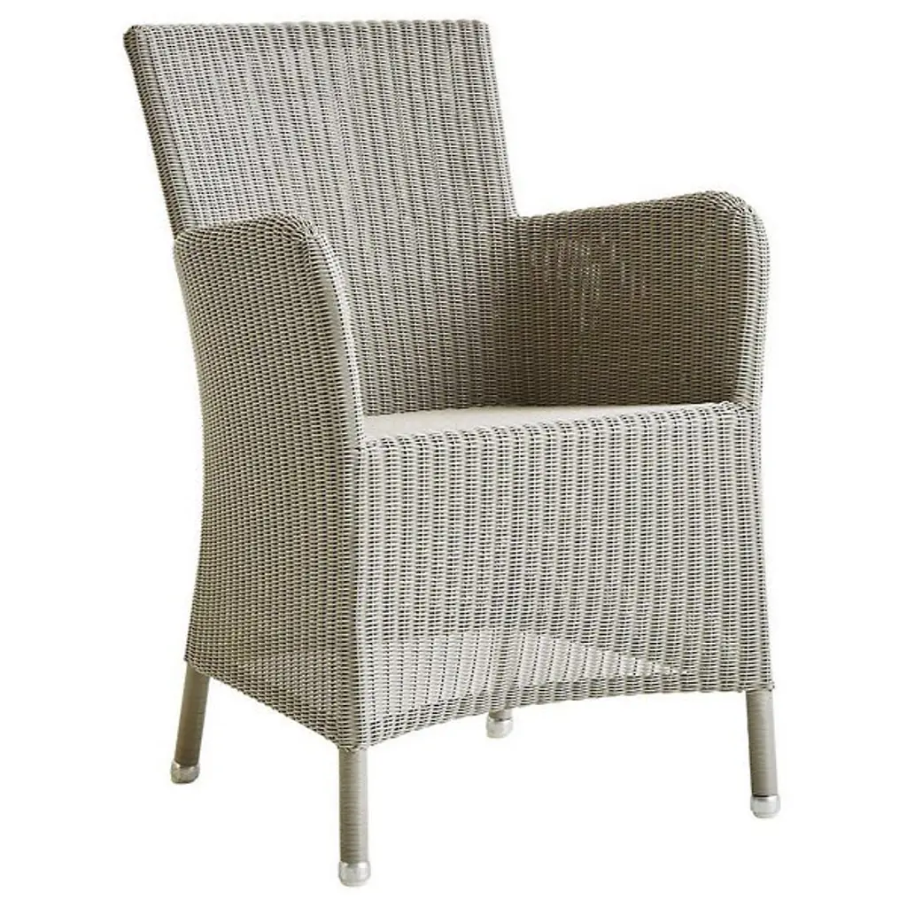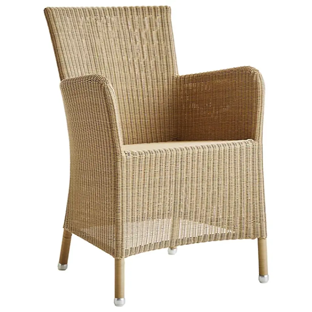Tall, tasteful, and tactile, the Hampsted Outdoor Armchair with Cushion from Cane-line brings commanding, comfortable seating to outside spaces. This Danish design starts with a strong tubular frame of galvanized steel surrounded by faux wicker loom-woven from wet and UV-resistant Cane-line weave with hours of craftsmanship perfecting the tactile loops. The curving arms and high back create an encompassing seat, while the rugged materials mean the chair can be left outside year-round, easily weathering extreme climate conditions.