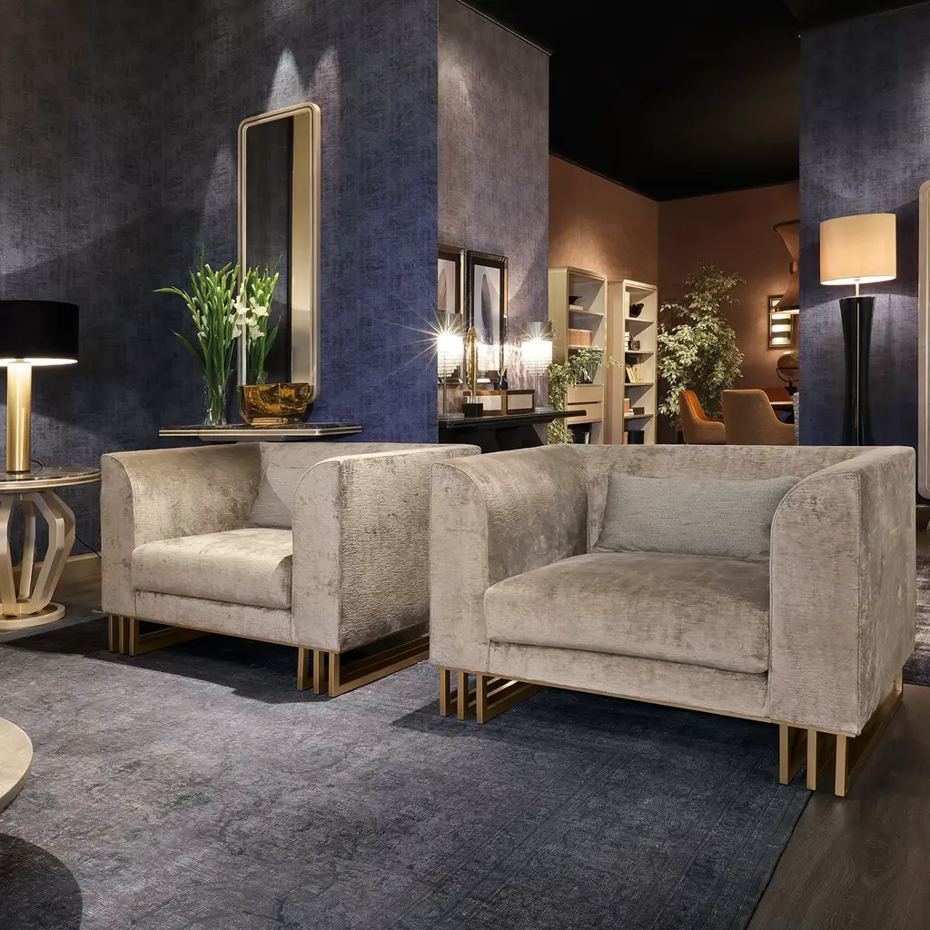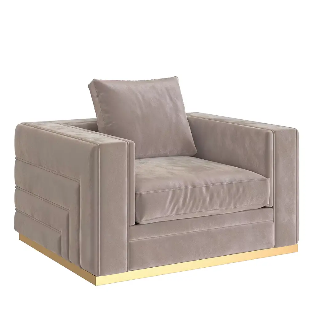 From the Hanami Collection of contemporary furnishings, this armchair is the perfect complement to the Hanami Urban Chic Sofa. On a metal base, shown here in gold with a satin finish, the armchair is upholstered in your choice of material. Shown here in velvet, the chair is also available in a variety of faux and natural leathers.