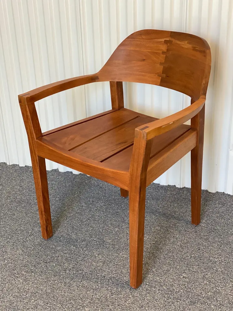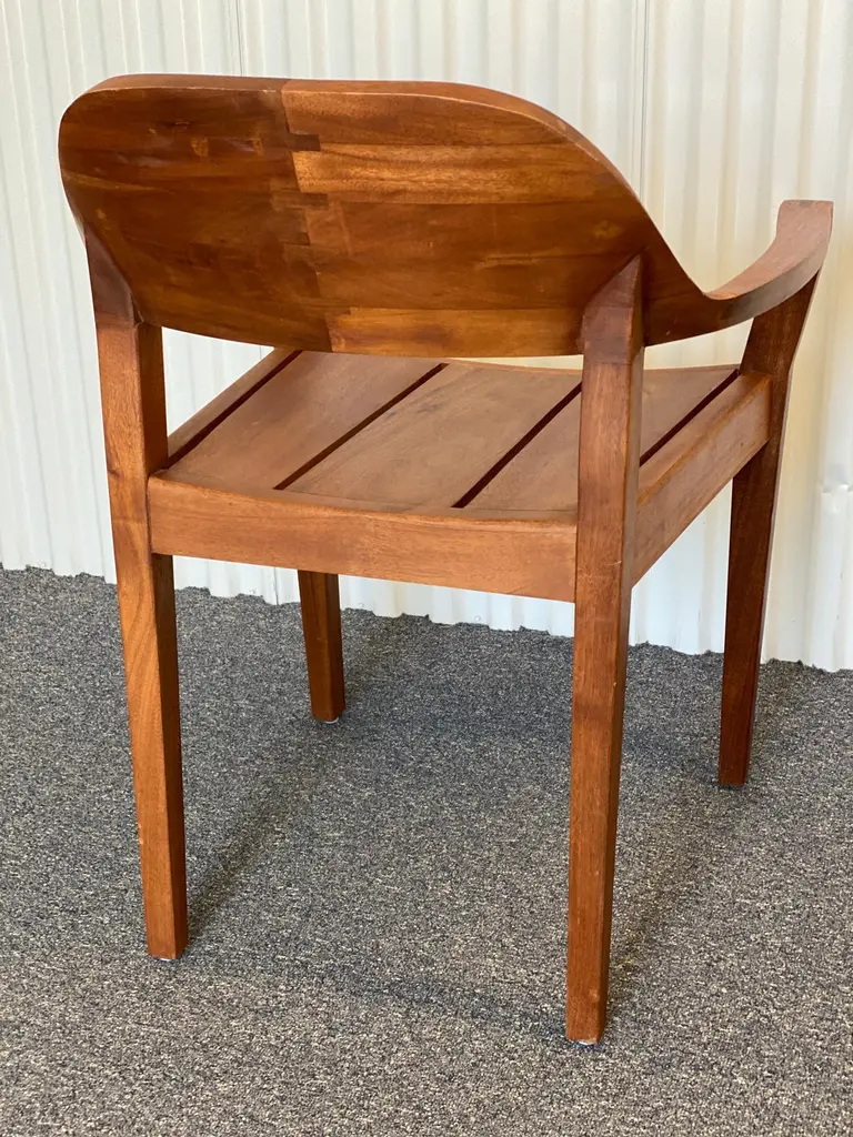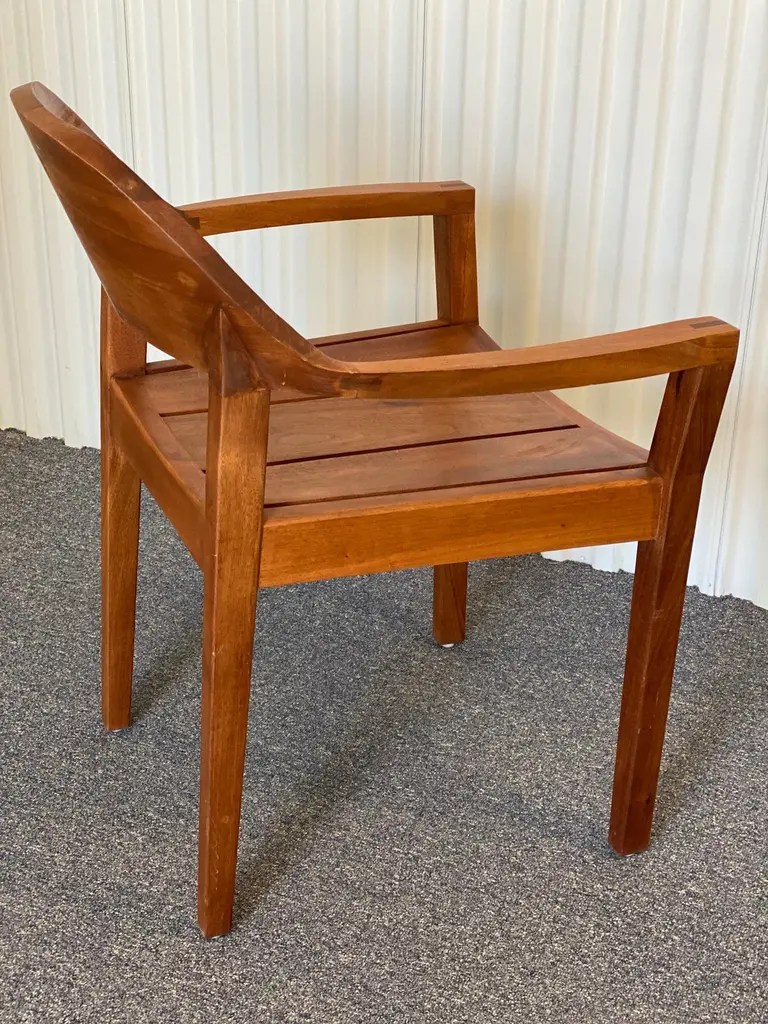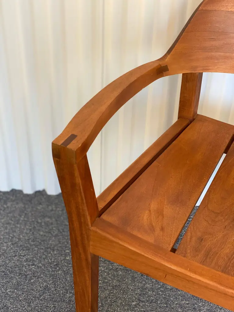 Handmade modern style Royal mahogany srmchair.Made in Nicaragua out of local wood, Cedro Macho or Royal mahogany wood. Some scratches to finish. Really well made, solid chair with interesting design details.Measures: 33" high x 25.5" wide x 22" deep x 18.5" seat height.