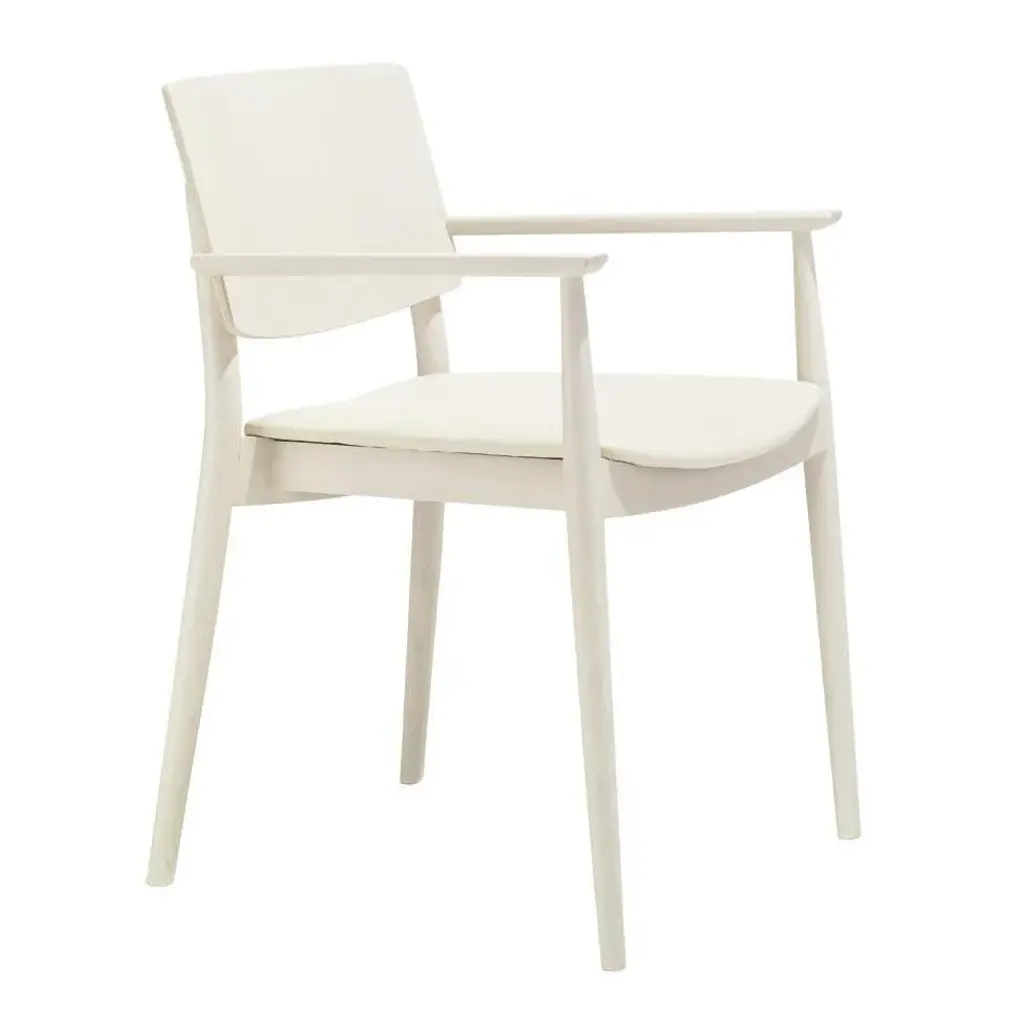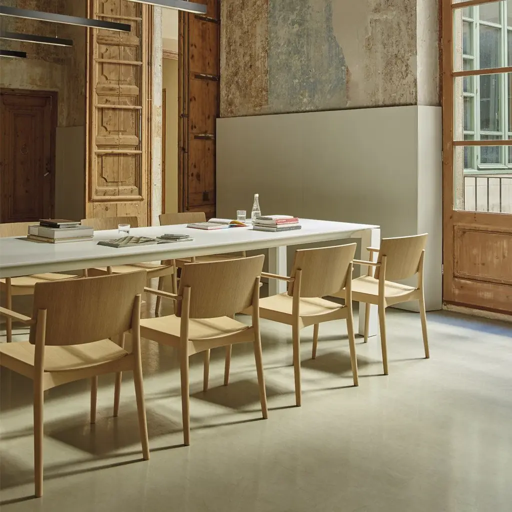 Armchair with upholstered seat, oak board backrest and solid beech wood frame. Happy is a sturdy chair with a light and serene presence. Its rounded forms give versatility to integrate it into workspace, residential and public projects. The Happy Collection consists of stacking chairs and armchairs constructed from solid beech and oak panels with optional upholstered seat and back.