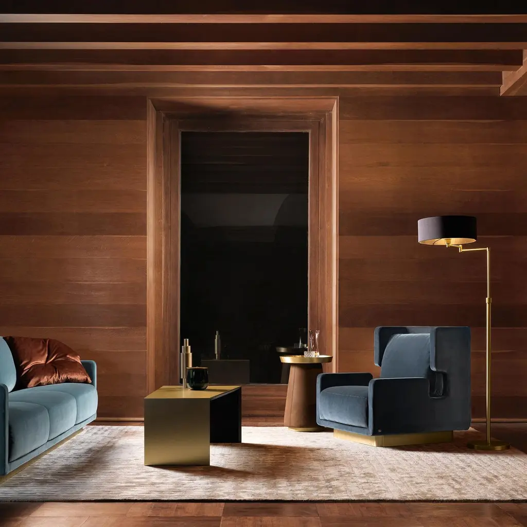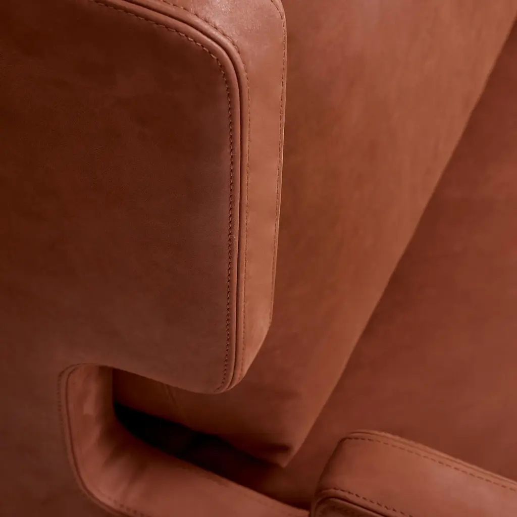 Only for refined spirits; Daytona collection design custom fit solutions dedicated to luxury, elegance and practicality. This armchair has a plywood structure covered in multi-density rubber, with upper layer in memory foam, all-over surface of soft goose down. Backrest cushion of goose down. Seat with 6 cm elastic belts. Plywood base with satin brass laminate. Photo features: Brown deluxe 22 leather (CAT C).