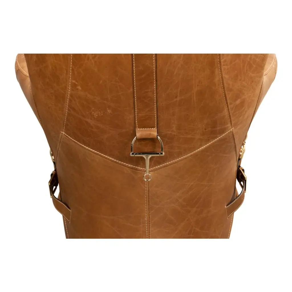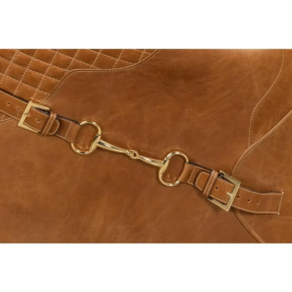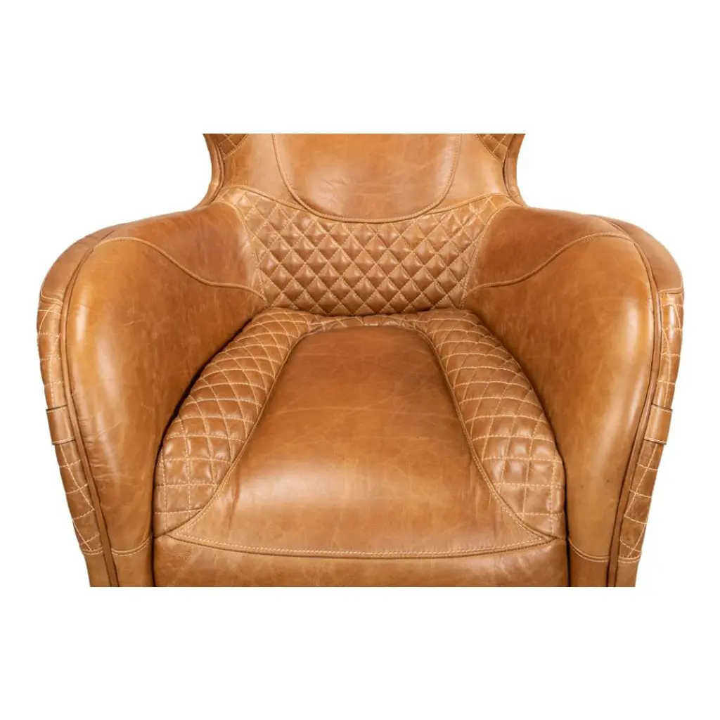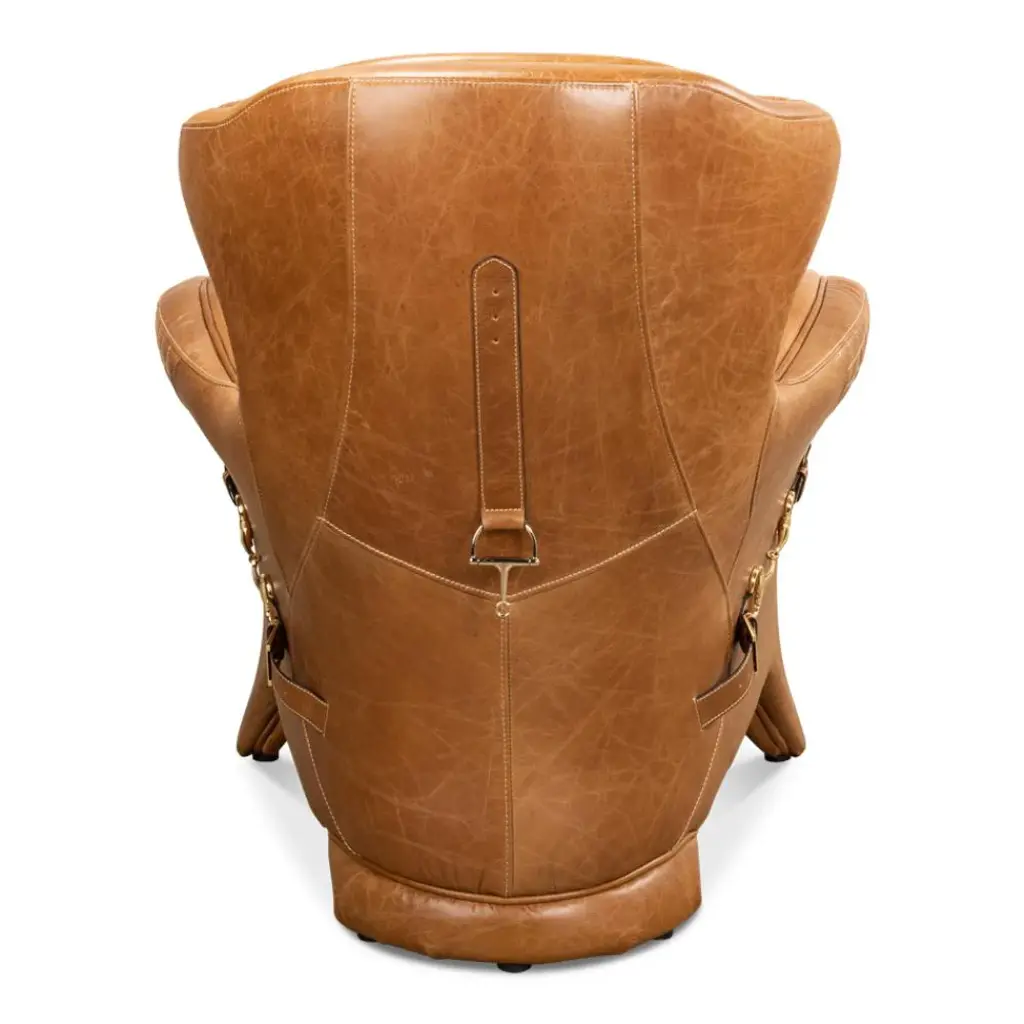 With a bit of equestrian flair, the Hera Arm Chair is most welcoming. With its' quilted sections and strapping buckles, this well padded tan leather chair offers unique style and ultimate comfort.