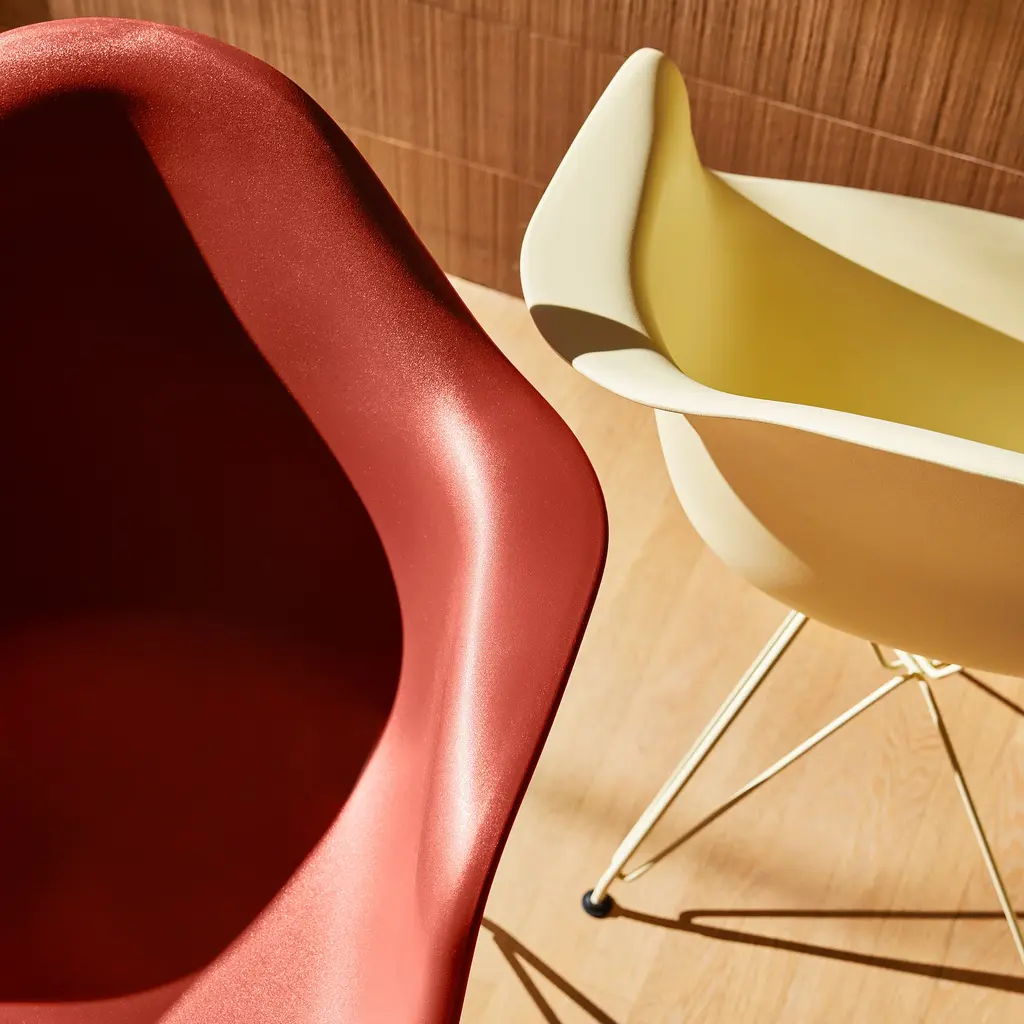 Charles and Ray Eames adapted molding techniques developed during World War II to produce their classic molded plastic shell chair's simple, gracious form, a design from 1950. The Herman MIller x HAYversion of the Eames Molded Plastic Armchair has been produced in 100% post-industrial recycled plastic. The subtle matte texture of the re-engineered plastic shell maintains the soft tactility of the original design. Herman Miller, HAY and Charles and Ray Eames are all represented in MoMA’s collection. Features of the Herman Miller x HAY Eames Molded Recycled Plastic Armchair include: Designed by HAY and Charles and Ray Eames. The classic shell silhouette is now offered in 6 new spirited colorways by Danish design house HAY, meant for endless interplay and combination Shell and powder-coated steel base are the same color for a tonal effect. Durable shell has a subtle matte texture. Made with 100% post-industrial recycled plastic. Unique waterfall seat edge helps reduce pressure on thighs. This is an authentic Herman Miller Eames Molded Plastic Armchair, verified by an authenticity certificate included in every order. Manufactured in the USA by Herman Miller. Measures 31.75h x 25w x 23.5"d.