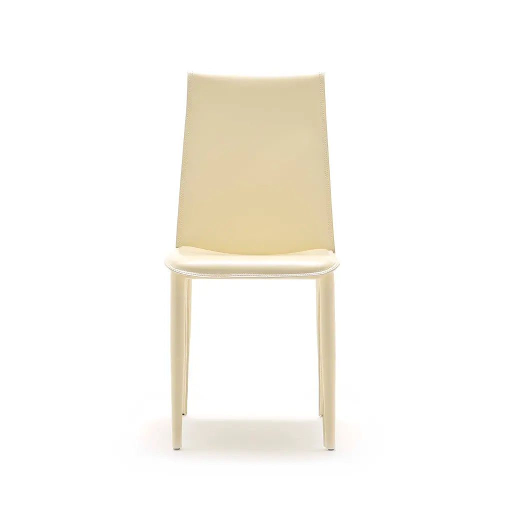 This high-backed armchair is completely covered in ivory-colored leather atop a tubular steel frame, and its metal seat pan is covered in black technical fabric. Its silhouette plays with contrasts of thinness and volume. A wide selection of additional colors and finishings are available, with the final price quoted on order.