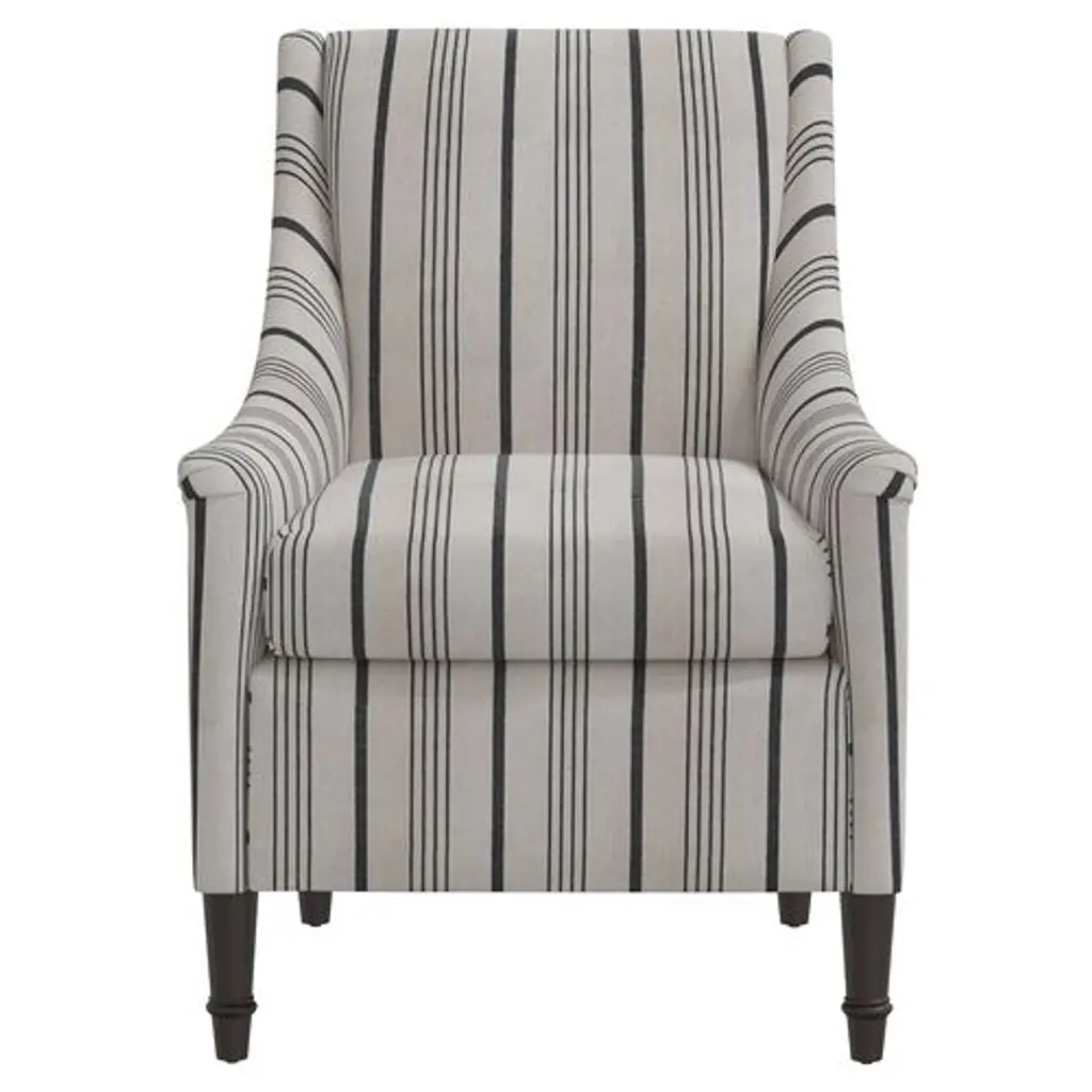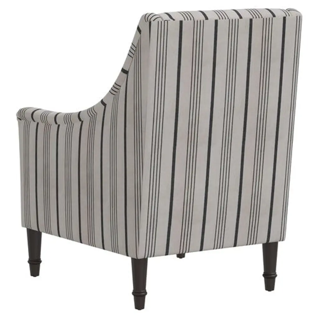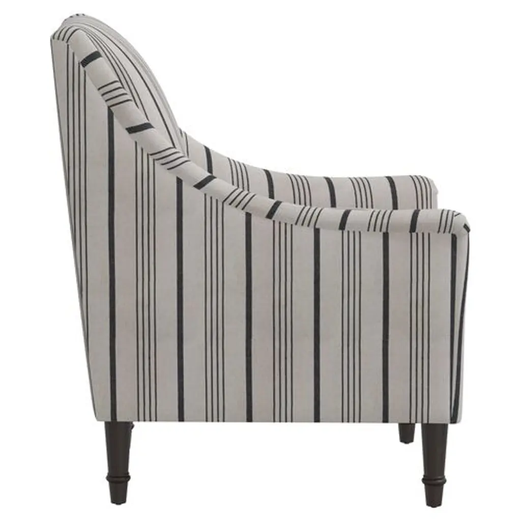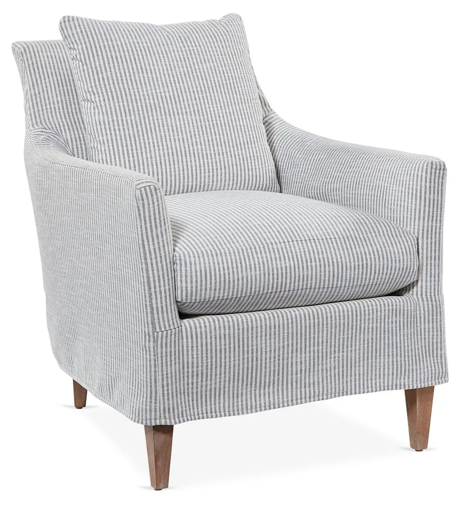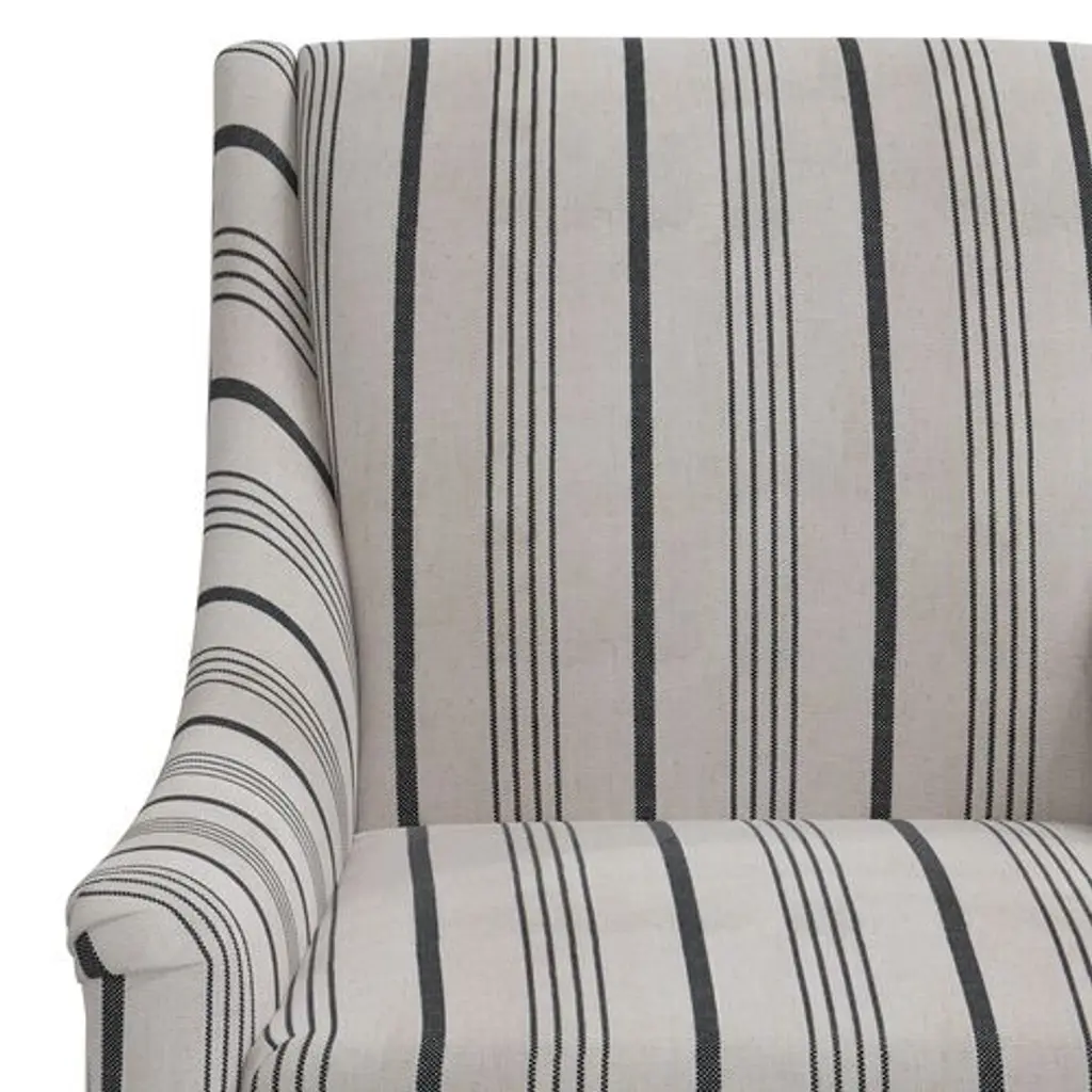 Exclusive to One Kings Lane: Made in the USA, this swoop-arm chair has a deep, generously cushioned seat, but its overall proportions enable it to fit easily into smaller spaces. The turned legs and tailored stripes provide timeless elegance.