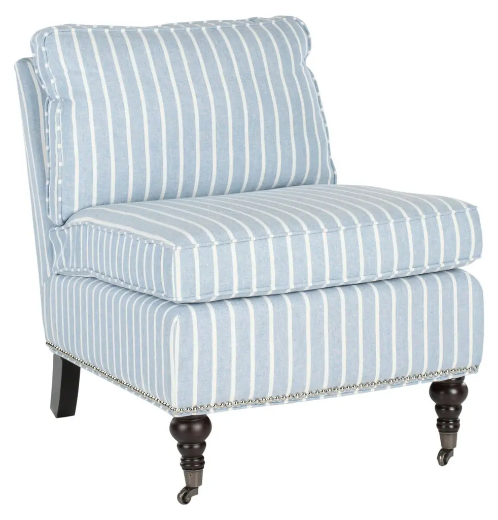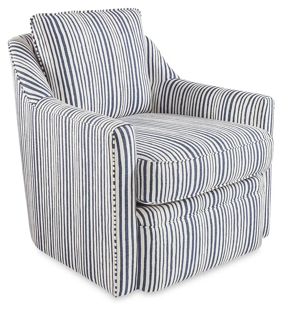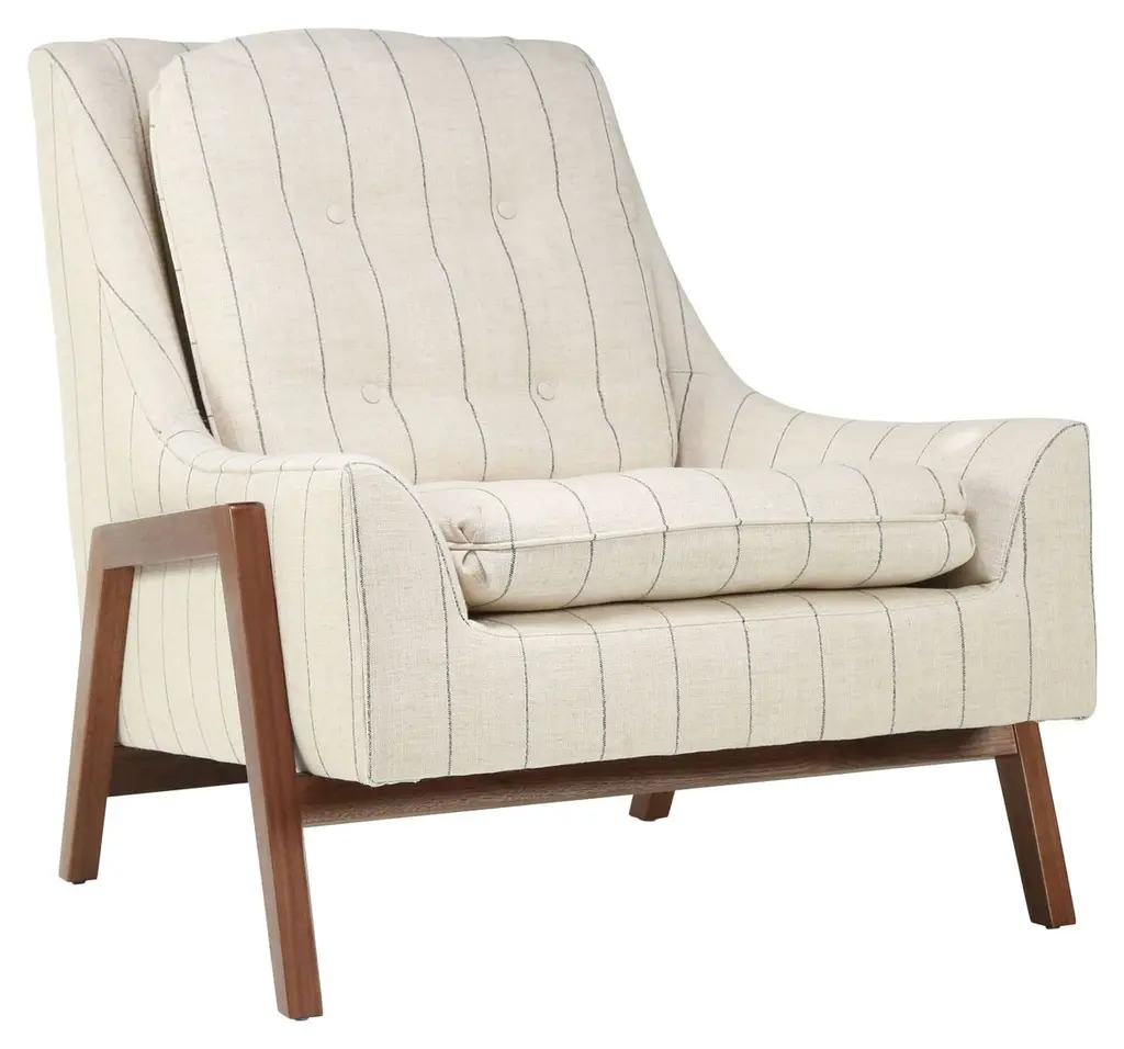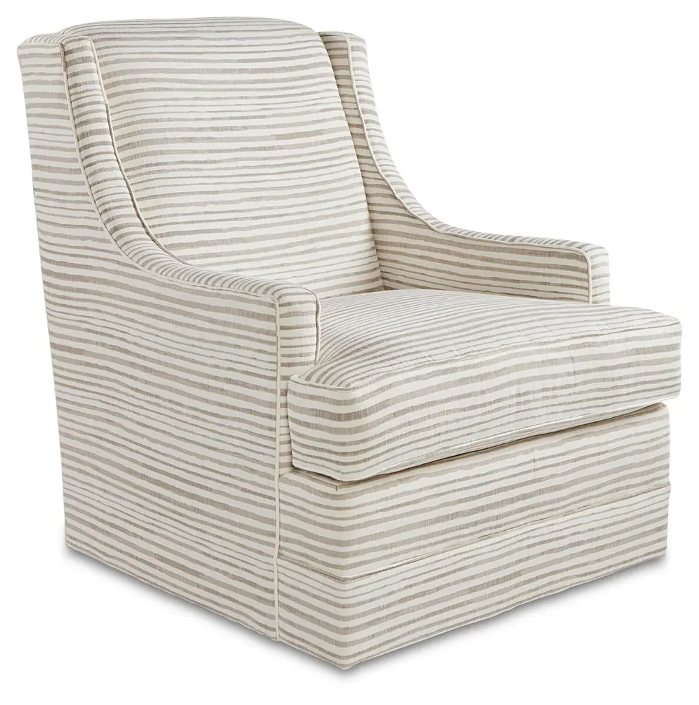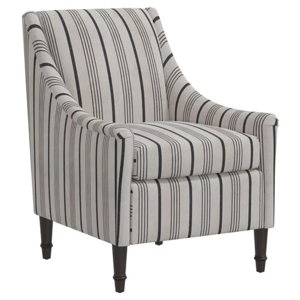 Exclusive to One Kings Lane: Made in the USA, this swoop-arm chair has a deep, generously cushioned seat, but its overall proportions enable it to fit easily into smaller spaces. The turned legs and tailored stripes provide timeless elegance.