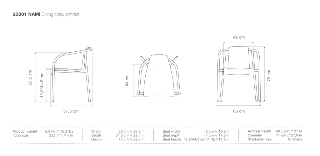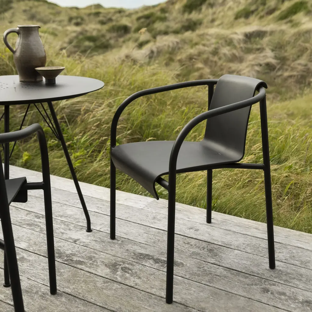 The NAMI Bistro set is the perfect addition to your outdoor living space. Constructed of recycled plastic and metal, the chairs are airy and comfortable. Made from powder-coated steel, the table is sturdy and durable.