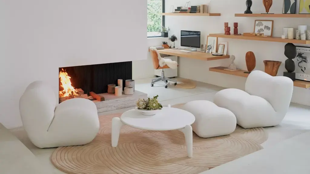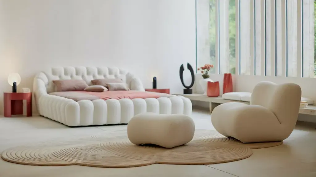 Ukrainian designer Andrii Kovalskyi has imagined the Hubba armchair as a perfect invitation to relax, with its elegantly uncluttered design and boldly rounded shapes seemingly draped in a single piece of fabric. The accompanying ossicle-shaped footstool enriches the experience of comfort while adding a playful dimension.