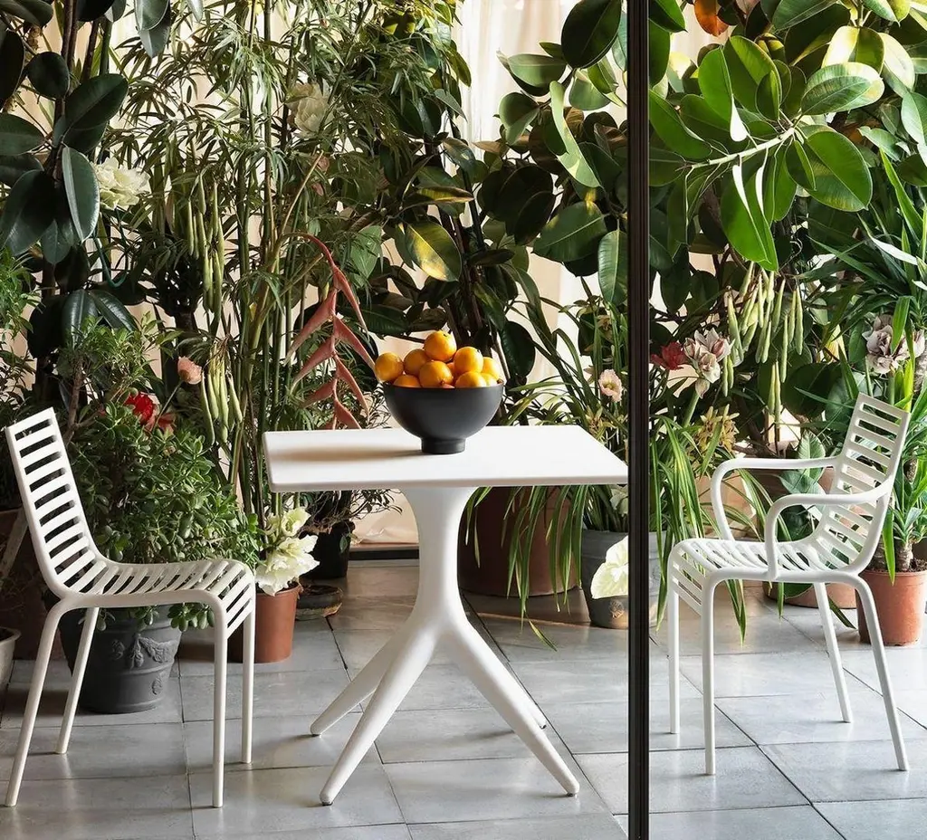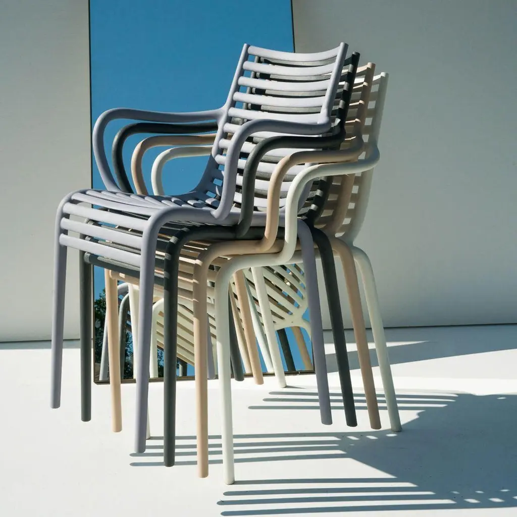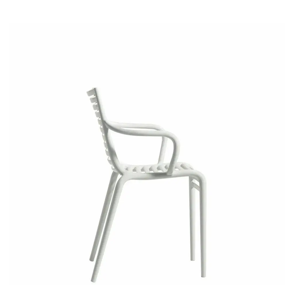 Even a classical image, as a railed armchair, in the hands of Philippe Starck, acquires a particular connotation. The sequence of horizontal elements which creates the seat and the back definetly takes on a strong chiaroscuro and accompanies the bending of the knees. Indoor/outdoor use.