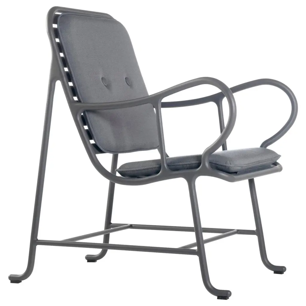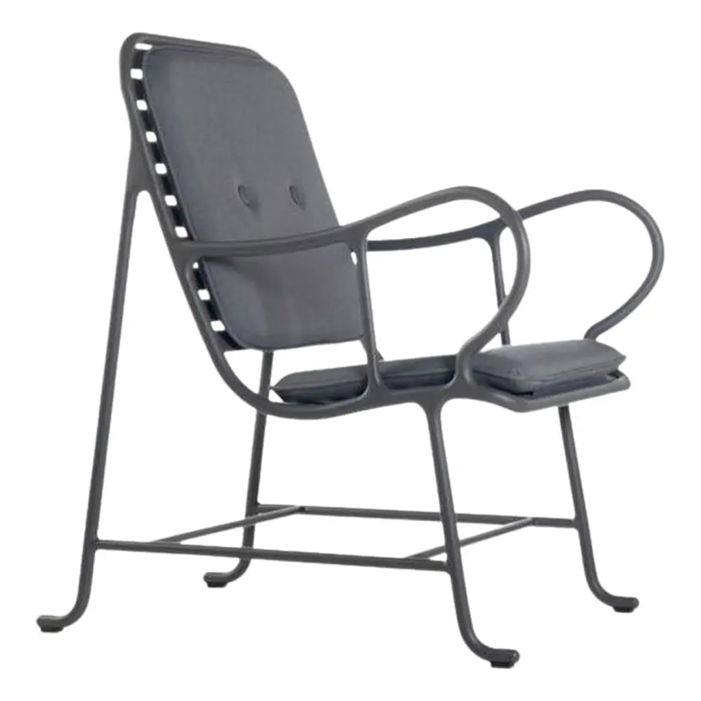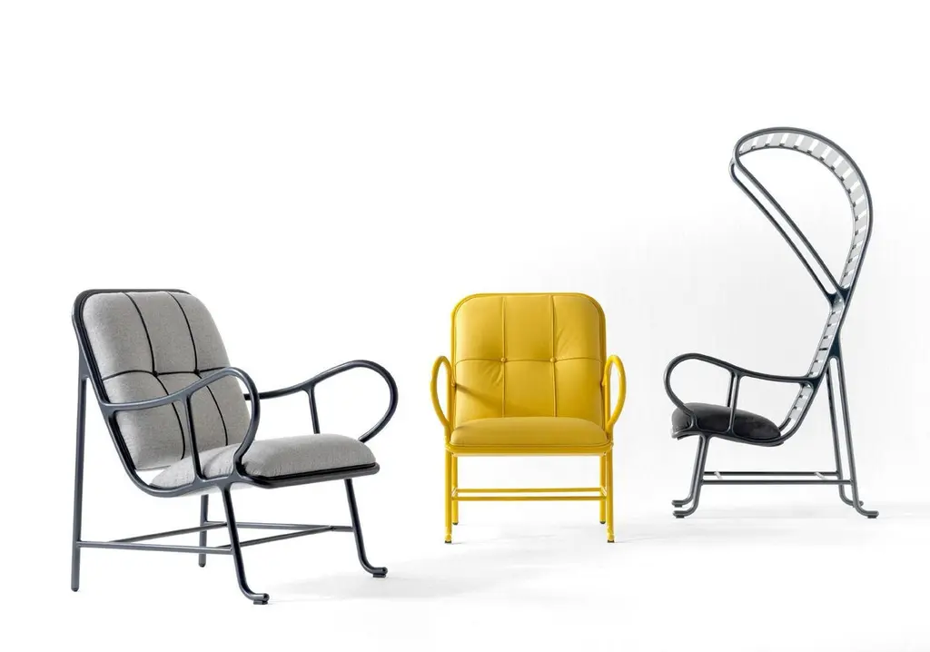 Indoor Gardenia armchair by Jaime Hayon Dimensions: D 89 x W 70 x H 100 cm Materials: structure in cast aluminum and laminates in extruded aluminum. Powder coating in Alesta Anodic Black or in high-gloss yellow (RAL 1005). Seat and backrest upholstered in different fabrics and leathers provided by BD. Piping in the same color as the structure.Also available outdoors.It has quality, personality, elegance and just the right amount of romanticism, and much versatility for the home as well as contract. The indoor collection includes an armchair and a sofa with a more refined image, which we present with new finishes and upholstery. The Gardenias Collection is the second largest collection by Jaime Hayon for BDIn 1972, a group of young architects and designers from Barcelona created BD with the aim of producing and marketing furniture and other objects for our projects, with complete creative freedom and with a criterion that has turned out to be quite different from the norm at companies in the sector, regarding both the shape and function.