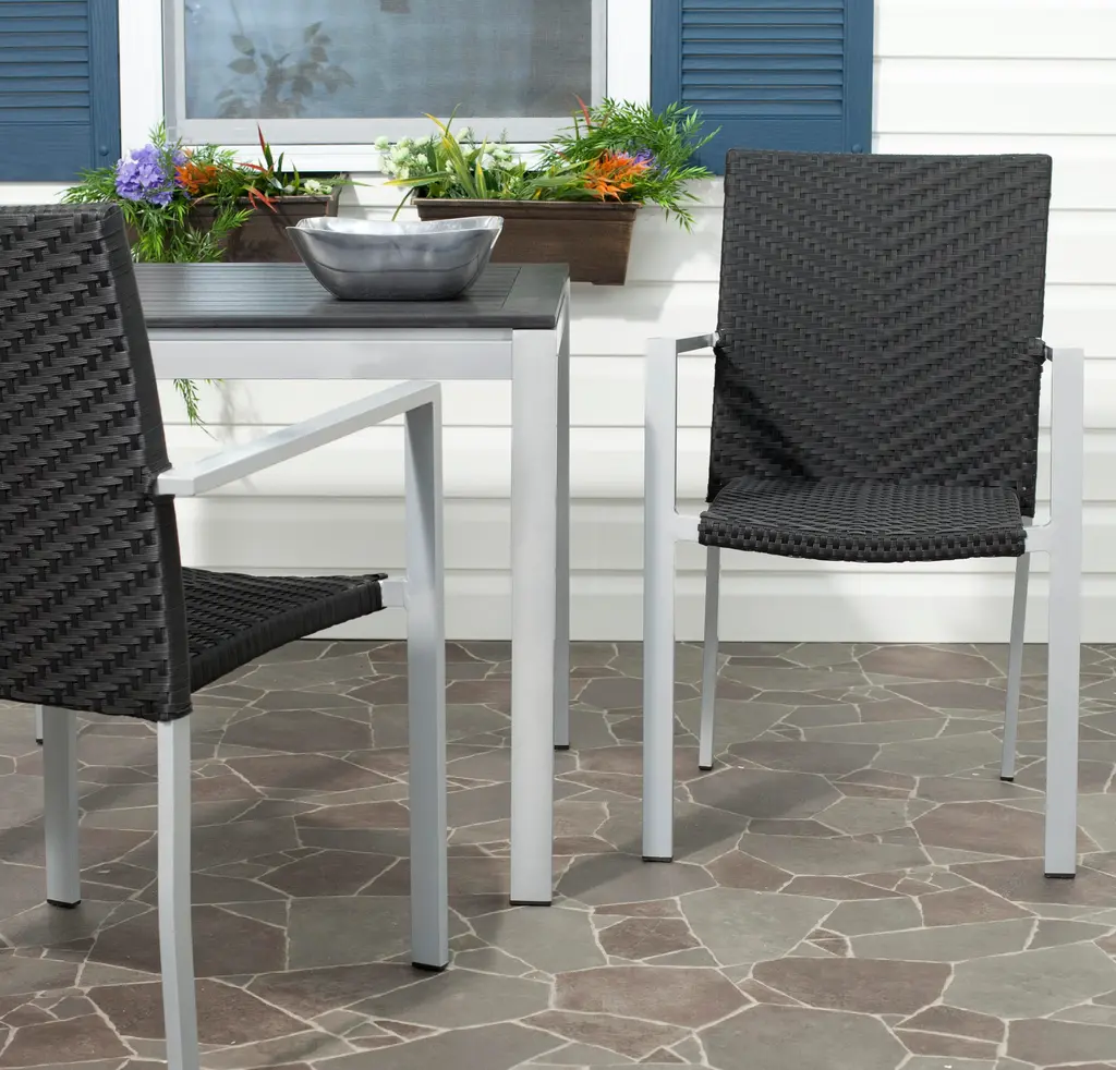 A perfect balance of design and utility, the indoor-outdoor stacking armchair by looks as chic for parties in the family room as it does on the patio. Crafted of easy-care black PE wicker with a aluminum frame, the transitional, weather resistant chair is sold in sets of two. Store outdoor furniture indoors or cover well when not in use. Remove wooden furniture from standing water. Dust regularly with small brush or vacuum. Spills should be taken care of immediately before they harden or stain with a slightly dampened sponge.