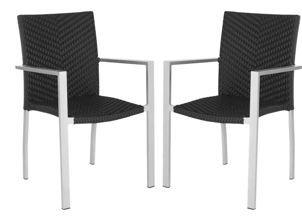 A modern iteration of the fan back chair, the grey indoor-outdoor stacking armchair by is designed for parties in chic contemporary homes. Guests will love this comfortable chair, crafted of PE wicker and aluminum for enduring beauty, weather-resistance and easy care.is sold in sets of two. Store outdoor furniture indoors or cover well when not in use. Remove wooden furniture from standing water. Dust regularly with small brush or vacuum. Spills should be taken care of immediately before they harden or stain with a slightly dampened sponge.