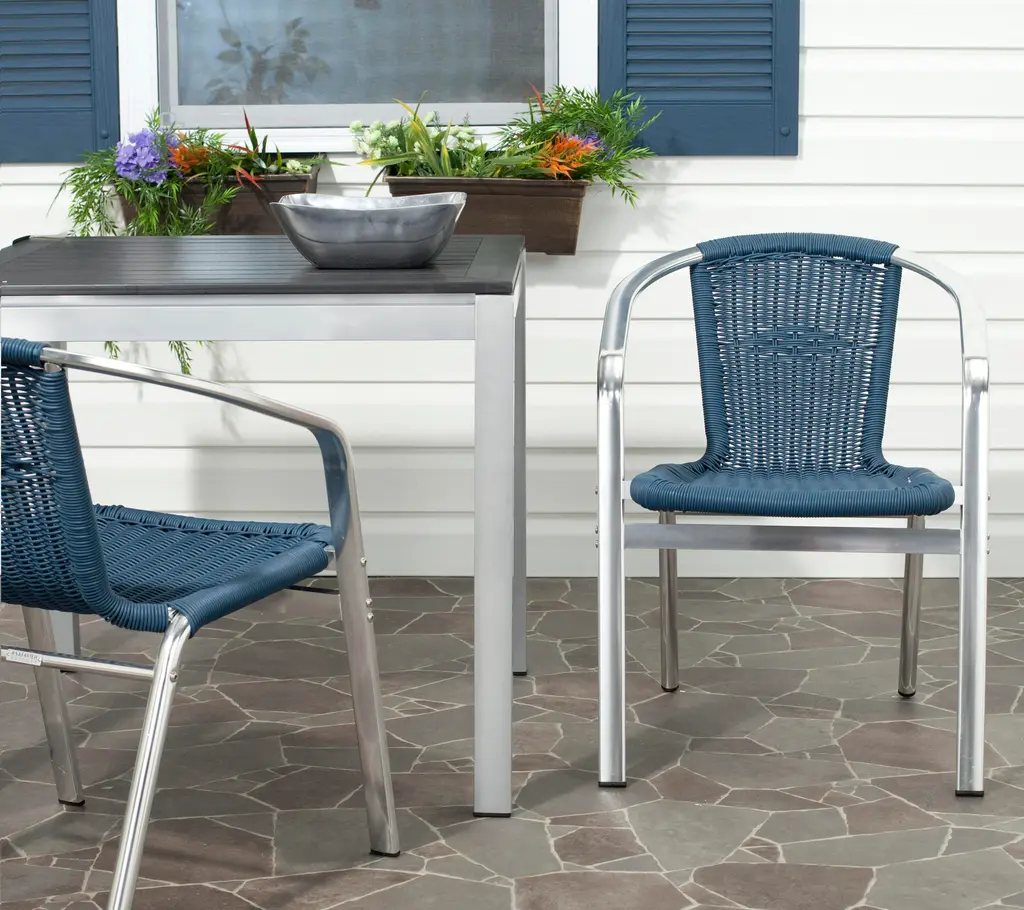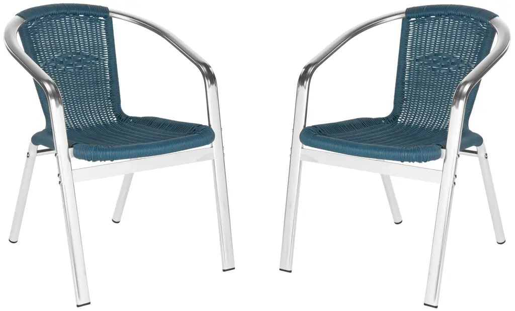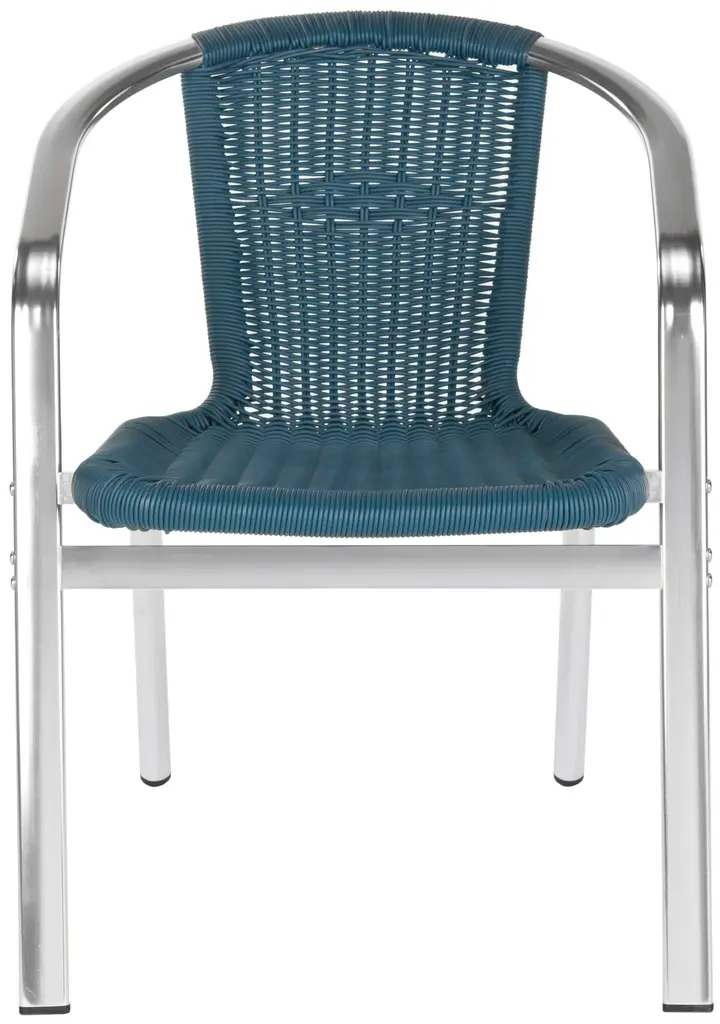 A modern iteration of the fan back chair, the dark teal indoor-outdoor stacking armchair by is designed for parties in chic contemporary homes. Guests will love this comfortable chair, crafted of PE wicker and aluminum for enduring beauty, weather-resistance and easy care.is sold in sets of two. Store outdoor furniture indoors or cover well when not in use. Remove wooden furniture from standing water. Dust regularly with small brush or vacuum. Spills should be taken care of immediately before they harden or stain with a slightly dampened sponge.