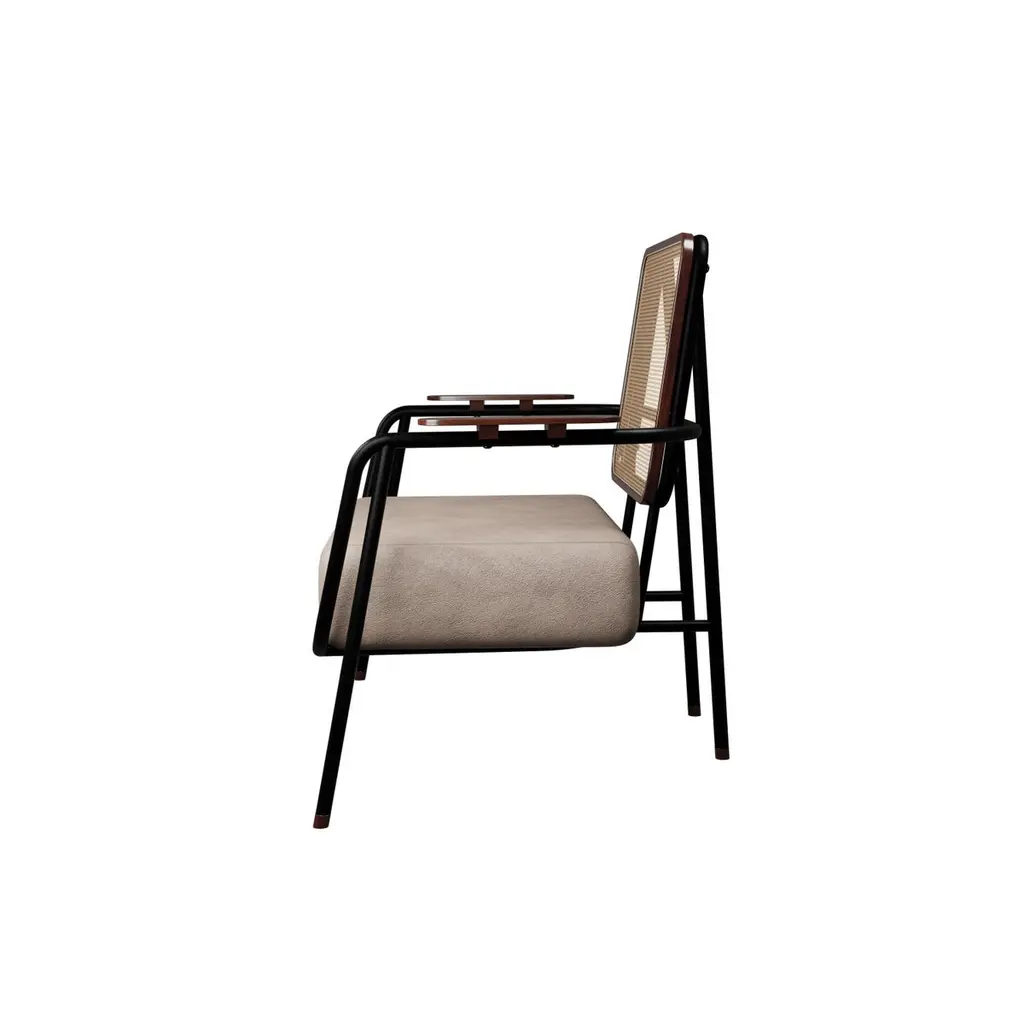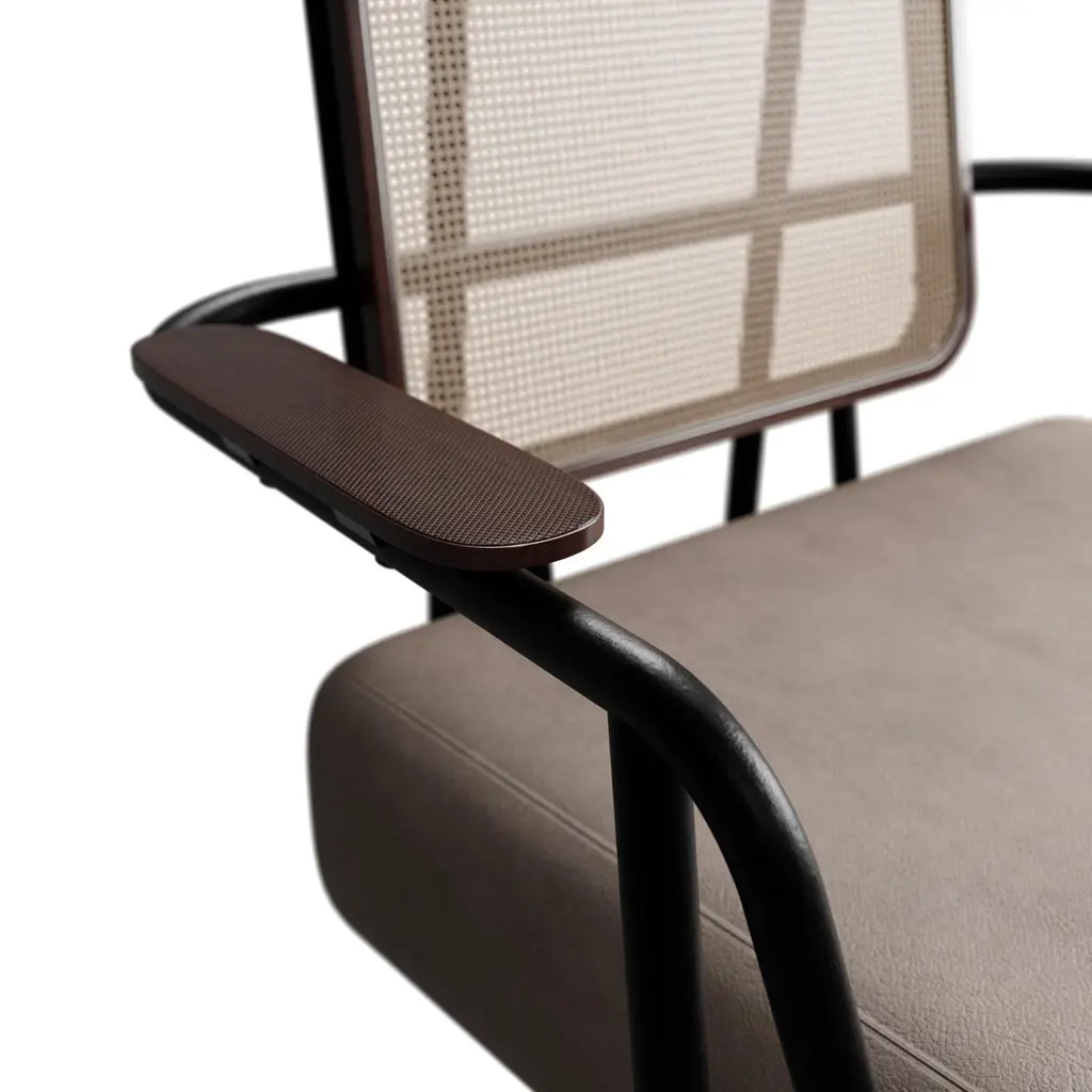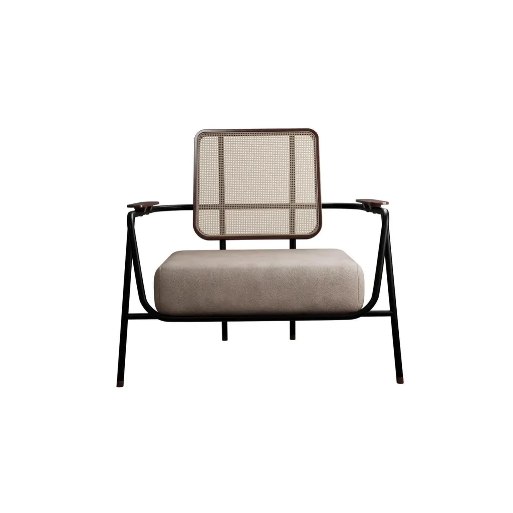 Murmurio's armchair with arm DUV sturdy iron structure provides a solid foundation, while the intricately woven rattan backrest, supported by an ashwood frame, adds a touch of natural beauty. The seat is upholstered in genuine leather, offering both comfort and a luxurious aesthetic.Each chair is a labor of love, crafted by skilled artisans who pay meticulous attention to detail. From the precise welding of the iron frame to the delicate weaving of the rattan, each component is a testament to the dedication and expertise of Murmurio.