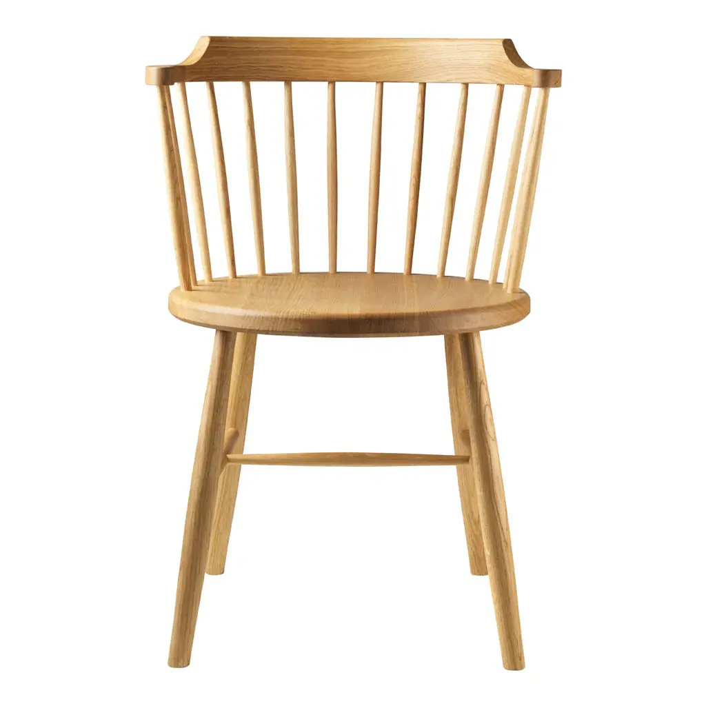 The J18 chair was designed by Borge Mogensen in 1945. Like Mogensen's other well-known FDB chairs, this model is distinguished by its clean, Nordic design with no decoration or unnecessary trimmings, and where the focus is on function and simplicity. The comfortable chair was inspired by the old eighteenth-century English Windsor chairs. The solid backrest continues into the armrests, which fit under most tabletops. The comfortable, bowl-shaped wooden seat slopes gently backwards. The J18 is available in both solid beech and oak. The beech chair is available in several beautiful colours, while the oak chair is oiled. Cushions can be purchased separately.