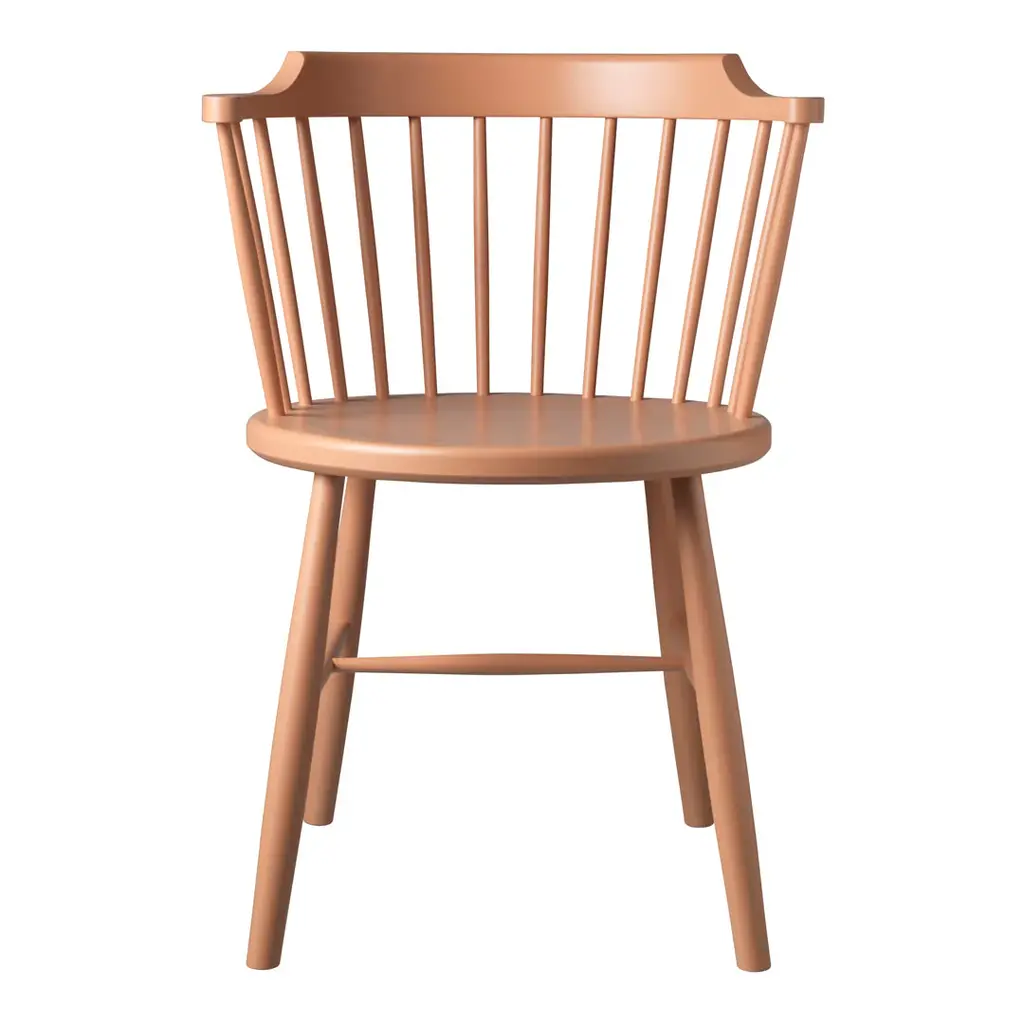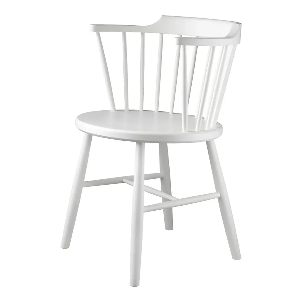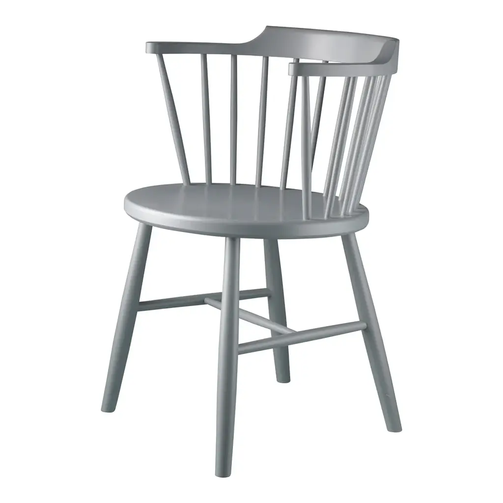 The J18 chair was designed by Borge Mogensen in 1945. Like Mogensen’s other well-known FDB chairs, this model is distinguished by its clean, Nordic design with no decoration or unnecessary trimmings, and where the focus is on function and simplicity. The comfortable chair was inspired by the old eighteenth-century English Windsor chairs. The solid backrest continues into the armrests, which fit under most tabletops. The comfortable, bowl-shaped wooden seat slopes gently backwards. The J18 is available in both solid beech and oak. The beech chair is available in several beautiful colours, while the oak chair is oiled. Cushions can be purchased separately.