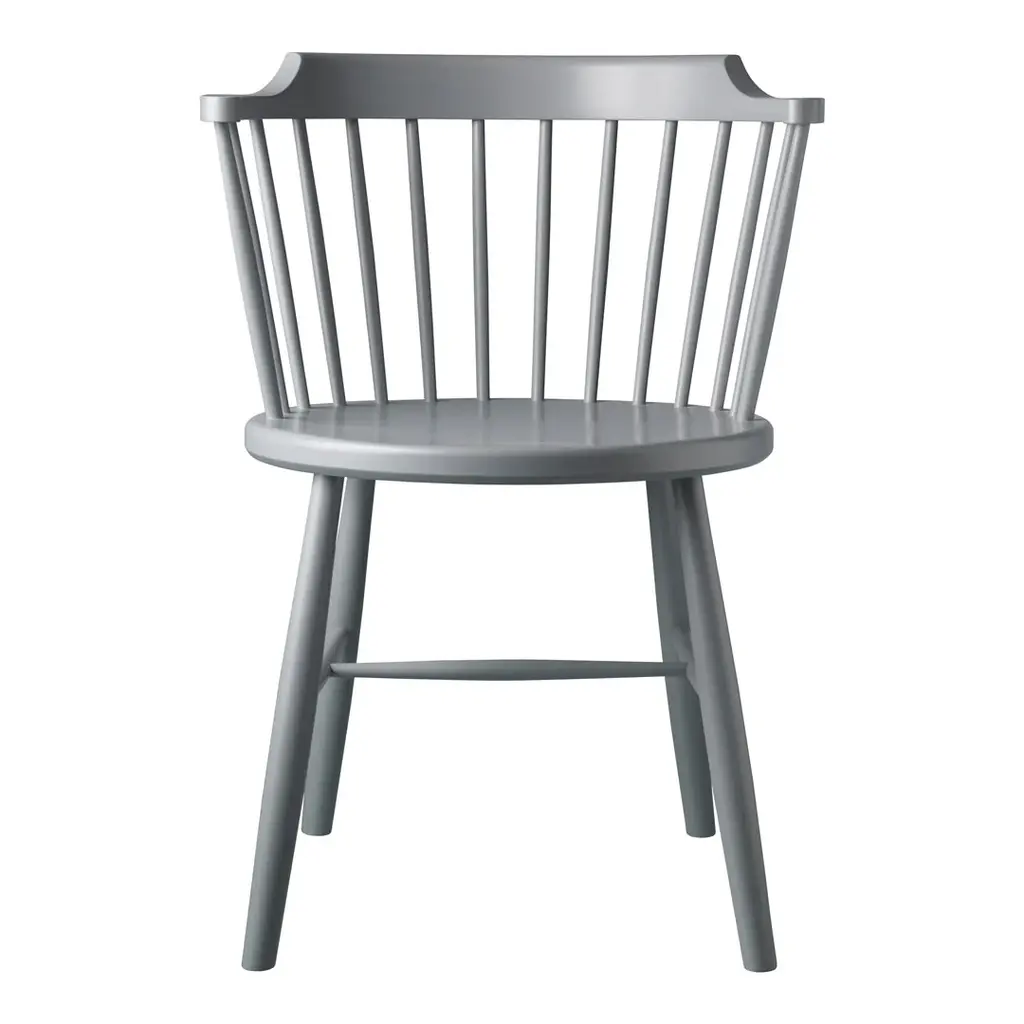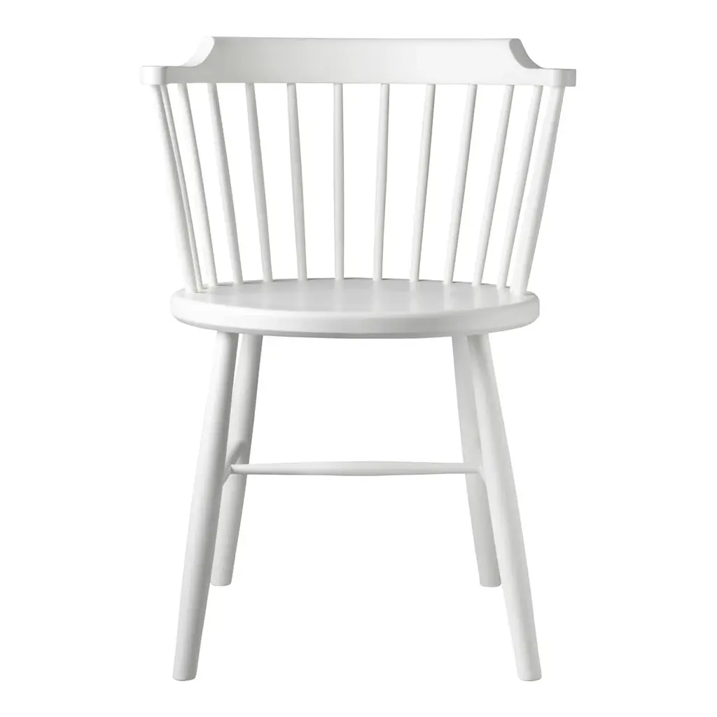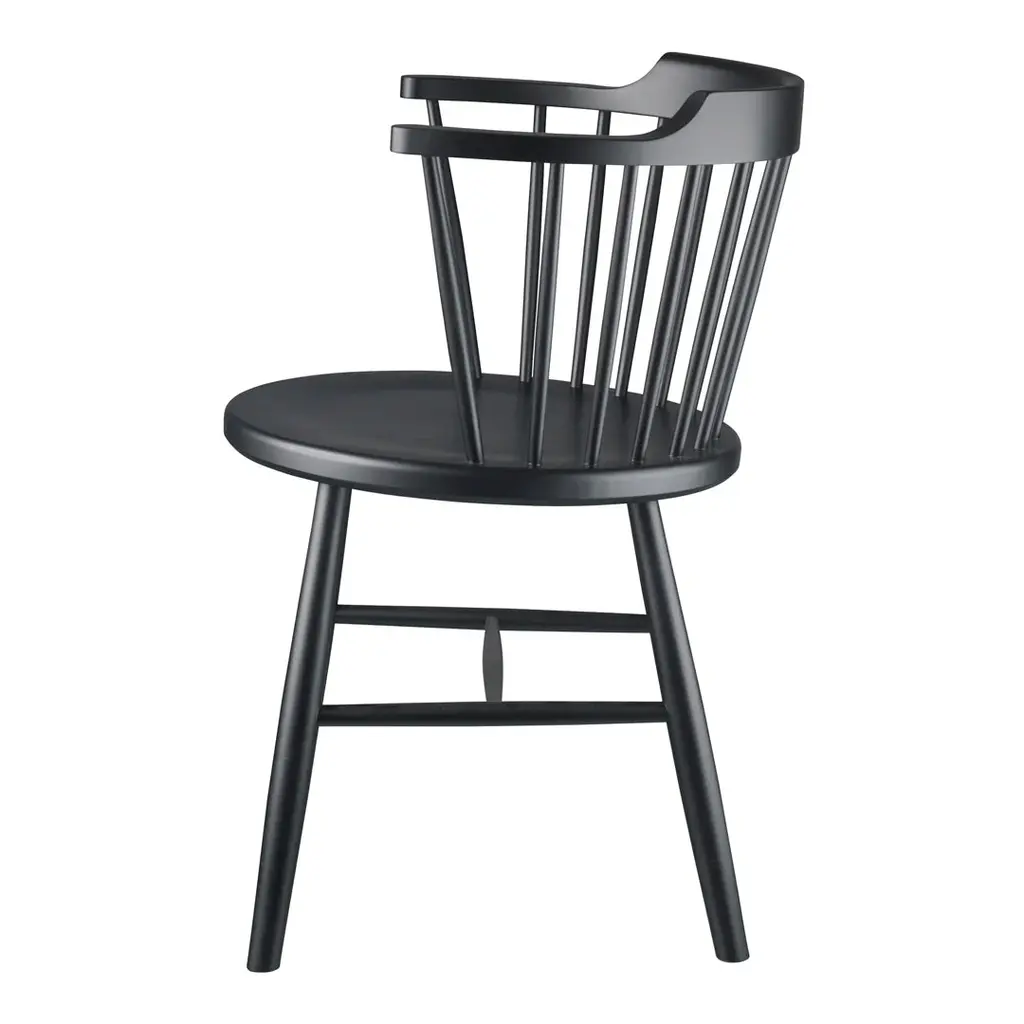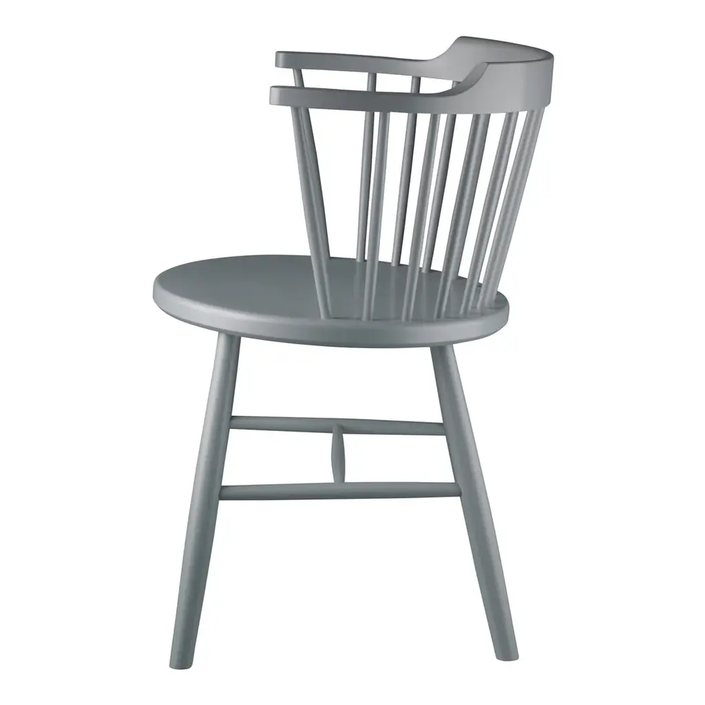 The J18 chair was designed by Borge Mogensen in 1945. Like Mogensen’s other well-known FDB chairs, this model is distinguished by its clean, Nordic design with no decoration or unnecessary trimmings, and where the focus is on function and simplicity. The comfortable chair was inspired by the old eighteenth-century English Windsor chairs. The solid backrest continues into the armrests, which fit under most tabletops. The comfortable, bowl-shaped wooden seat slopes gently backwards. The J18 is available in both solid beech and oak. The beech chair is available in several beautiful colours, while the oak chair is oiled. Cushions can be purchased separately.
