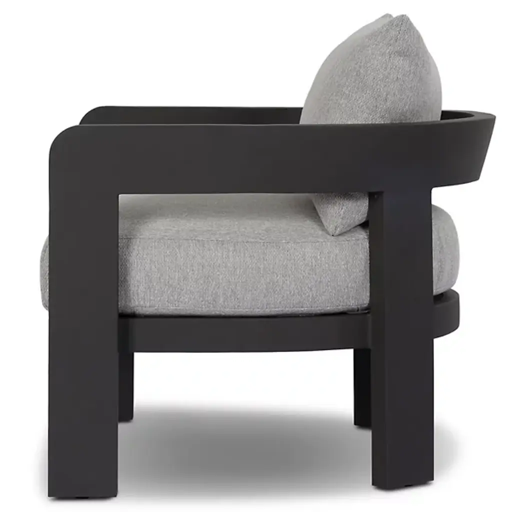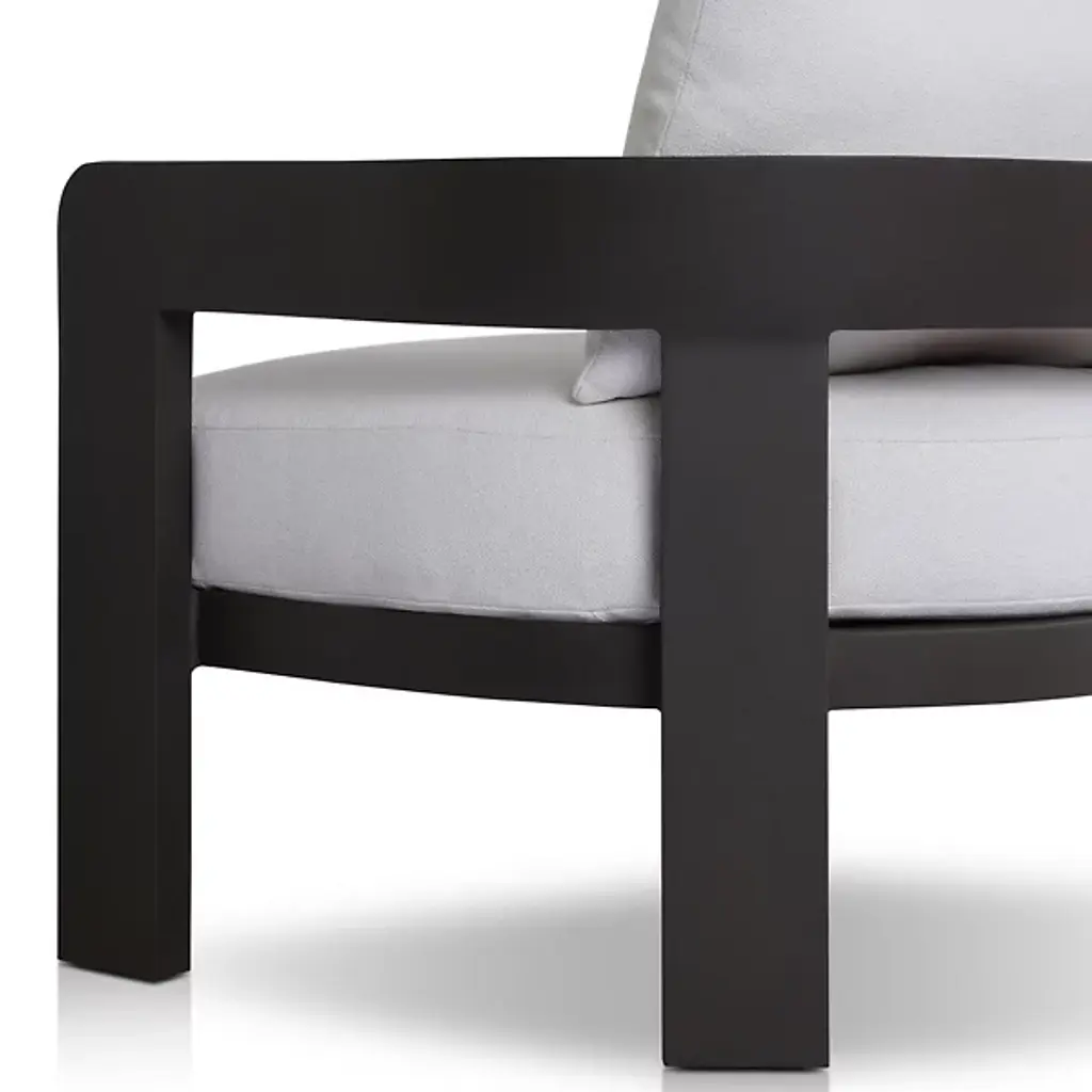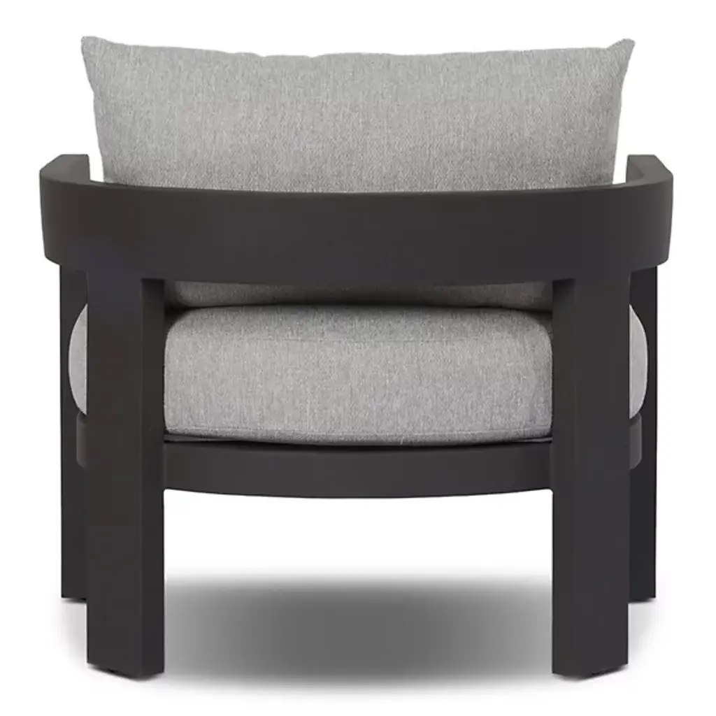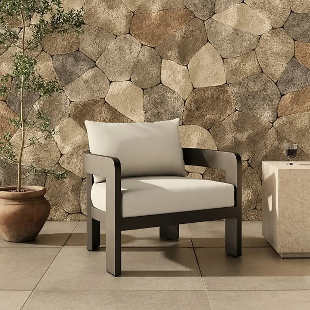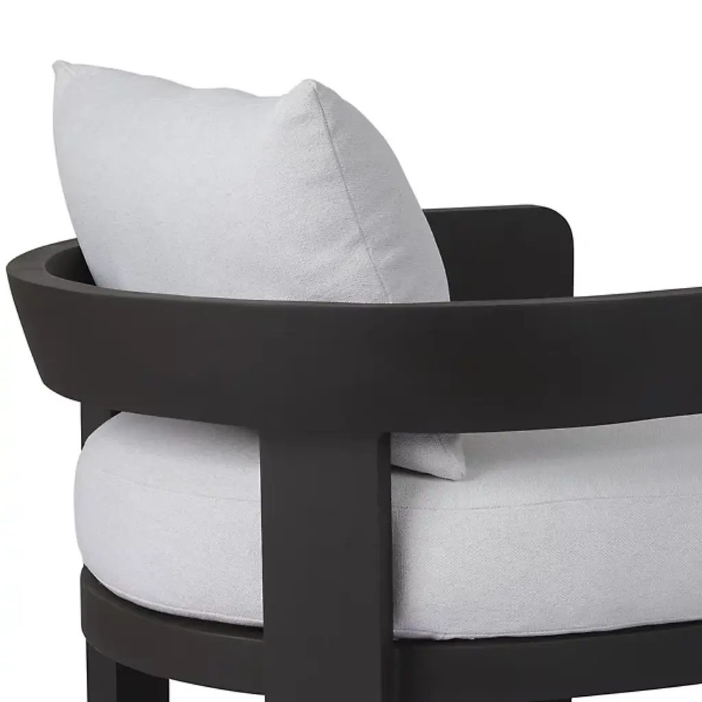 The Jackson Outdoor Armchair from Four Hands brings indoor comfort to outdoor spaces. Polypropylene fabric covers high-density foam and fiber batting, while aluminum framing ensures stability. The barrel back design hugs the body, offering support through curved lines. The foam core maintains its shape, while the metal base anchors the piece firmly. Each component meets the demands of outdoor use, though a protective cover keeps this chair pristine when not in use.