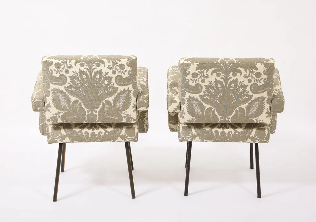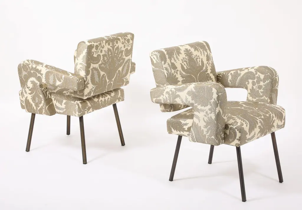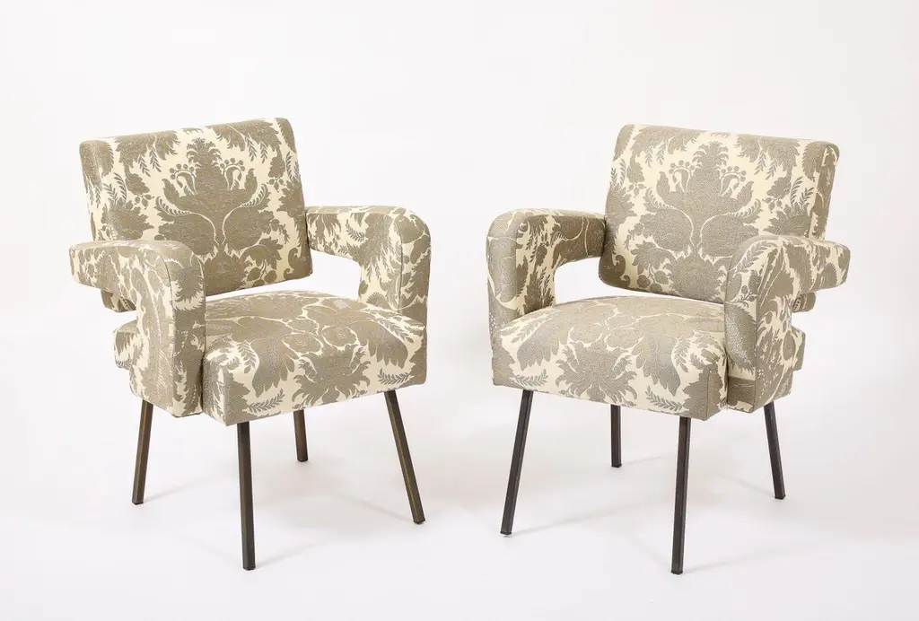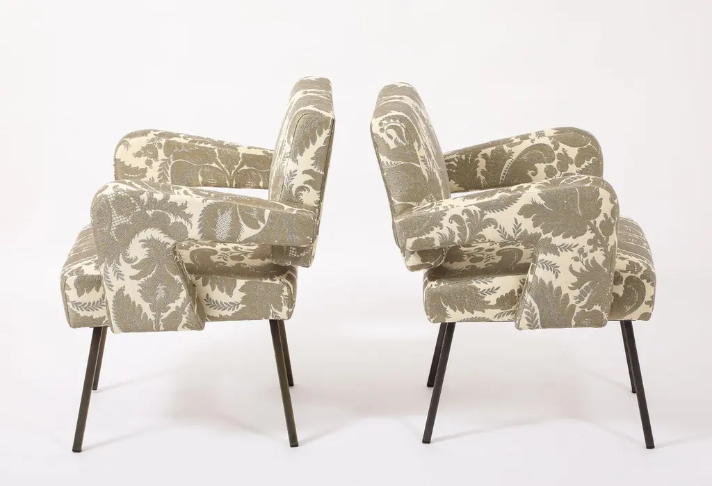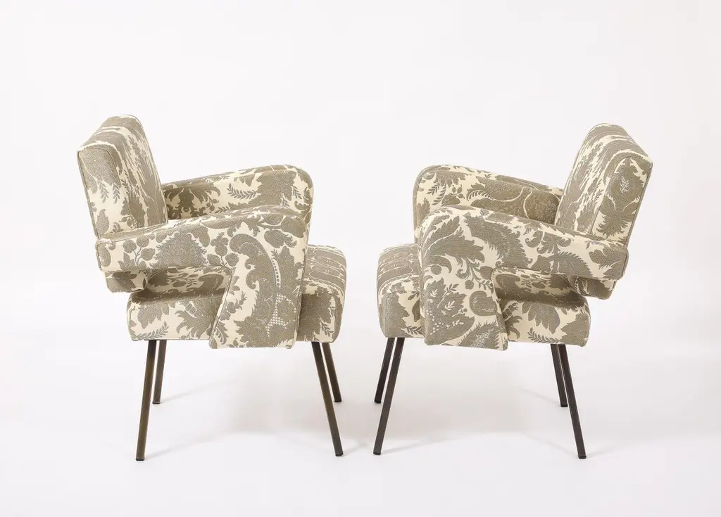 Jacques Adnet Armchairs with floating backs, freshly upholstered in made-to-order Pierre Frey embroidered fabric.Price Per ChairFour are available in this upholstery.