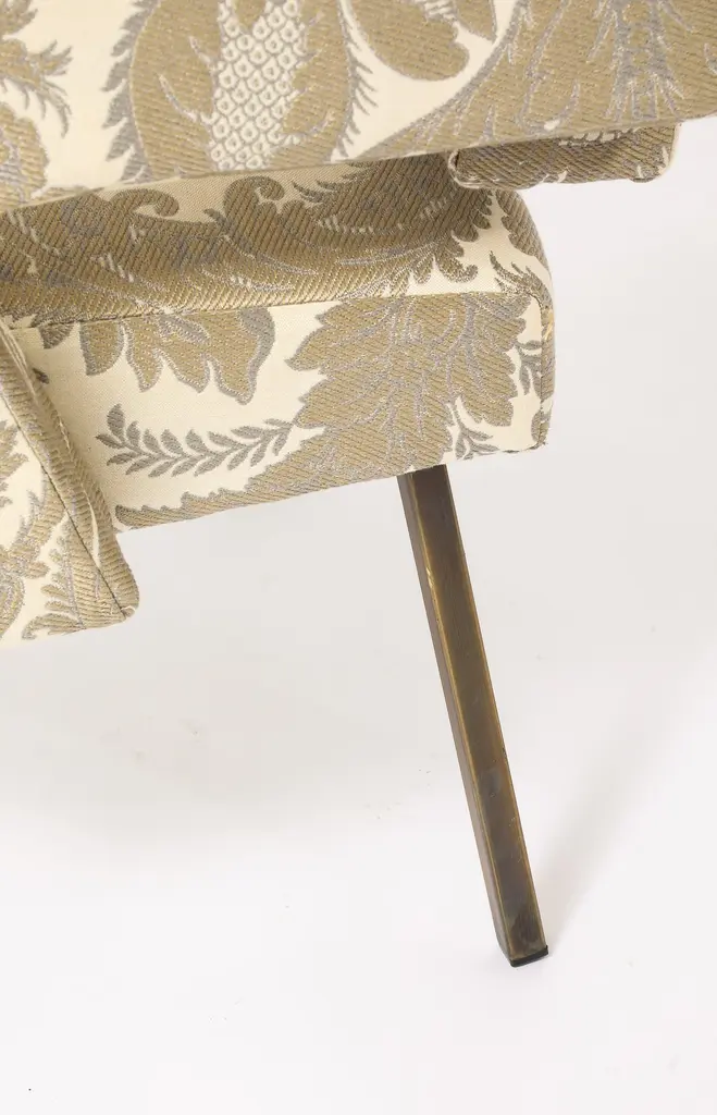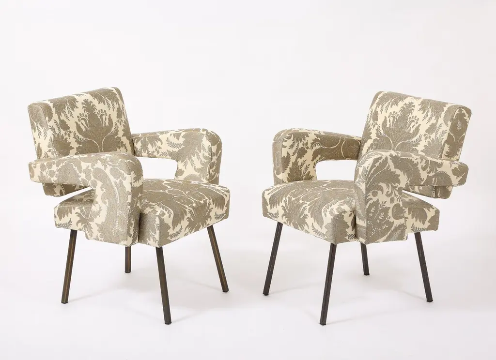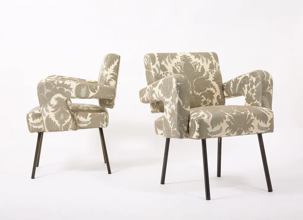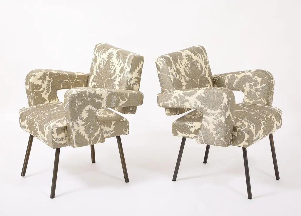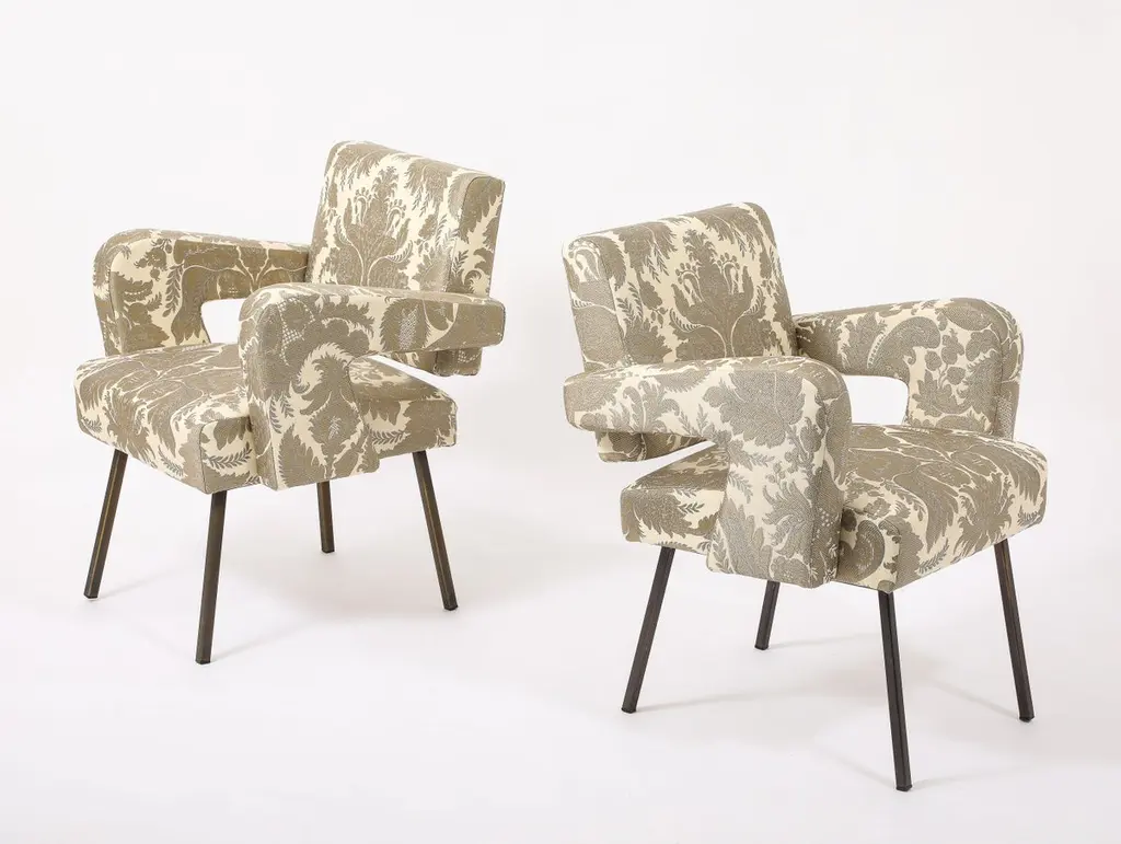 Jacques Adnet Armchairs with floating backs, freshly upholstered in made-to-order Pierre Frey embroidered fabric.Price Per ChairFour are available in this upholstery.
