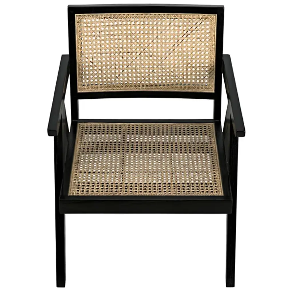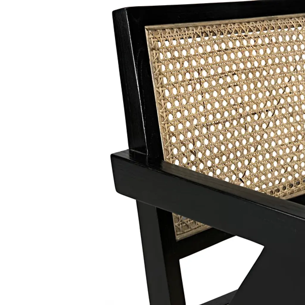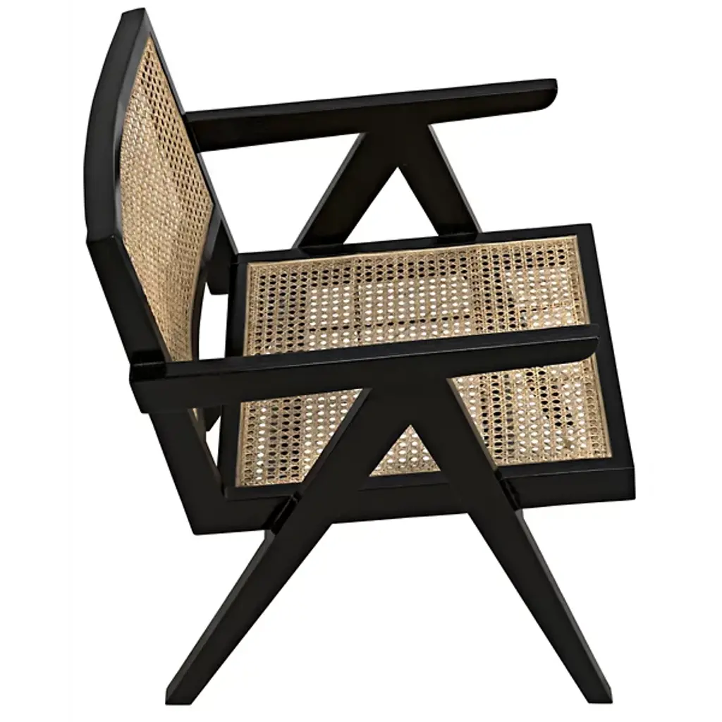 The James Relax Armchair by Noir transforms interiors with a stately, rustic-modern flair. Ascending from a trestle-style angular base in Sungkai/Mindi wood, it uses a woven cane seat and back to create a touch of welcome visual intricacy, the lacy cane construction contrasting well with the sleek wood around it. The seat incorporates armrests that act as flat planes, extending out from the angled back in a clever contrast, while the seat offers a slight incline for added vintage-style comfort.