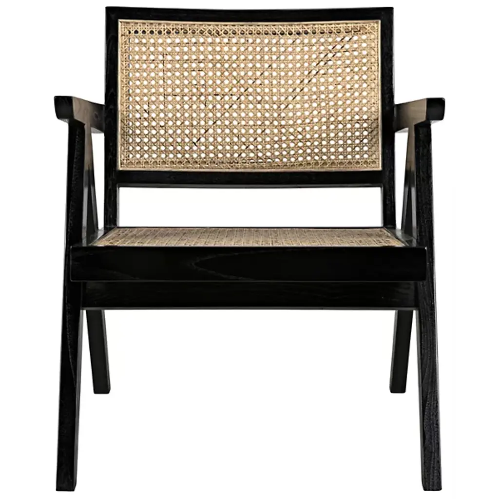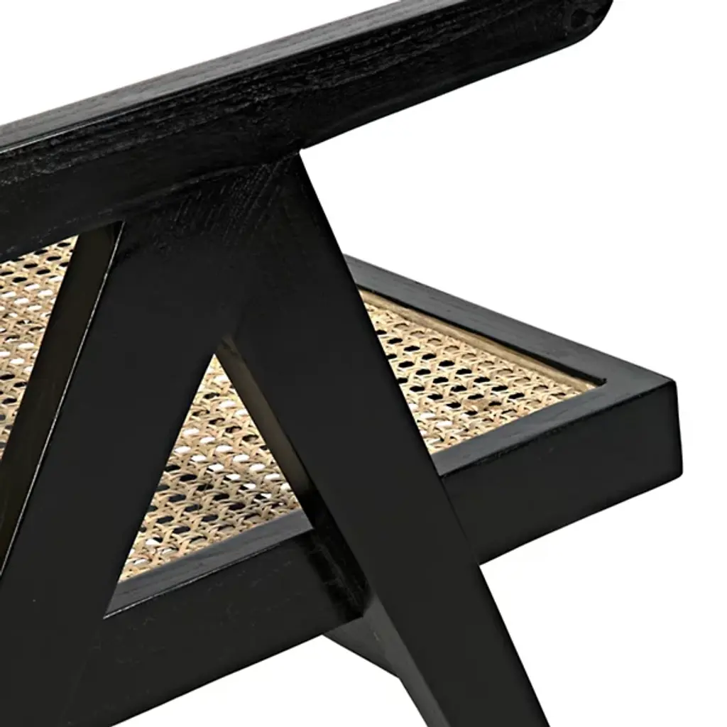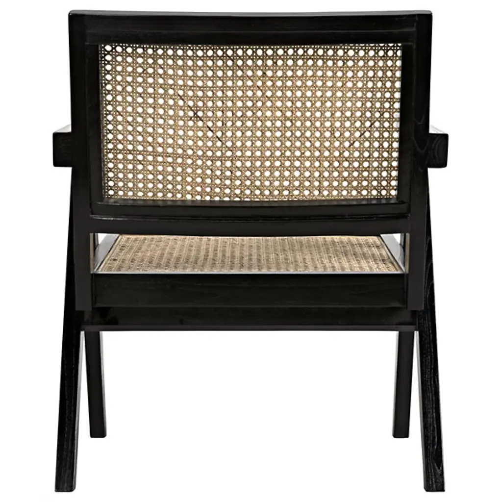 The James Relax Armchair by Noir transforms interiors with a stately, rustic-modern flair. Ascending from a trestle-style angular base in Sungkai/Mindi wood, it uses a woven cane seat and back to create a touch of welcome visual intricacy, the lacy cane construction contrasting well with the sleek wood around it. The seat incorporates armrests that act as flat planes, extending out from the angled back in a clever contrast, while the seat offers a slight incline for added vintage-style comfort.