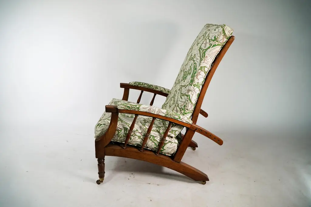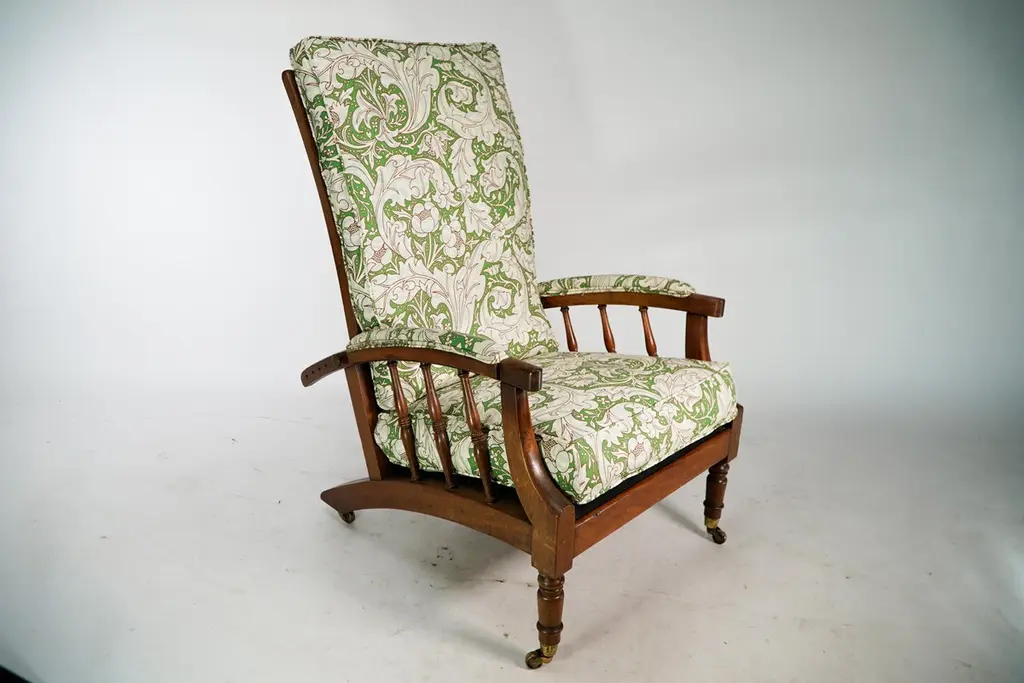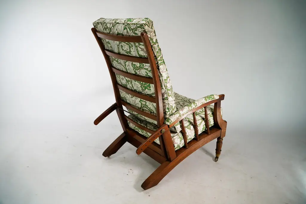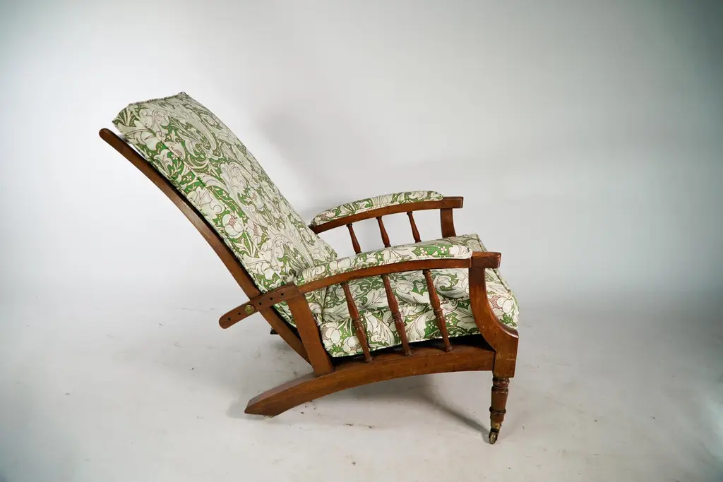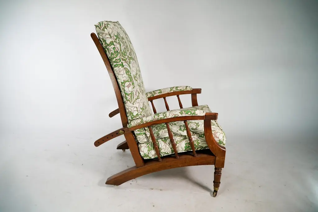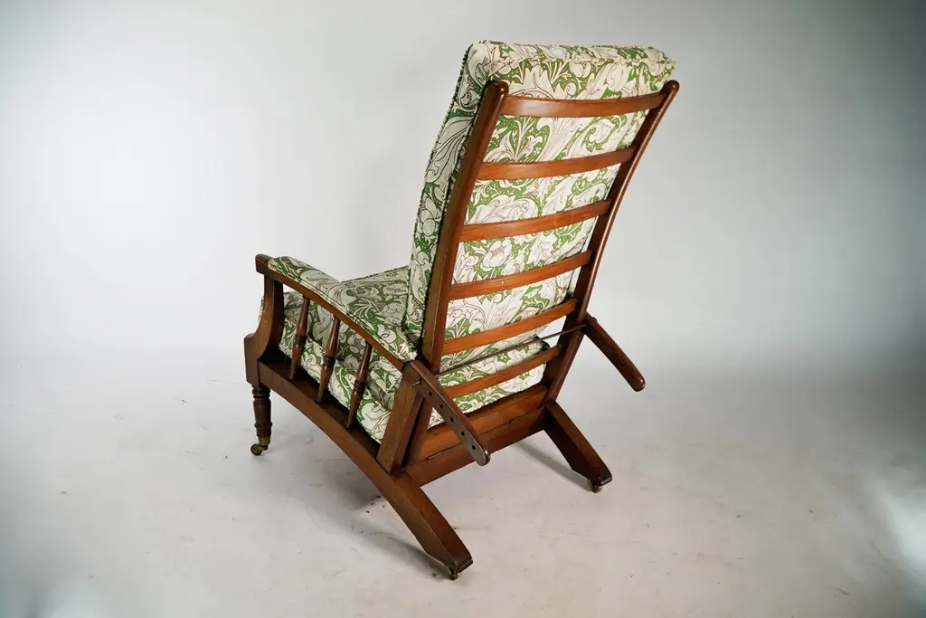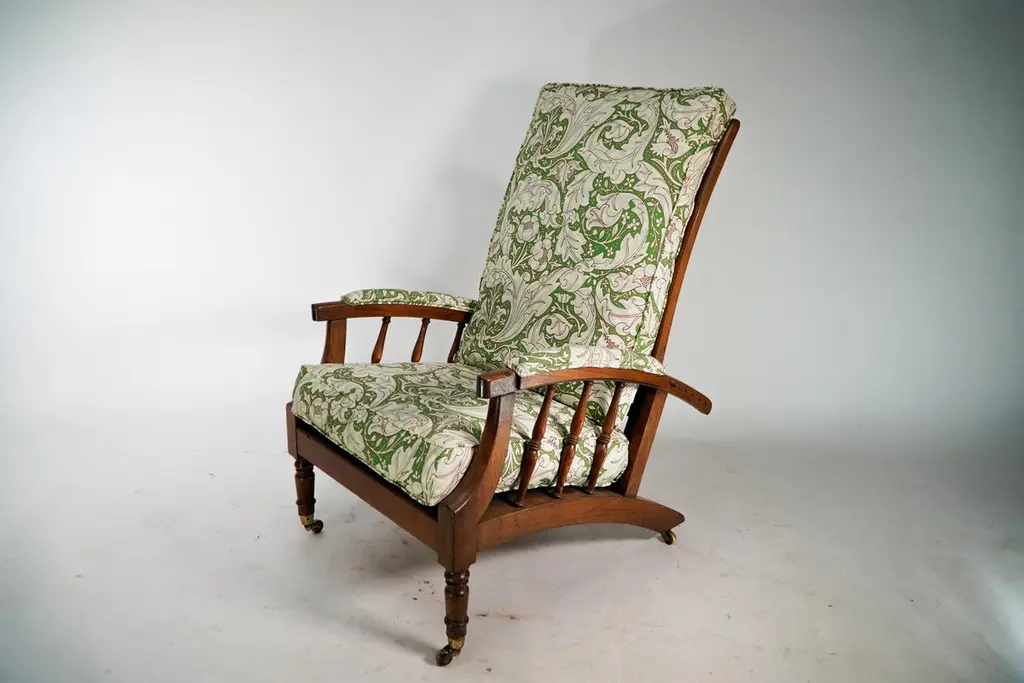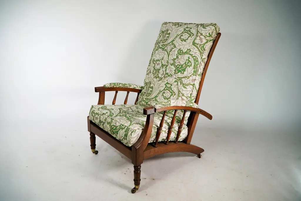 Jas Shoolbred.In the style of Morris and Co, after a design by Phillip Webb.A pair of Aesthetic Movement adjustable reclining armchairs. Professionally reupholstered in a Morris and Co style floral fabric.James Shoolbred & Co also known as Jas Shoolbred began in the 1820s as a draper’s shop, supplying textiles to the furniture trade with premises in Tottenham Court Road, London. In the 1860s, Jas Shoolbred began designing and making high-quality antique furniture. They were so successful that by the 1890’s, they had workshops, showrooms, and other premises in London at:7-31 & 36 Grafton Street2, 3 & 4 Midford Place (cabinet making)7 & 8 Midford Place (decorating department)Queen’s Buildings, Tottenham Court Road (blind factory)6 Torrington Place (upholstery); 260-266 Euston Road (cabinet making)79-97 Huntley Street (carpet planning & warehouse)32-39, 41 & 43 University Street (linen drapers)16-23 Upper Gower Street (stables & factory)150 Tottenham Court Road (woollen drapers)161 & 162 Tottenham Court Road (linen drapers)32-39, 41 & 43 Tottenham Court Road (upholstery & cabinet retailers) They employed professional designers such as Owen W. Cavis and H. W. Batley, the latter who had worked alongside E W Godwin and specialized in Japanese, Aesthetic style furniture. Jas Shoolbred was granted a Royal warrant by the mid-1880s, and their furniture was some of the best quality available in the late Victorian period.Measures: Height 39.5 inchesWidth 25 inchesDepth from the front leg to the back leg is 30 inches.