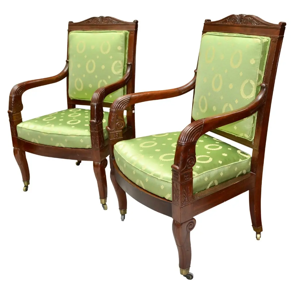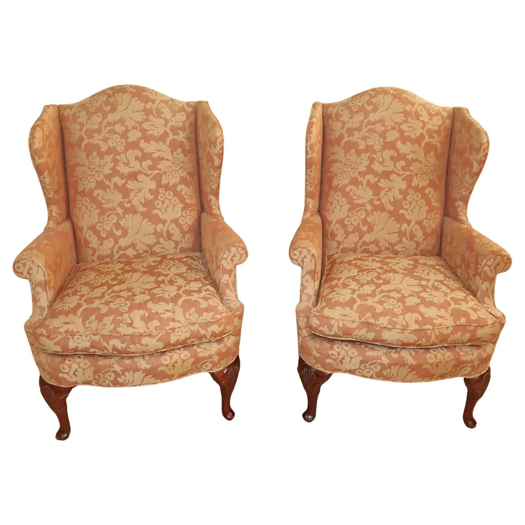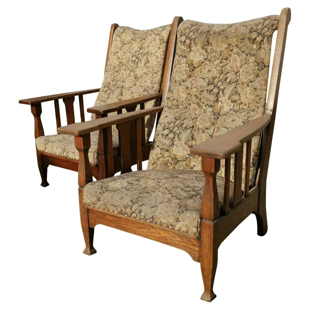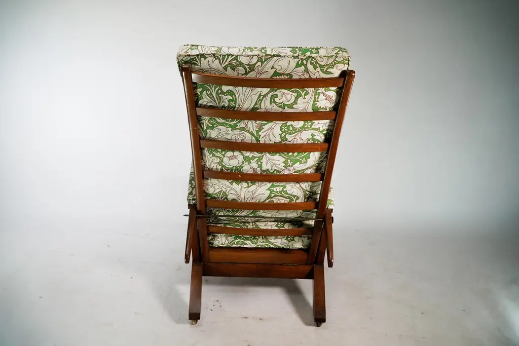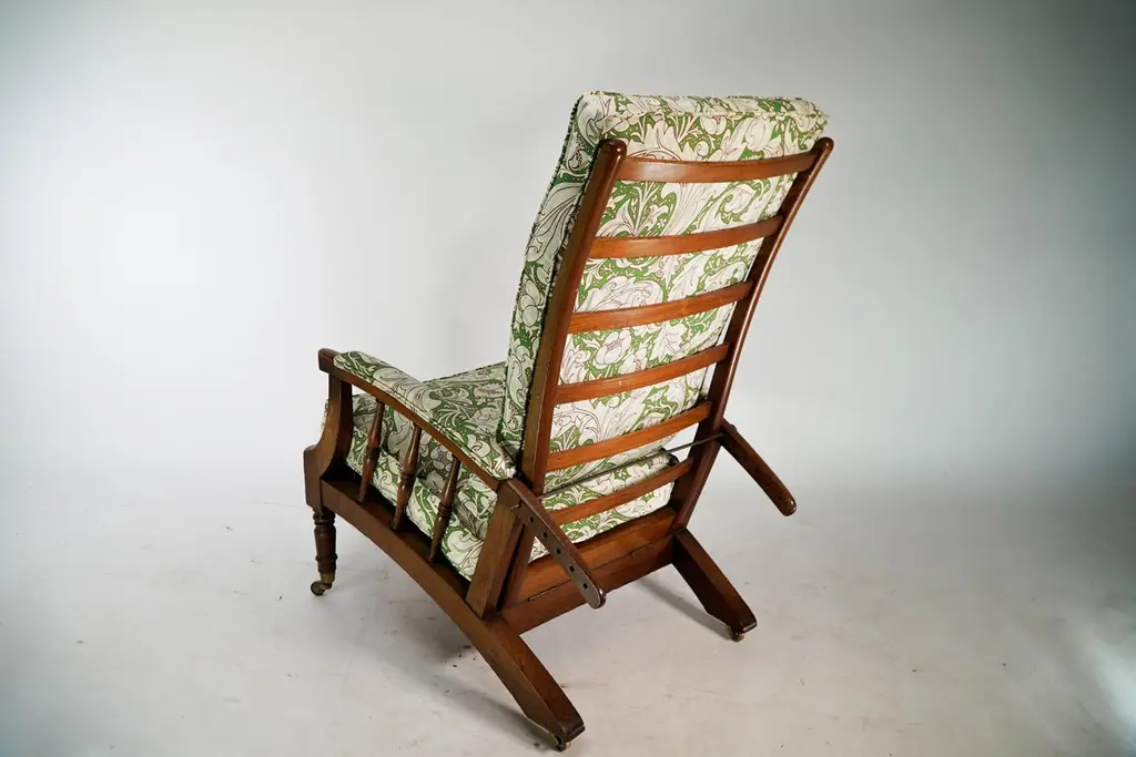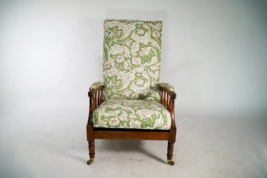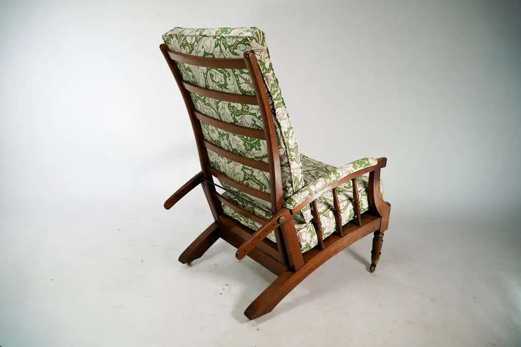 Jas Shoolbred.In the style of Morris and Co, after a design by Phillip Webb.A pair of Aesthetic Movement adjustable reclining armchairs. Professionally reupholstered in a Morris and Co style floral fabric.James Shoolbred & Co also known as Jas Shoolbred began in the 1820s as a draper’s shop, supplying textiles to the furniture trade with premises in Tottenham Court Road, London. In the 1860s, Jas Shoolbred began designing and making high-quality antique furniture. They were so successful that by the 1890’s, they had workshops, showrooms, and other premises in London at:7-31 & 36 Grafton Street2, 3 & 4 Midford Place (cabinet making)7 & 8 Midford Place (decorating department)Queen’s Buildings, Tottenham Court Road (blind factory)6 Torrington Place (upholstery); 260-266 Euston Road (cabinet making)79-97 Huntley Street (carpet planning & warehouse)32-39, 41 & 43 University Street (linen drapers)16-23 Upper Gower Street (stables & factory)150 Tottenham Court Road (woollen drapers)161 & 162 Tottenham Court Road (linen drapers)32-39, 41 & 43 Tottenham Court Road (upholstery & cabinet retailers) They employed professional designers such as Owen W. Cavis and H. W. Batley, the latter who had worked alongside E W Godwin and specialized in Japanese, Aesthetic style furniture. Jas Shoolbred was granted a Royal warrant by the mid-1880s, and their furniture was some of the best quality available in the late Victorian period.Measures: Height 39.5 inchesWidth 25 inchesDepth from the front leg to the back leg is 30 inches.