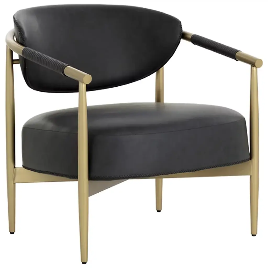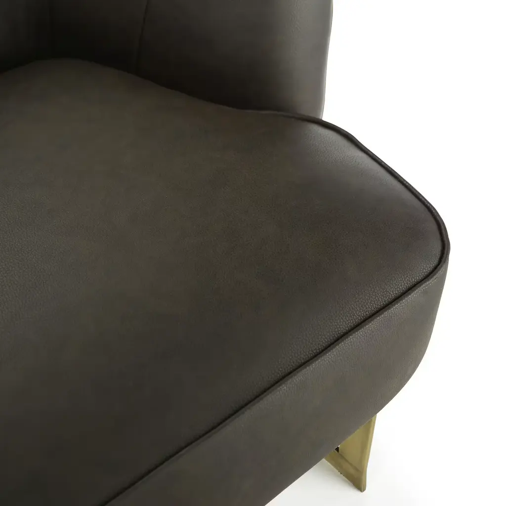 This elegant armchair, designed by Studio 63 for Marioni, features a brass structure and a polyurethane padding. It is available in different upholstery. In this configuration the cover is in dark brown leather .