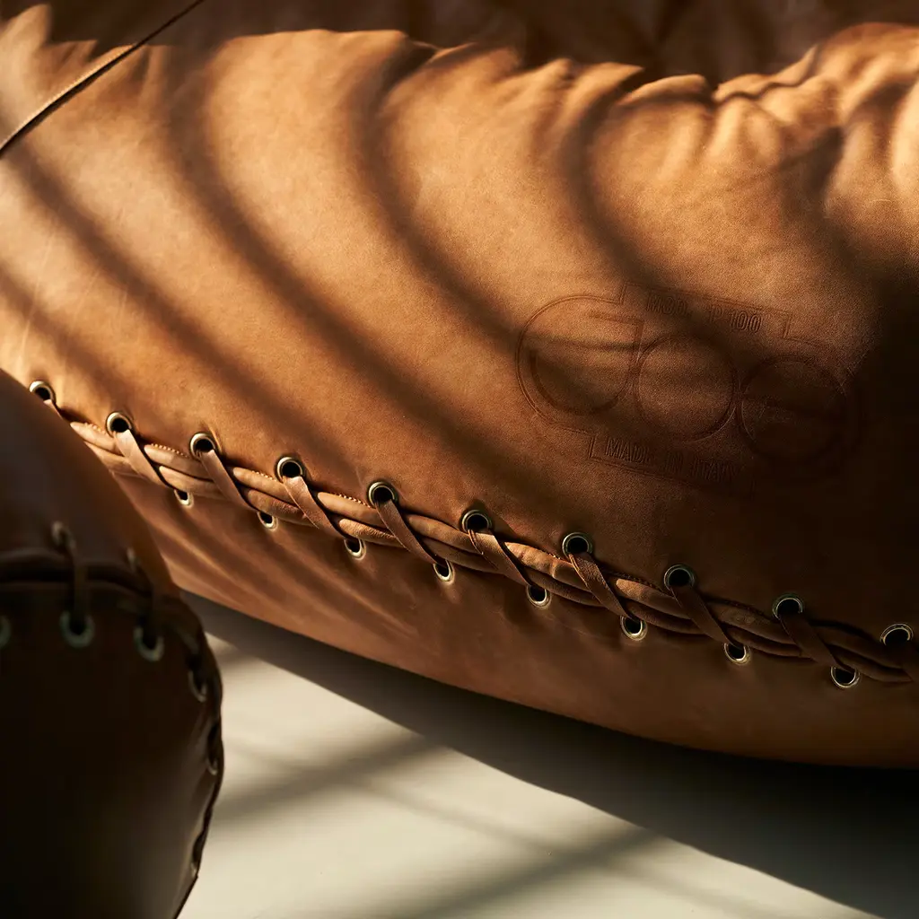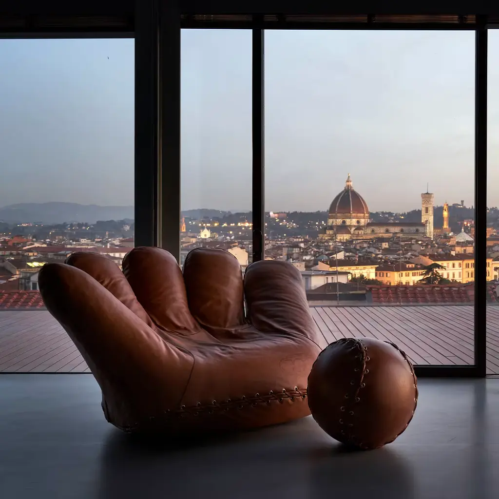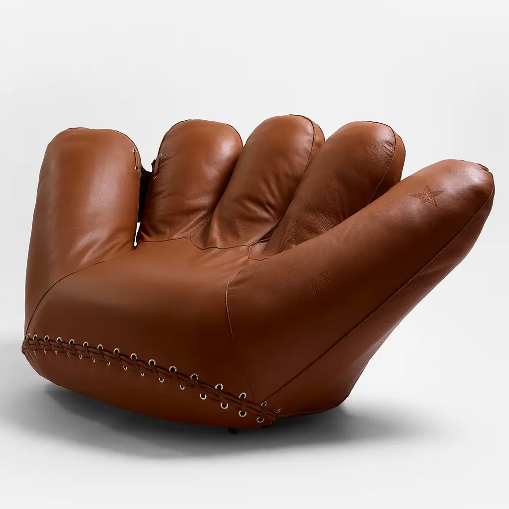 An iconic and bold design that pays tribute to American baseball champion Joe DiMaggio, this extraordinary armchair features the shape of a huge and embracing baseball glove. The perfect complement to the Joe Ball Pouf, its Pop Art-inspired character is enhanced with brown leather upholstery. Softly padded with preformed polyurethane foam, it rests on a metal frame.