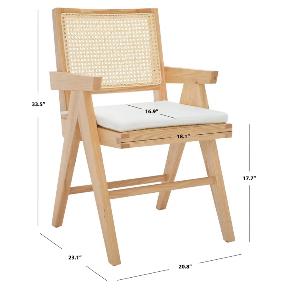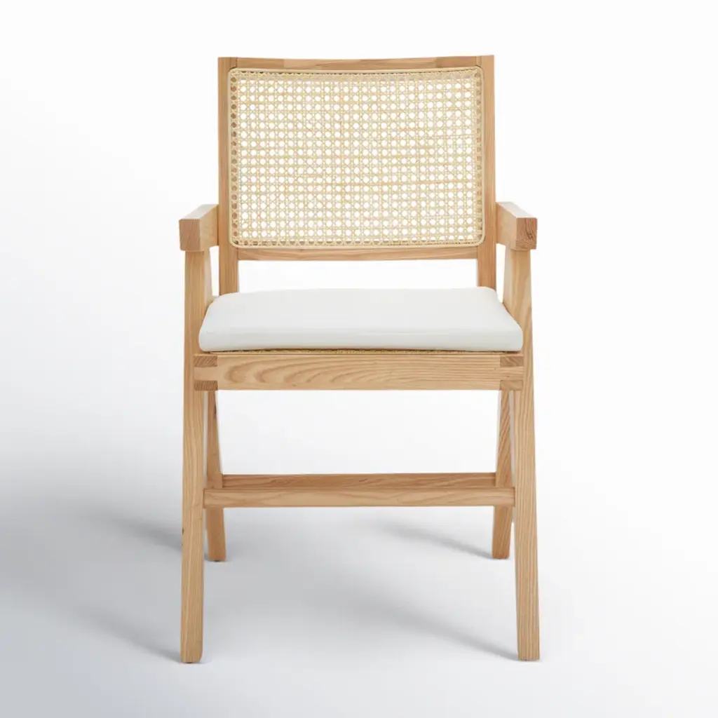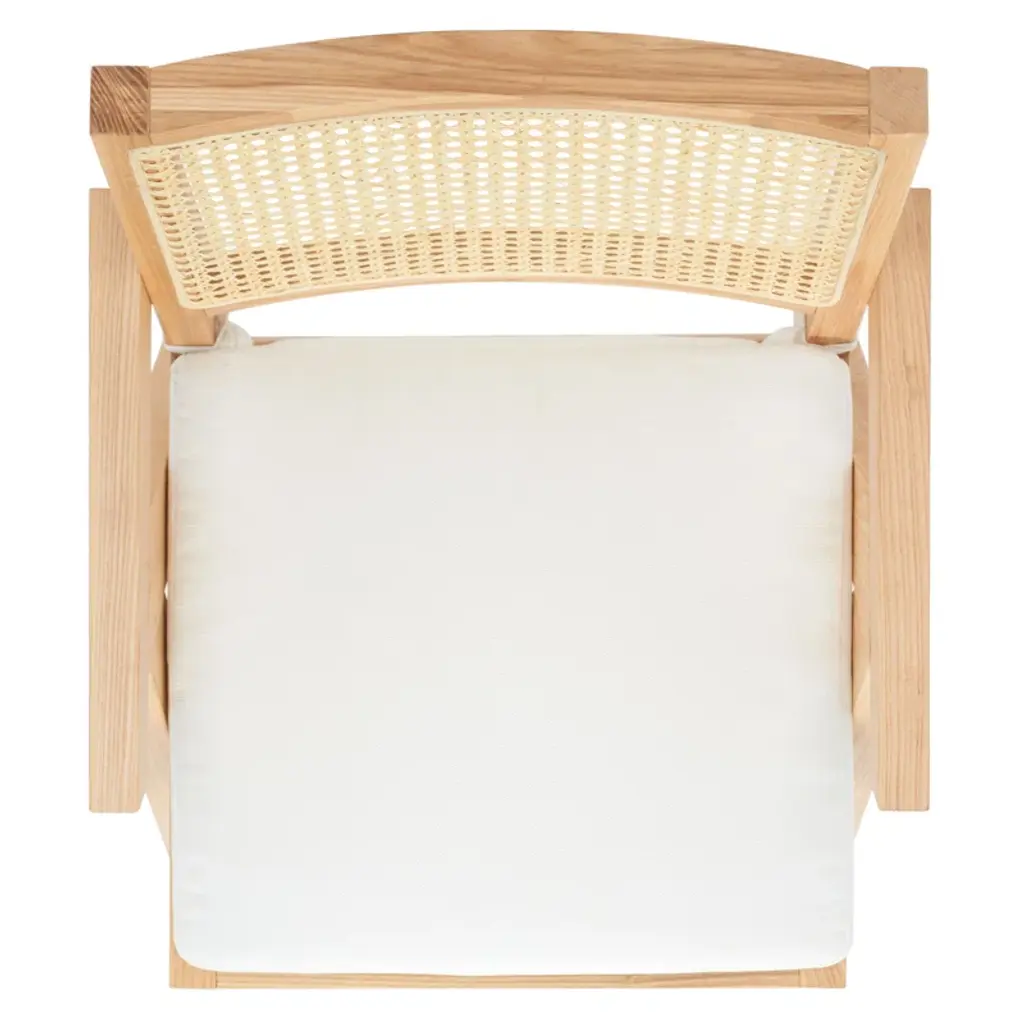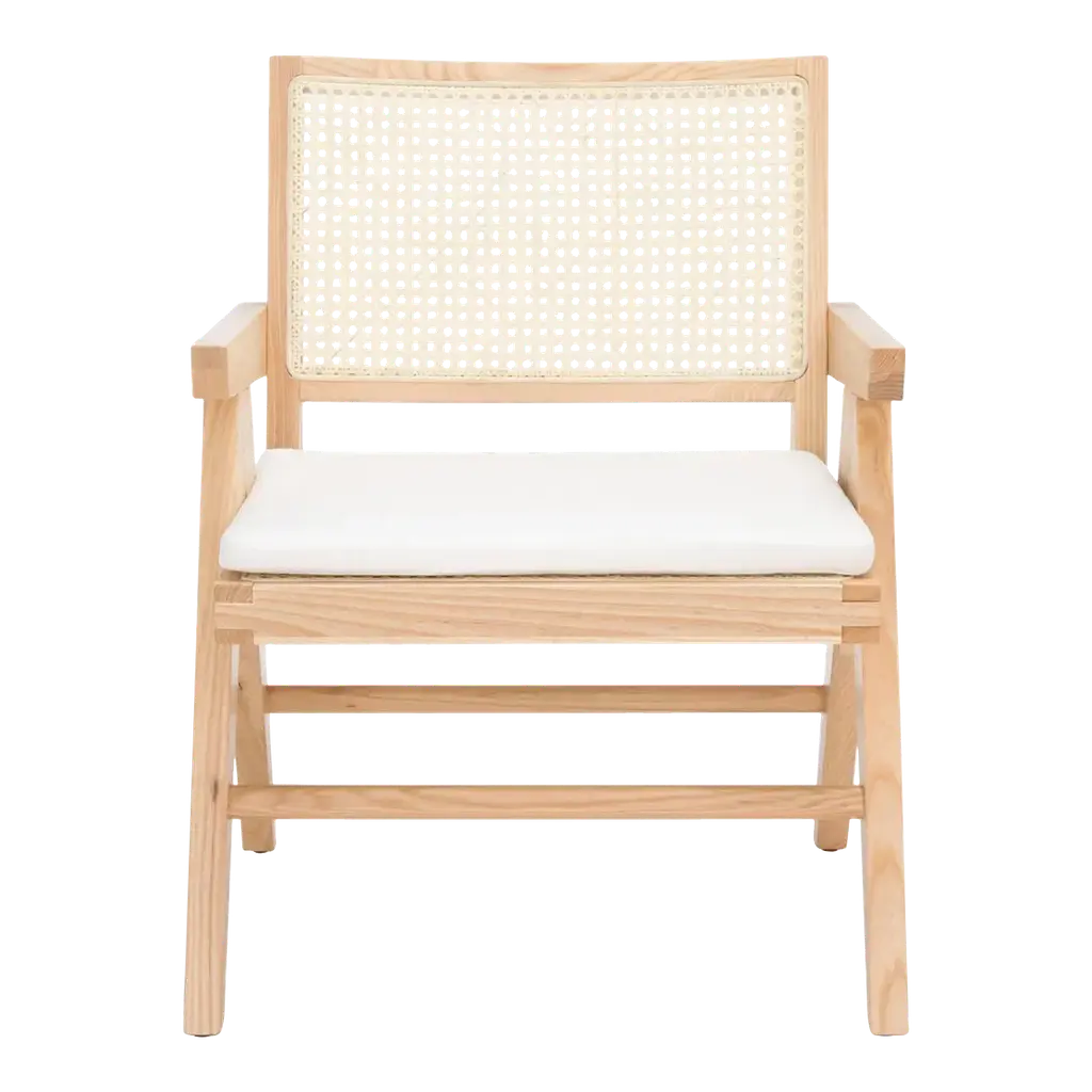 Create a cozy and inviting spot to relax with our Jamia armchair. Our sleek and clean-lined armchair receives a relaxed upgrade with rattan mesh upon the back. Expertly crafted with solid ash wood, the armchair is elevated with a natural finish. It features a generously padded white boxy cushion to deliver supreme comfort. Featuring sleek arms, our light and airy armchair is the perfect spot to relax and unwind.