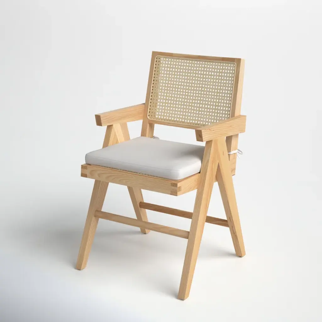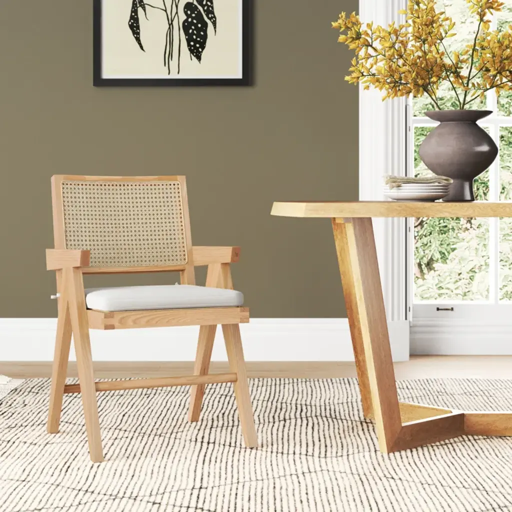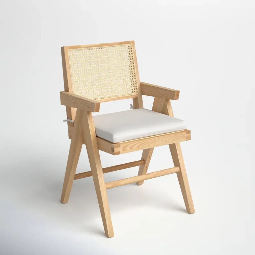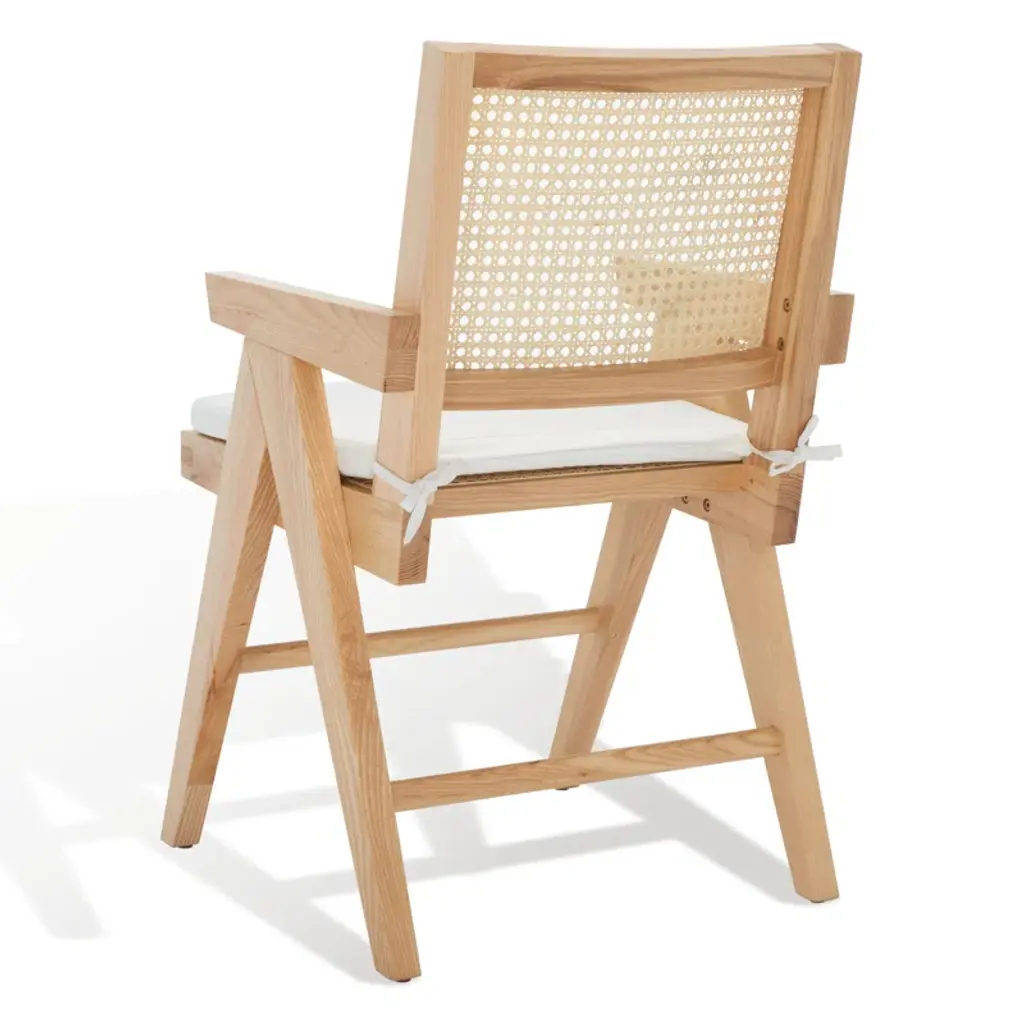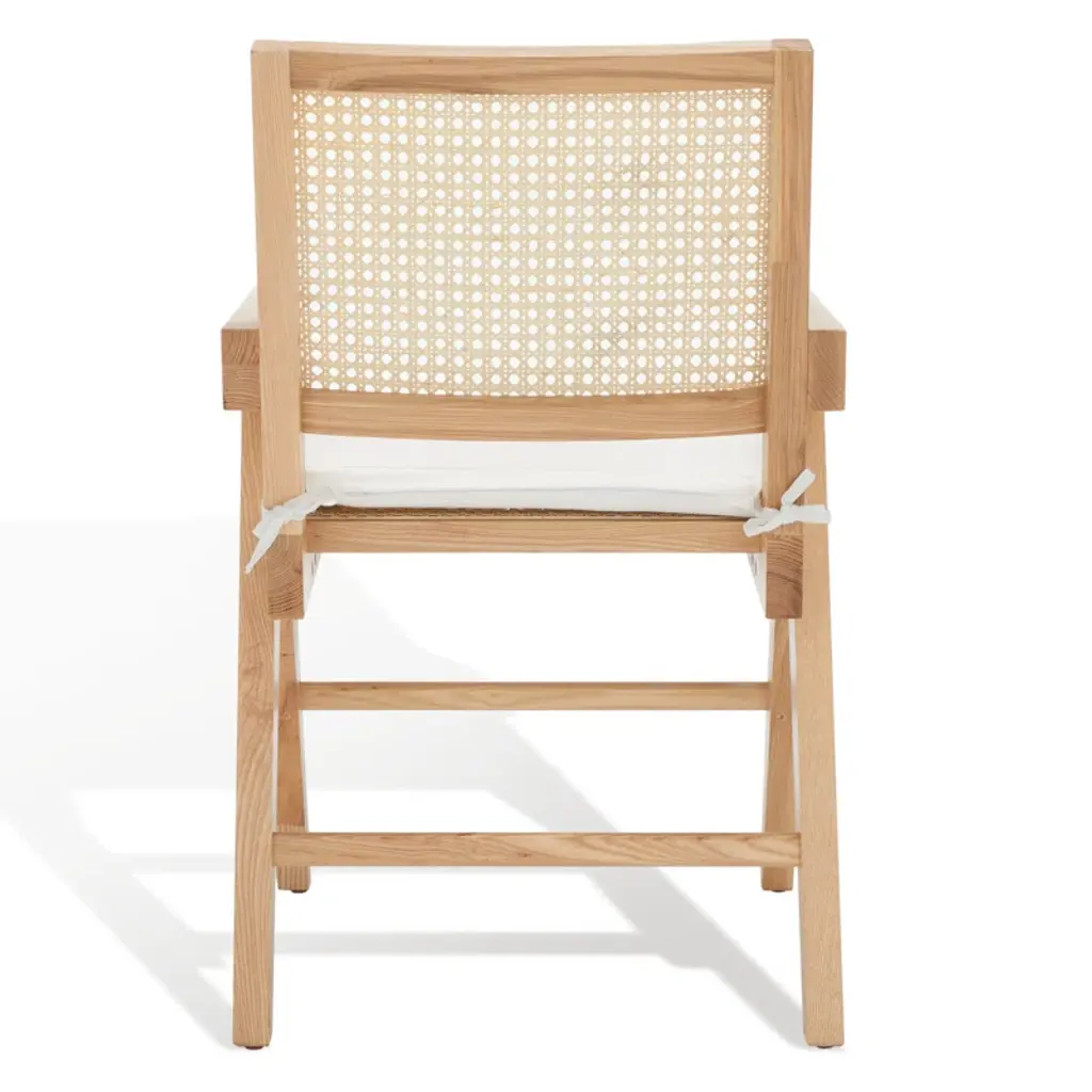 Create a cozy and inviting spot to relax with our Jamia armchair. Our sleek and clean-lined armchair receives a relaxed upgrade with rattan mesh upon the back. Expertly crafted with solid ash wood, the armchair is elevated with a natural finish. It features a generously padded white boxy cushion to deliver supreme comfort. Featuring sleek arms, our light and airy armchair is the perfect spot to relax and unwind.