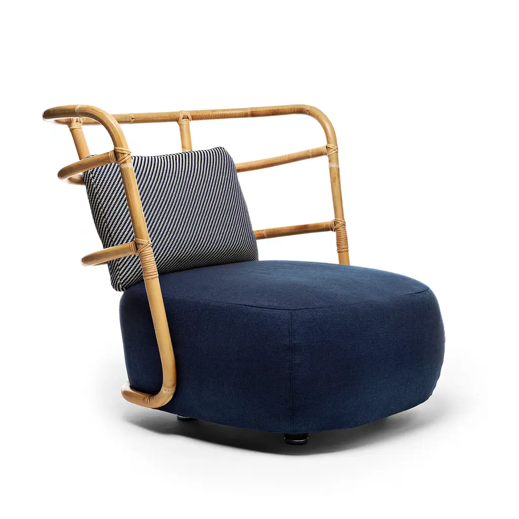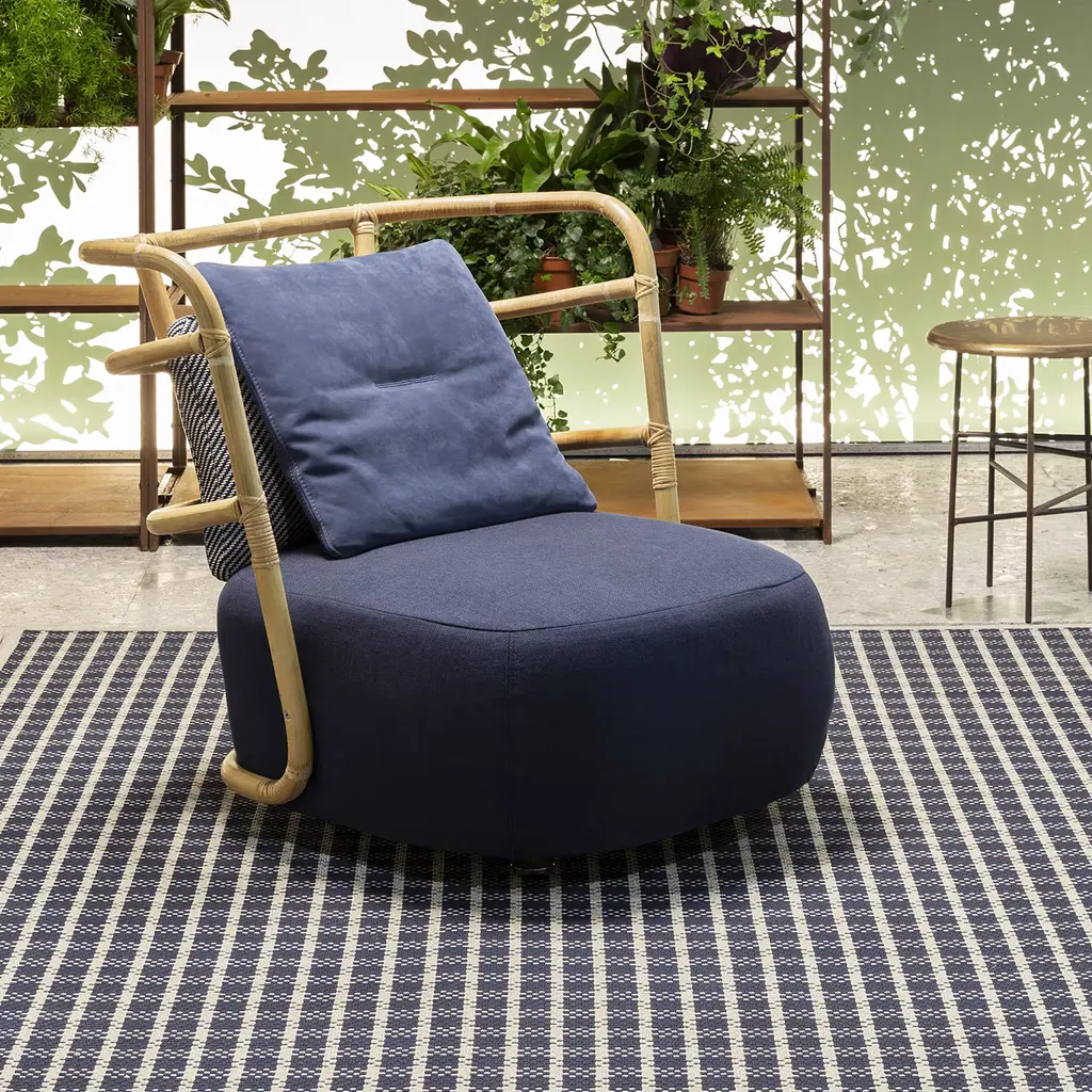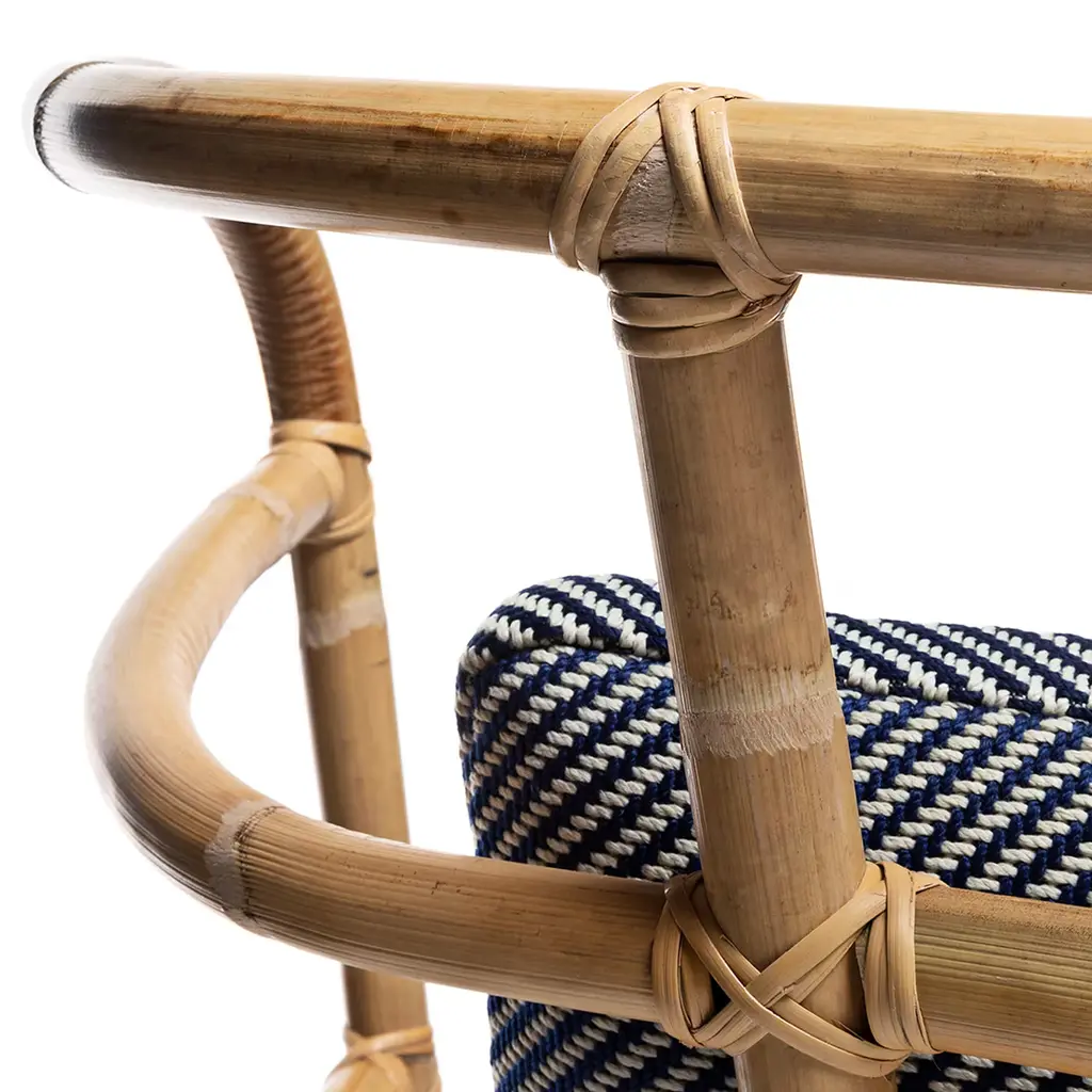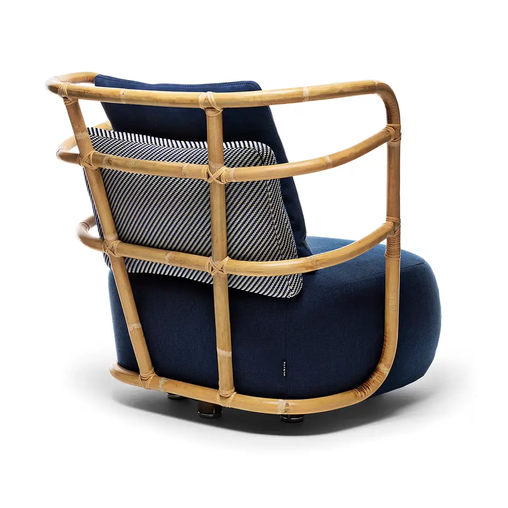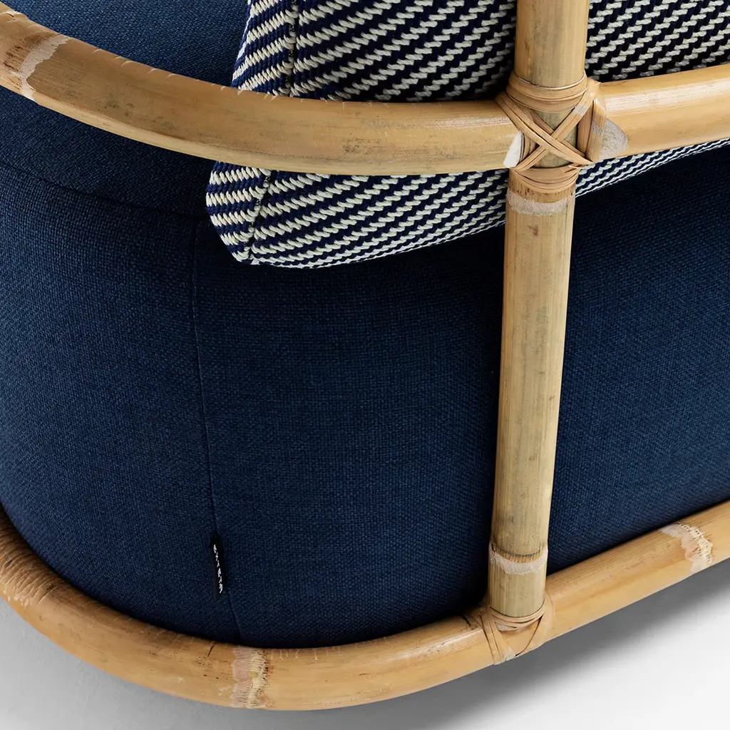 A singular piece of sophisticated value, this design belongs to the Jungle Collection by Massimo Castagna. Distinguished by a stupendous bamboo cane backrest that enhances its natural inspiration, it features a softly padded seat upholstered with blue fabric, cushions included. An outdoor cover is recommended to protect the piece when left outside, please contact the Concierge for details. Customizable to suit any taste or decor need upon request. If the products are placed completely outside, nightcovers that can be purchased at an extra price are recommended. Please contact the Concierge for further information and options.