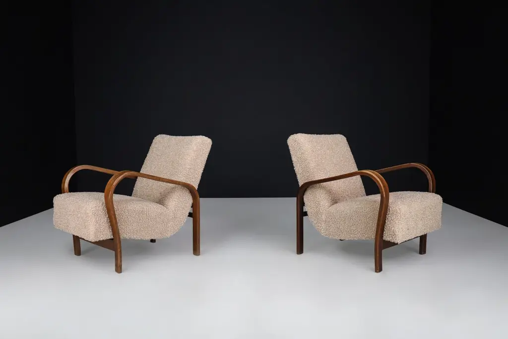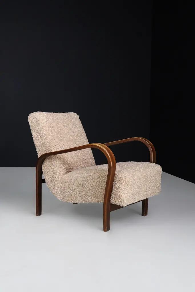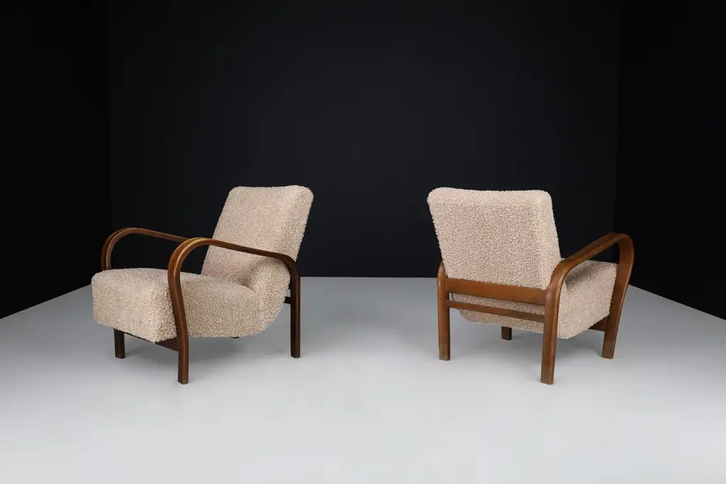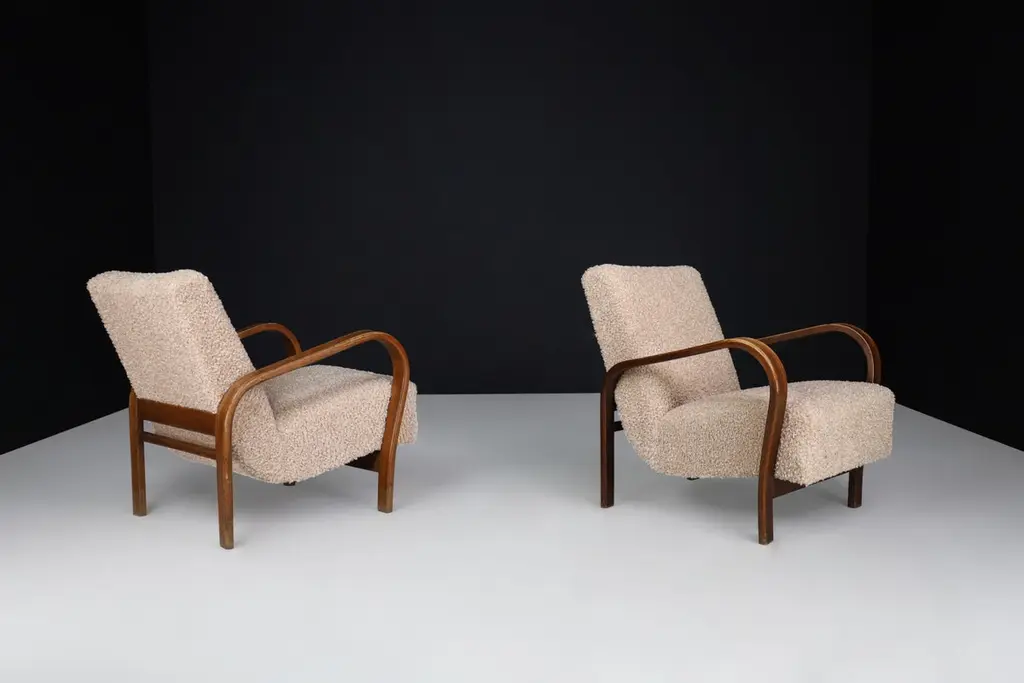 Karel Koželka & Antonín Kropáček re-upholstered bentwood Armchairs, Czechia 1940We offer re-upholstered Karel Koželka & Antonín Kropáček bentwood armchairs, originally designed in Czechia circa 1940. These iconic chairs are a benchmark for midcentury design in Central Europe, boasting a simple and elegant geometry contrasted by dynamic bentwood elements and a soft, comfortable seat. Drawing inspiration from modernism, Karel Koželka & Antonín Kropáček created a distinctive aesthetic that is dynamic, streamlined, and humanistic, making them ideal for inviting and functional domestic spaces. Although there may be some patina on the wood parts, we have many of these armchairs available (some even in their original upholstery) which would be perfect for interior projects such as a lounge or hotel. Opting for used mid-century design promotes sustainability by reusing what is already available. In fact, some furniture can have a second, third, or even fourth life. Mid-century design furniture is often high-quality and built to last, which is why it can have a rich history that is still visible or tangible through any signs of wear and tear.