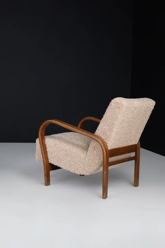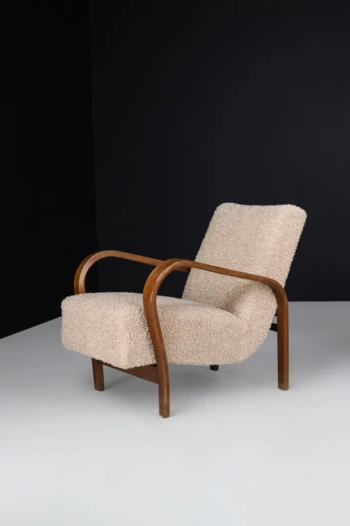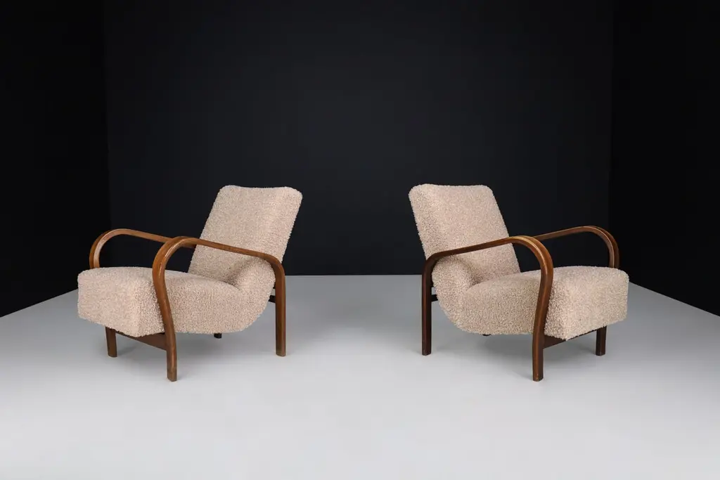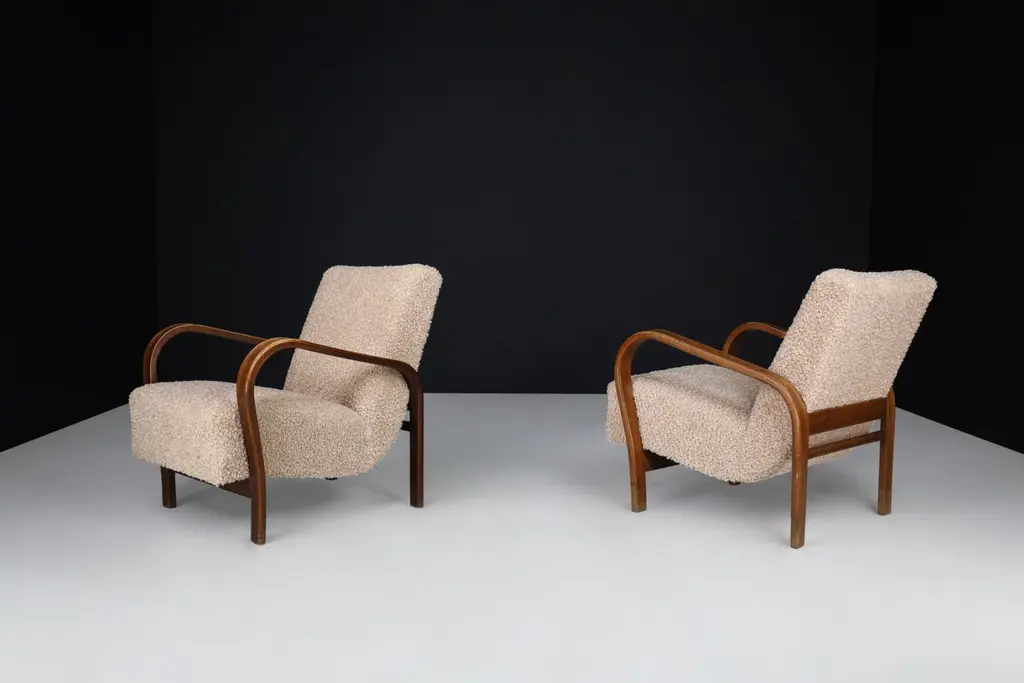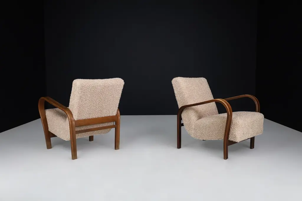 Karel Koželka & Antonín Kropáček re-upholstered bentwood Armchairs, Czechia 1940We offer re-upholstered Karel Koželka & Antonín Kropáček bentwood armchairs, originally designed in Czechia circa 1940. These iconic chairs are a benchmark for midcentury design in Central Europe, boasting a simple and elegant geometry contrasted by dynamic bentwood elements and a soft, comfortable seat. Drawing inspiration from modernism, Karel Koželka & Antonín Kropáček created a distinctive aesthetic that is dynamic, streamlined, and humanistic, making them ideal for inviting and functional domestic spaces. Although there may be some patina on the wood parts, we have many of these armchairs available (some even in their original upholstery) which would be perfect for interior projects such as a lounge or hotel. Opting for used mid-century design promotes sustainability by reusing what is already available. In fact, some furniture can have a second, third, or even fourth life. Mid-century design furniture is often high-quality and built to last, which is why it can have a rich history that is still visible or tangible through any signs of wear and tear.