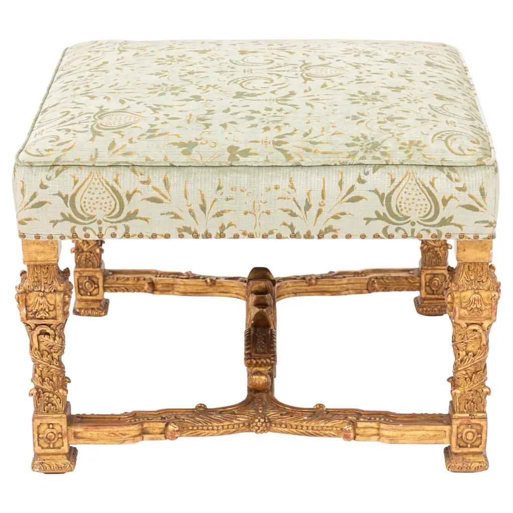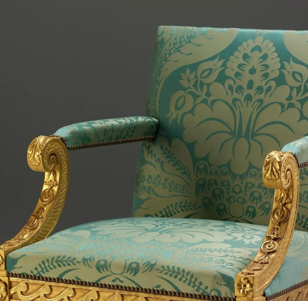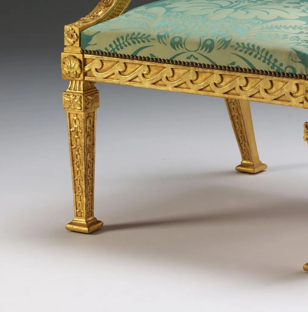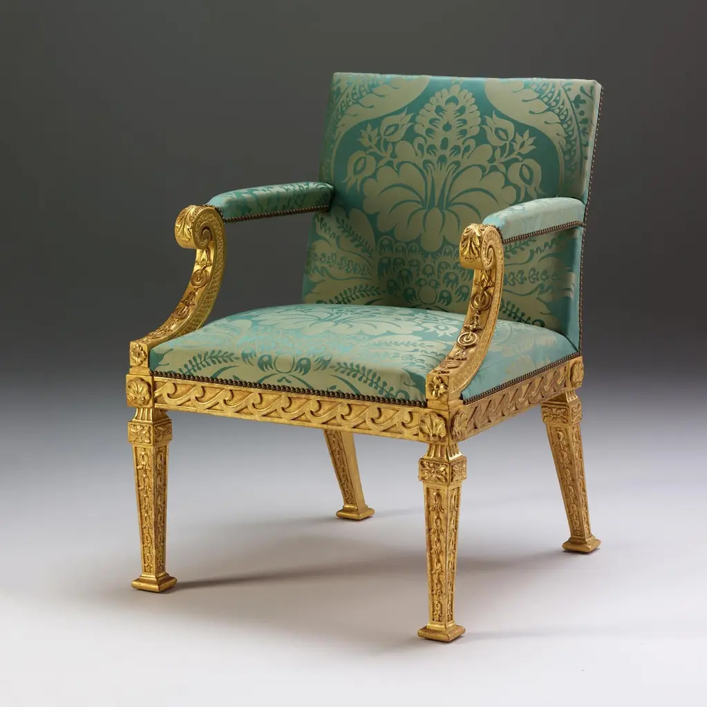 A William Kent design gilded wood library armchair with tapering square legs, acanthus and shell carvings, vitruvian scroll rails and swept arms with acanthus roundel and bell-flower details.We are currently working to a 30-36 week lead time.