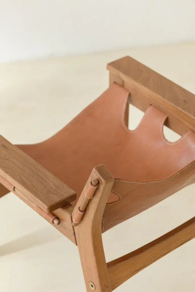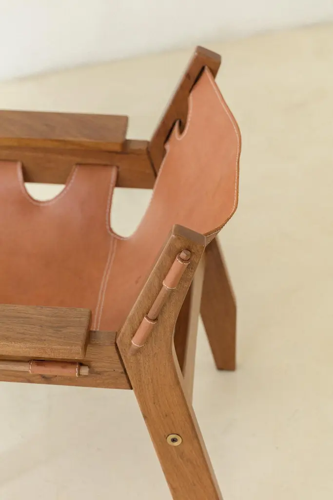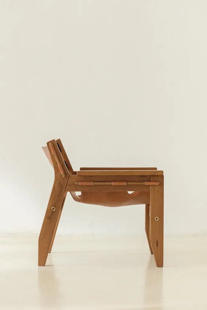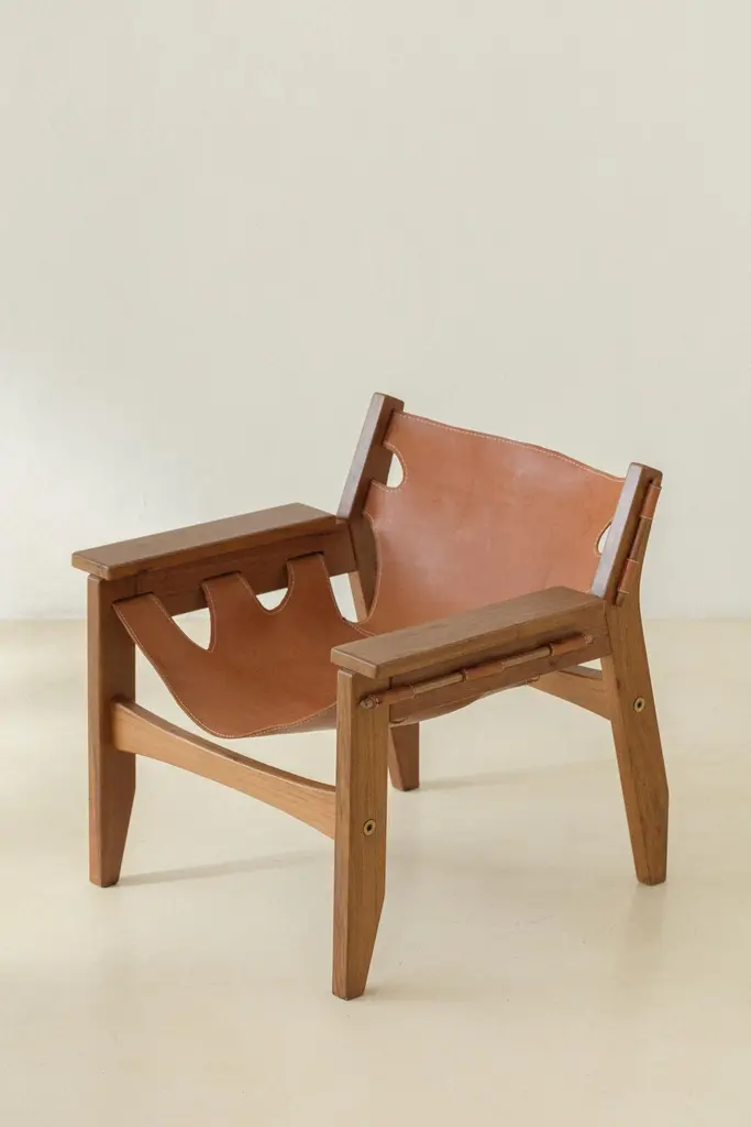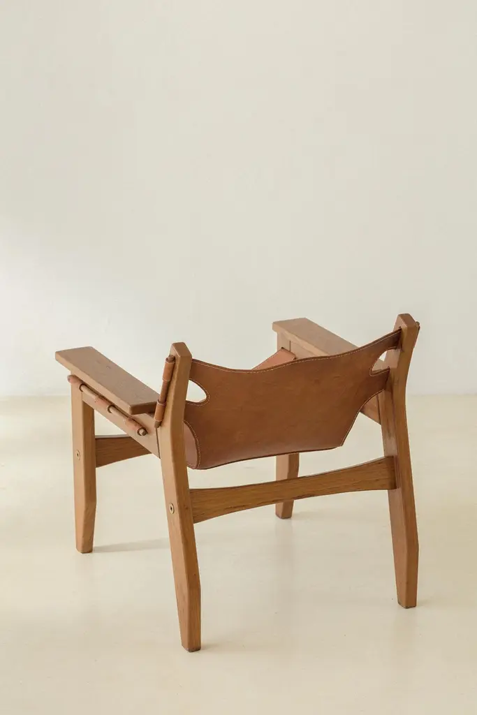 Designed by Sergio Rodrigues (1927-2014) in 1973 and produced by Oca, the Kilin armchair is composed of two sides and two crosspieces, with the back and seat made from a unique piece of leather.The bold design, with shapes and fittings of wood leather floating in the air and prepared to shape and hug the body, makes Kilin the favorite piece of many people.The name is a tribute to Rodrigues's wife, Vera Beatriz (1931-2017), who he affectionately called "little squirrel." Kilin is an adaptation of the Brazilian word for the nickname "esquilinho."