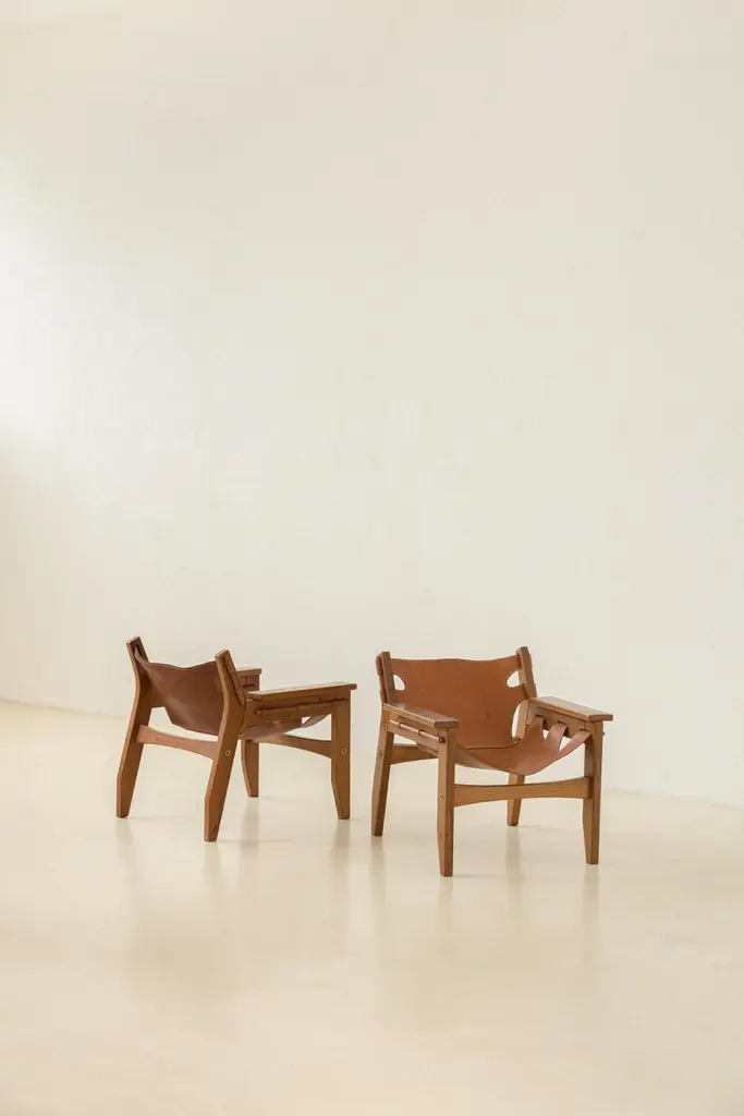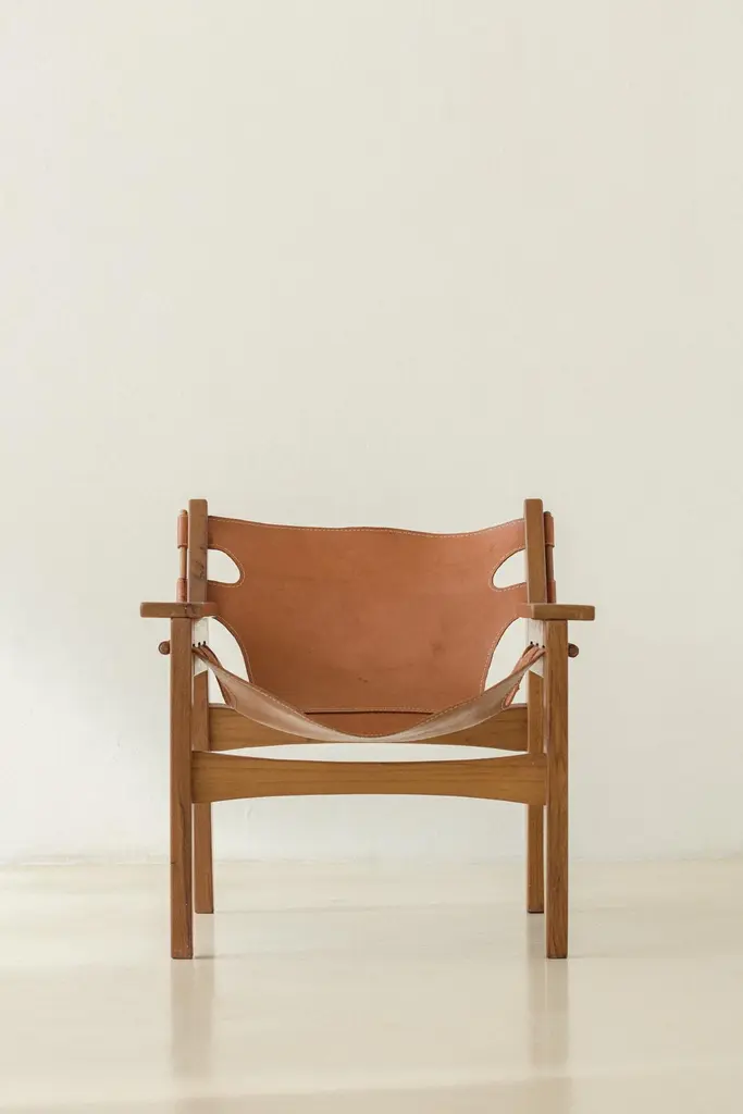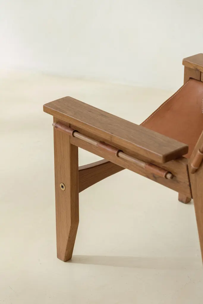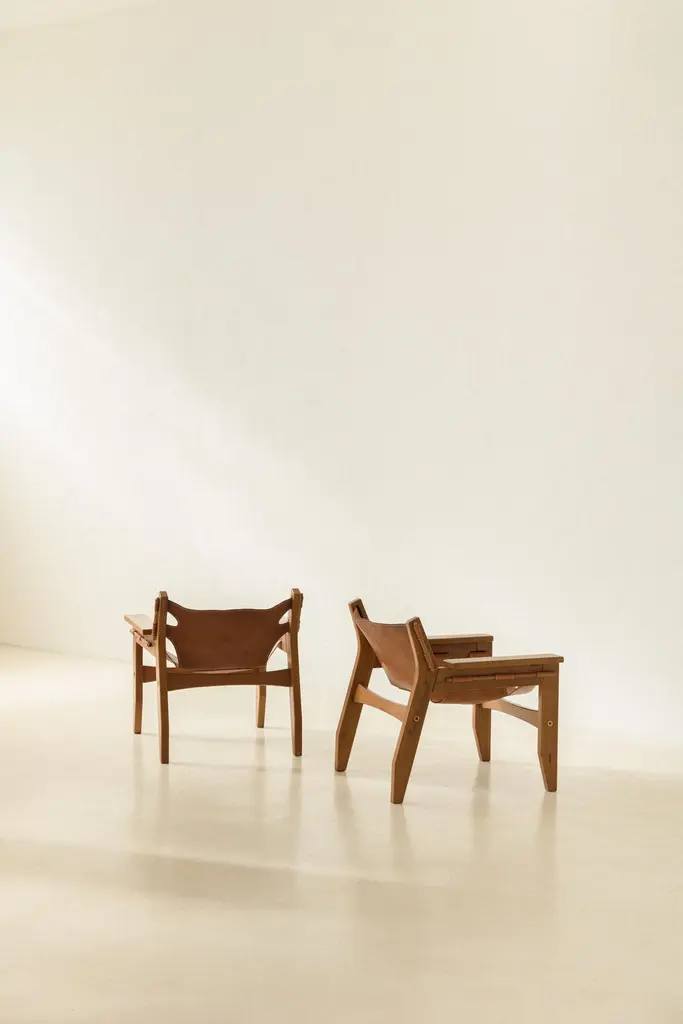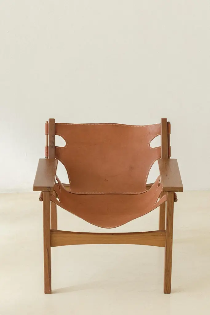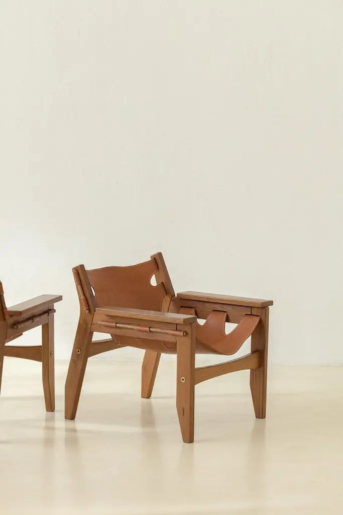 Designed by Sergio Rodrigues (1927-2014) in 1973 and produced by Oca, the Kilin armchair is composed of two sides and two crosspieces, with the back and seat made from a unique piece of leather.The bold design, with shapes and fittings of wood leather floating in the air and prepared to shape and hug the body, makes Kilin the favorite piece of many people.The name is a tribute to Rodrigues's wife, Vera Beatriz (1931-2017), who he affectionately called "little squirrel." Kilin is an adaptation of the Brazilian word for the nickname "esquilinho."