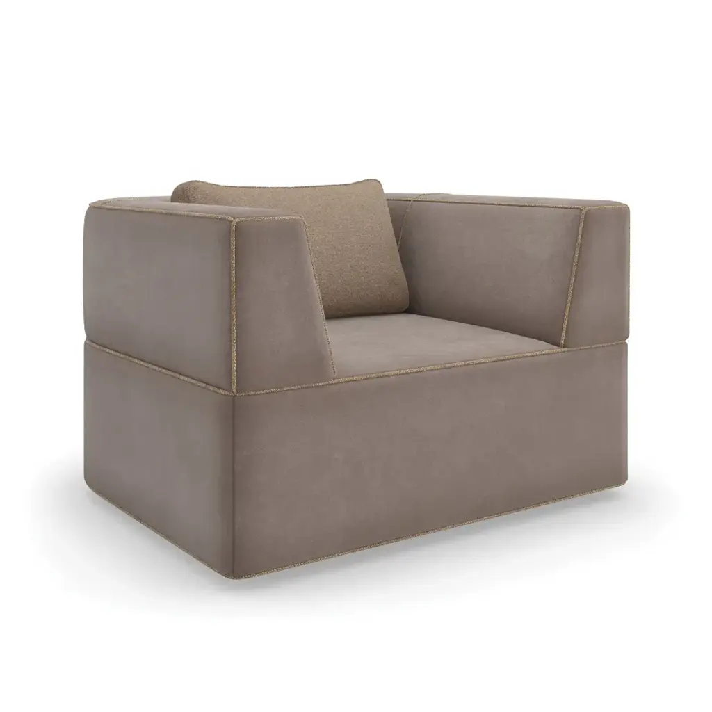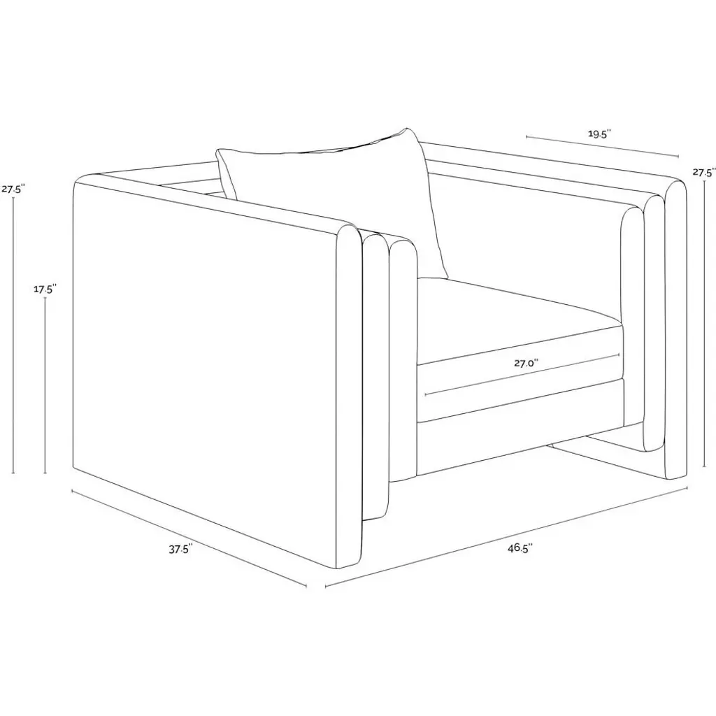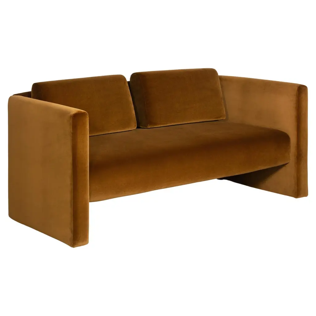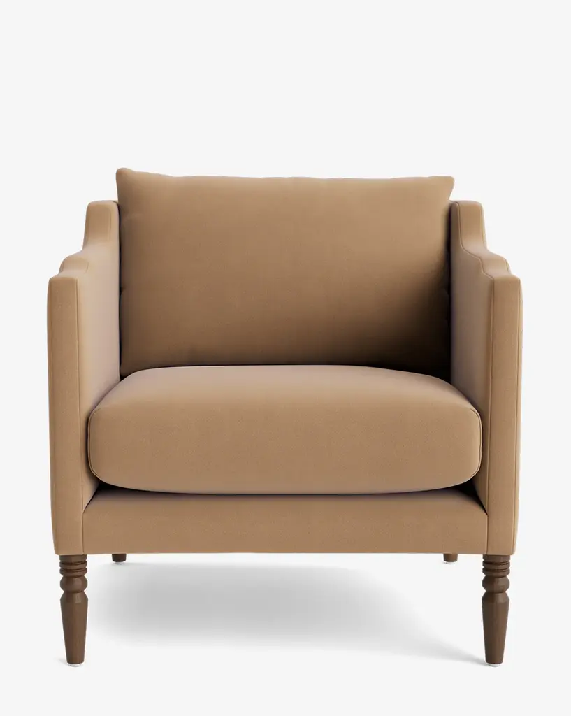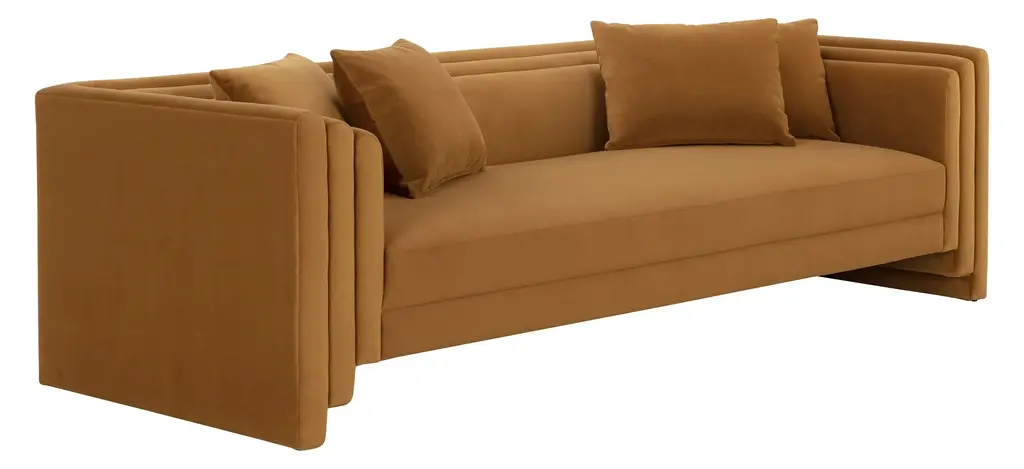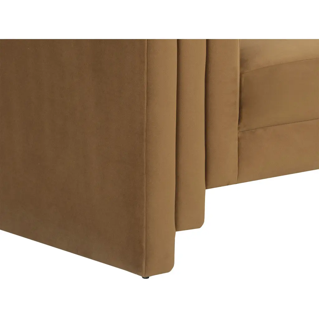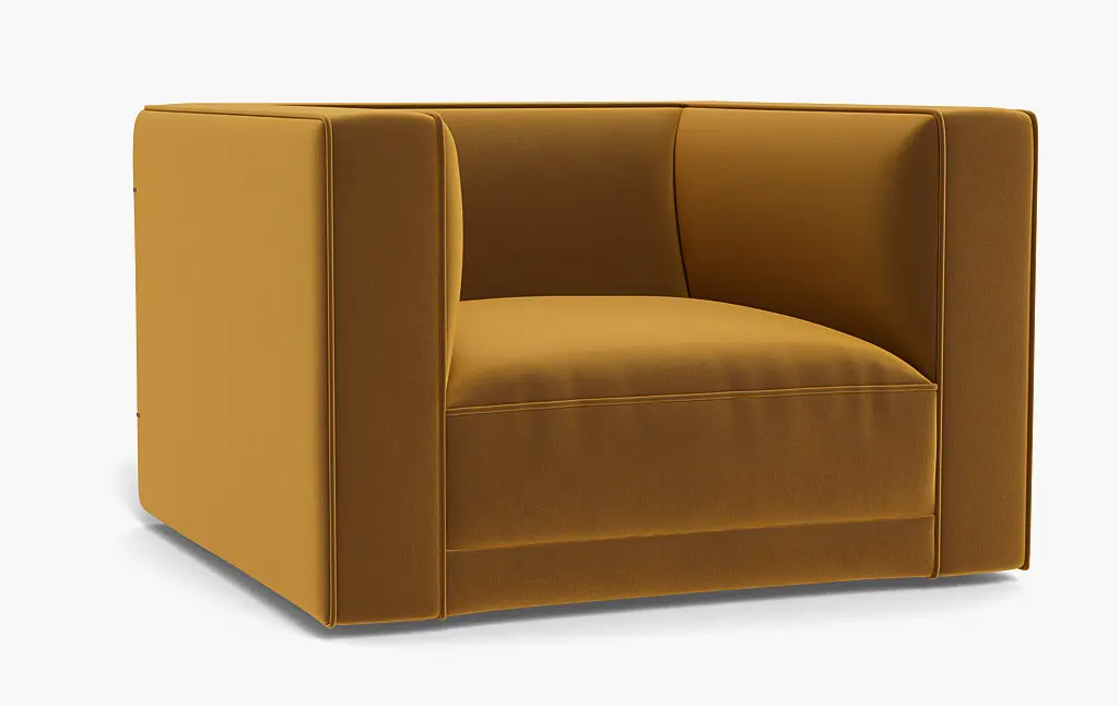 Artfully designed with soft geometric lines, the Kira Armchair evokes a distinctly modern style. Fully upholstered in our meg gold fabric, this sofa is velvety soft.