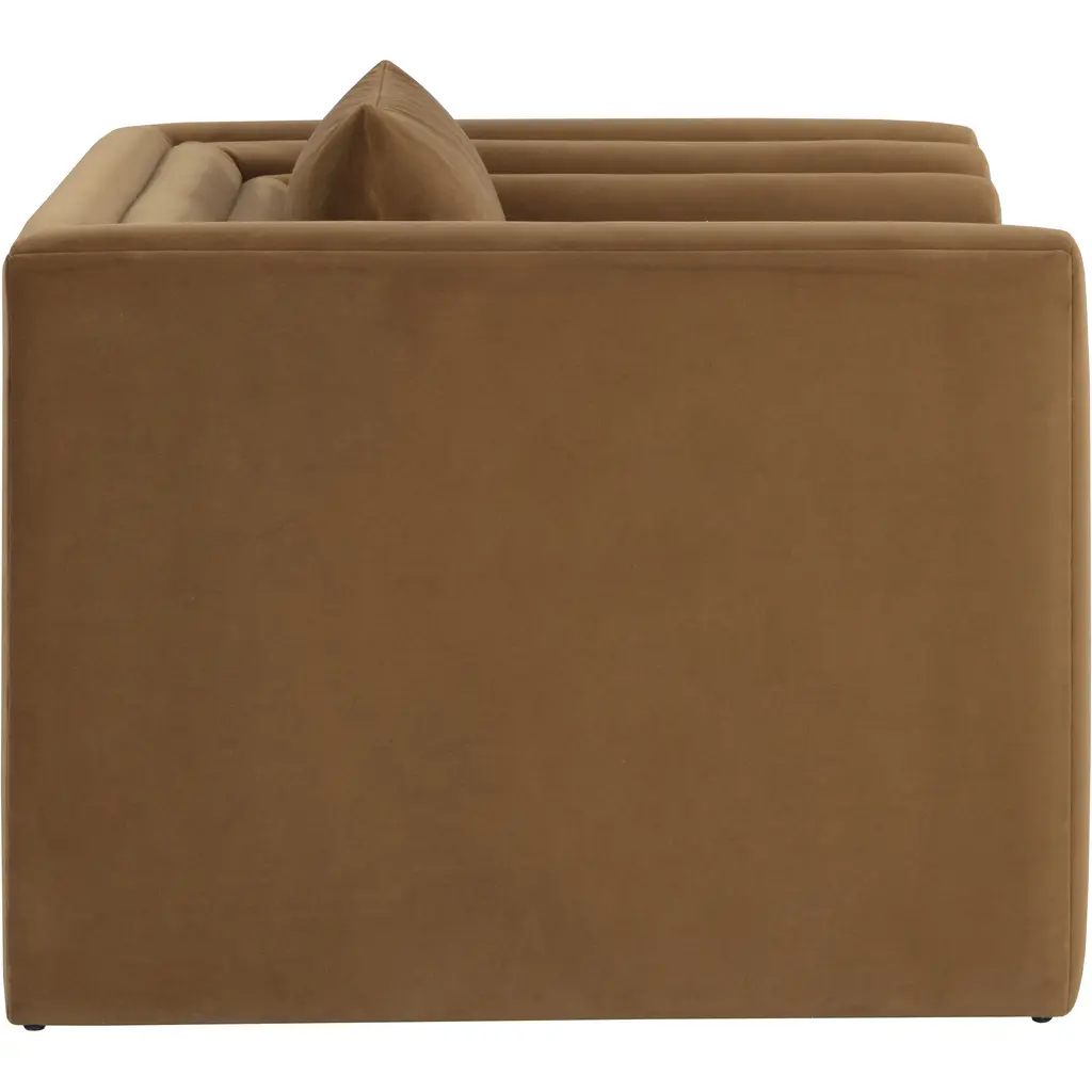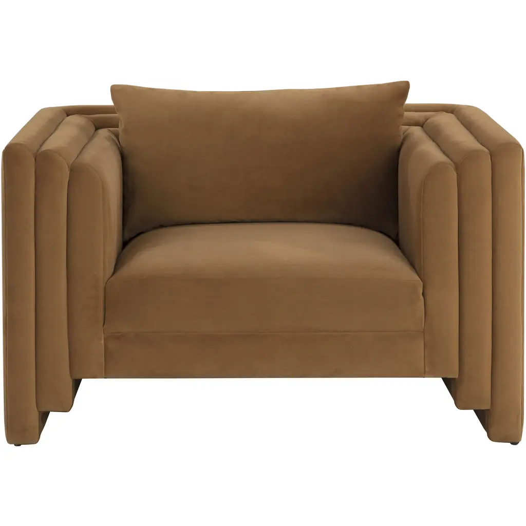 Artfully designed with soft geometric lines, the Kira Armchair evokes a distinctly modern style. Fully upholstered in our meg gold fabric, this sofa is velvety soft.