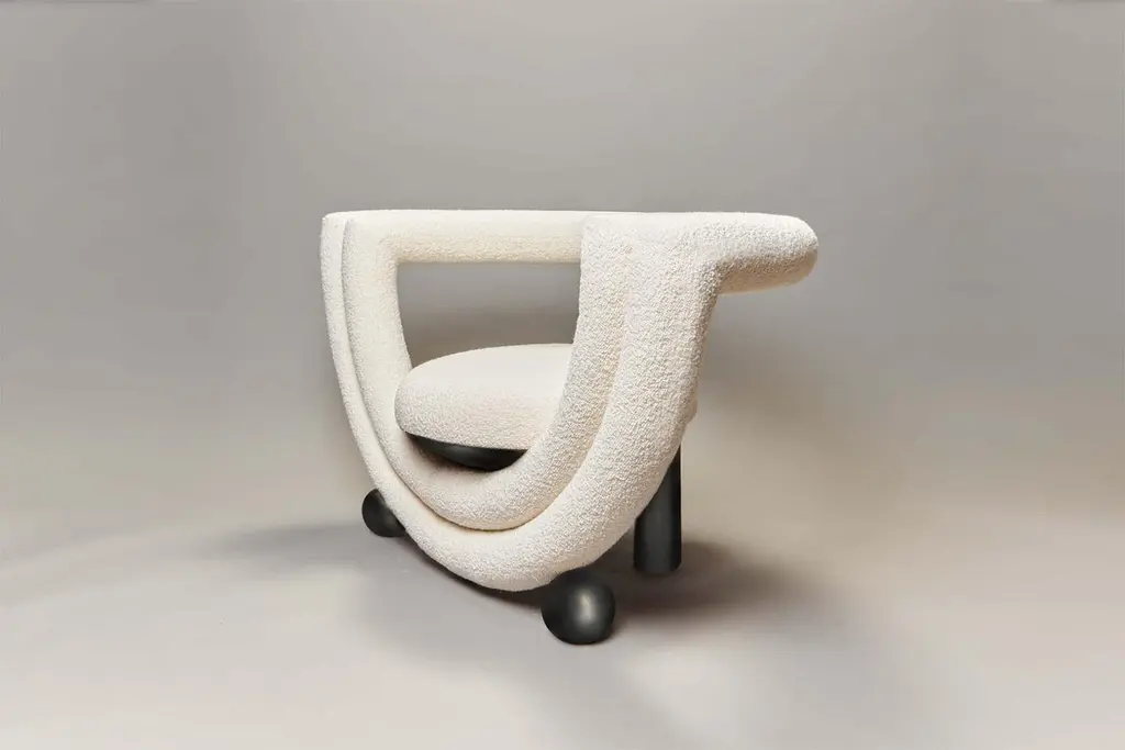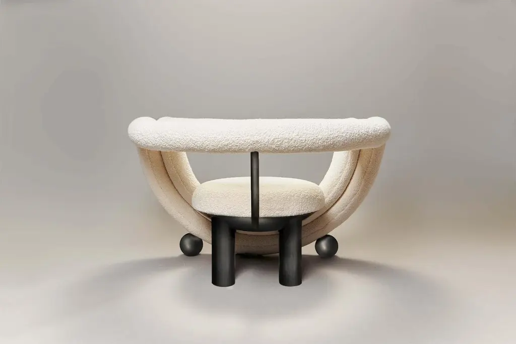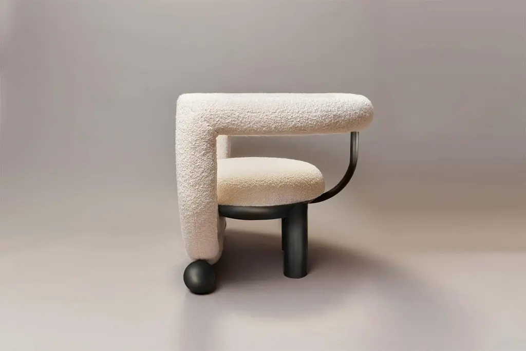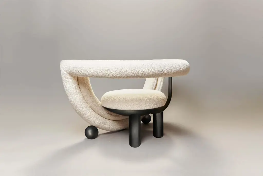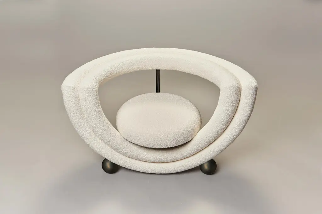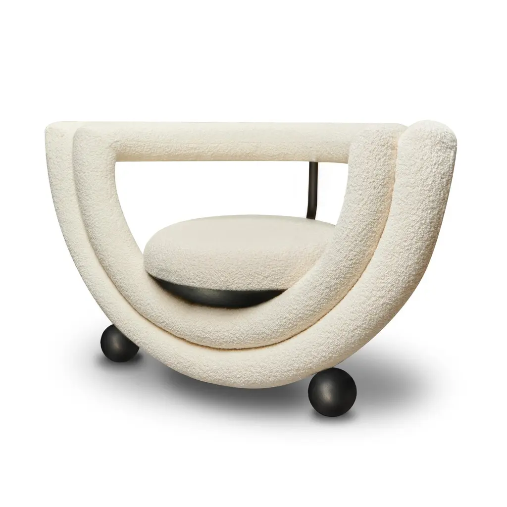 Kissing Armchair, Modern, Sculptural, Rounded, Bronze Metal, Cream Boucle Fabric