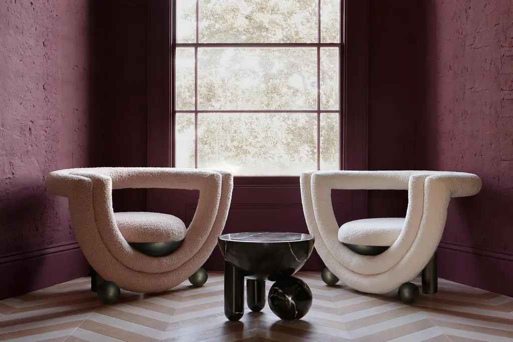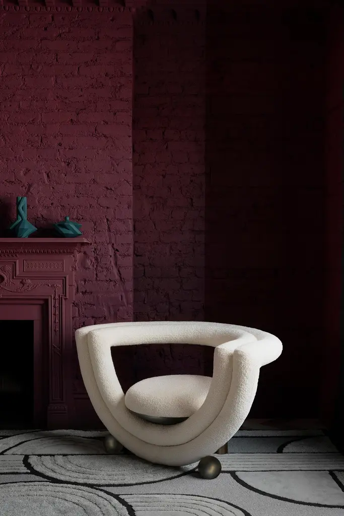 Kissing Armchair features two semi-circle layers; one bearing the cupped seat and a second forming the back-rest. All the lines are covered with soft upholstery apart from the metal legs and metal cups, which hold the upholstered seat like an ice cream coupe. It is reminiscent of an open mouth, ready to chat, eat and kiss.