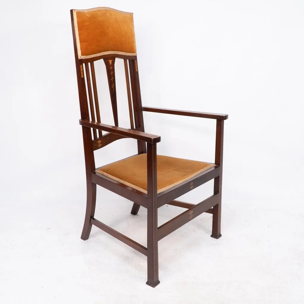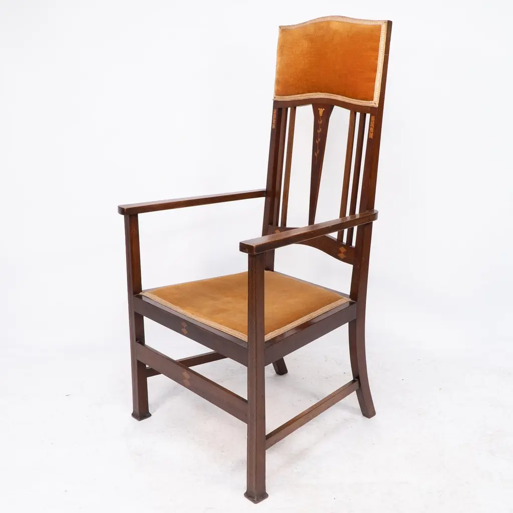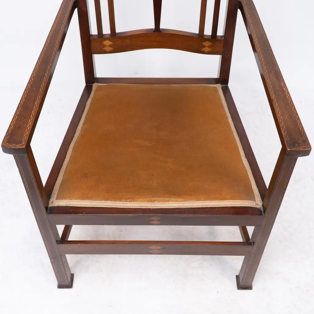 Liberty & Co. attributed.A pair of Arts & Crafts mahogany armchairs with stylized floral inlays.Although I bought them separately, both armchairs have the no 1877 in hand writing on an oval label underneath the front apron, suggesting these two armchairs have been manufactured and sold at the same time, separated and then re-united 120 years later.