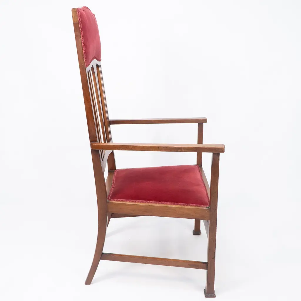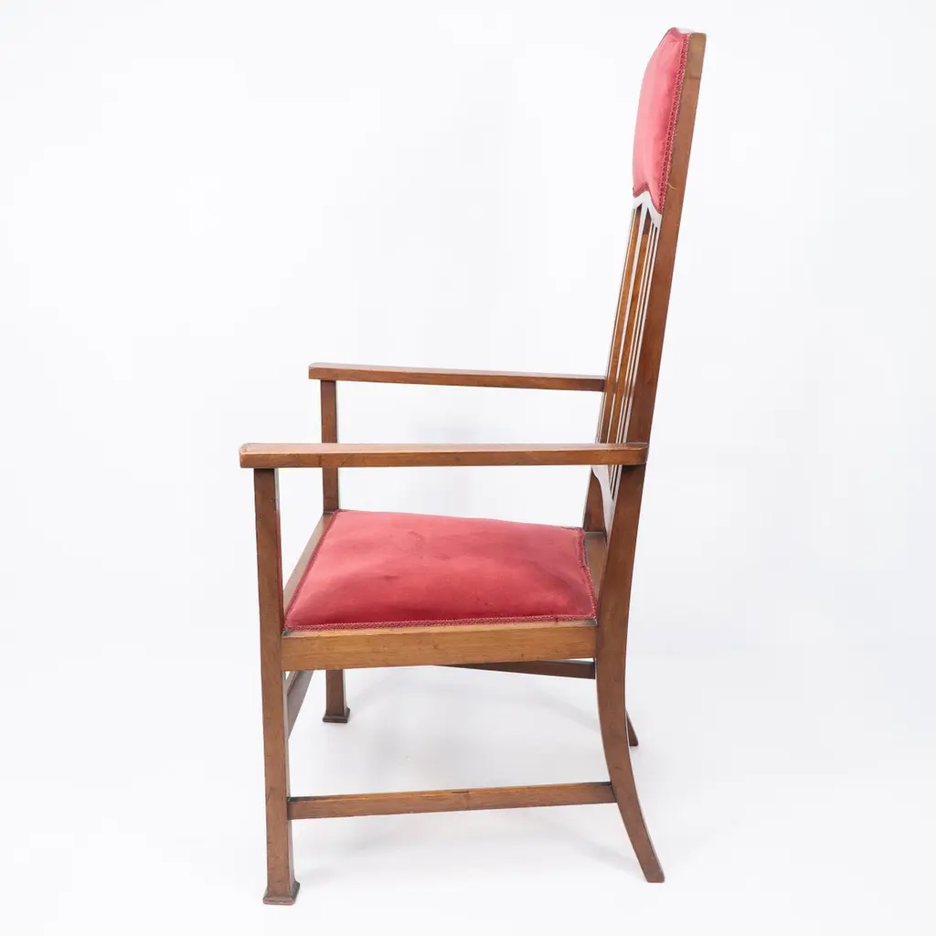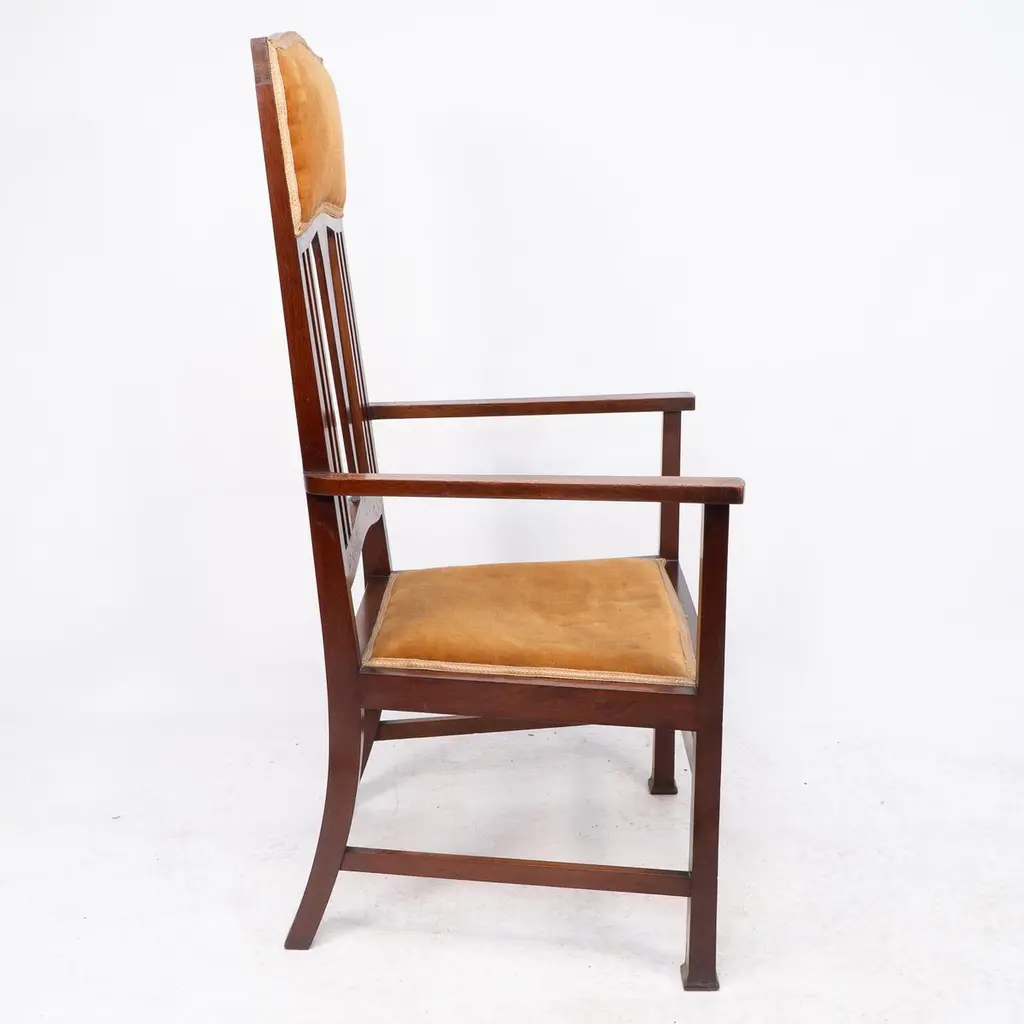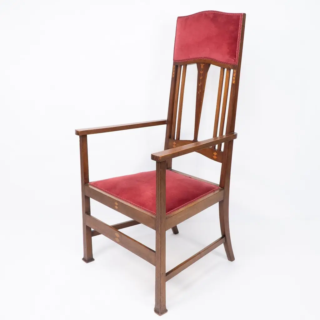 Liberty & Co. attributed.A pair of Arts & Crafts mahogany armchairs with stylized floral inlays.Although I bought them separately, both armchairs have the no 1877 in hand writing on an oval label underneath the front apron, suggesting these two armchairs have been manufactured and sold at the same time, separated and then re-united 120 years later.