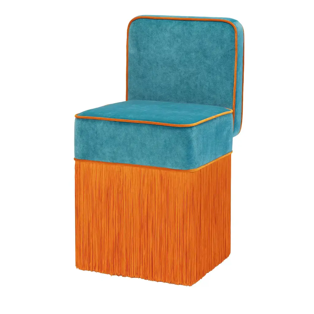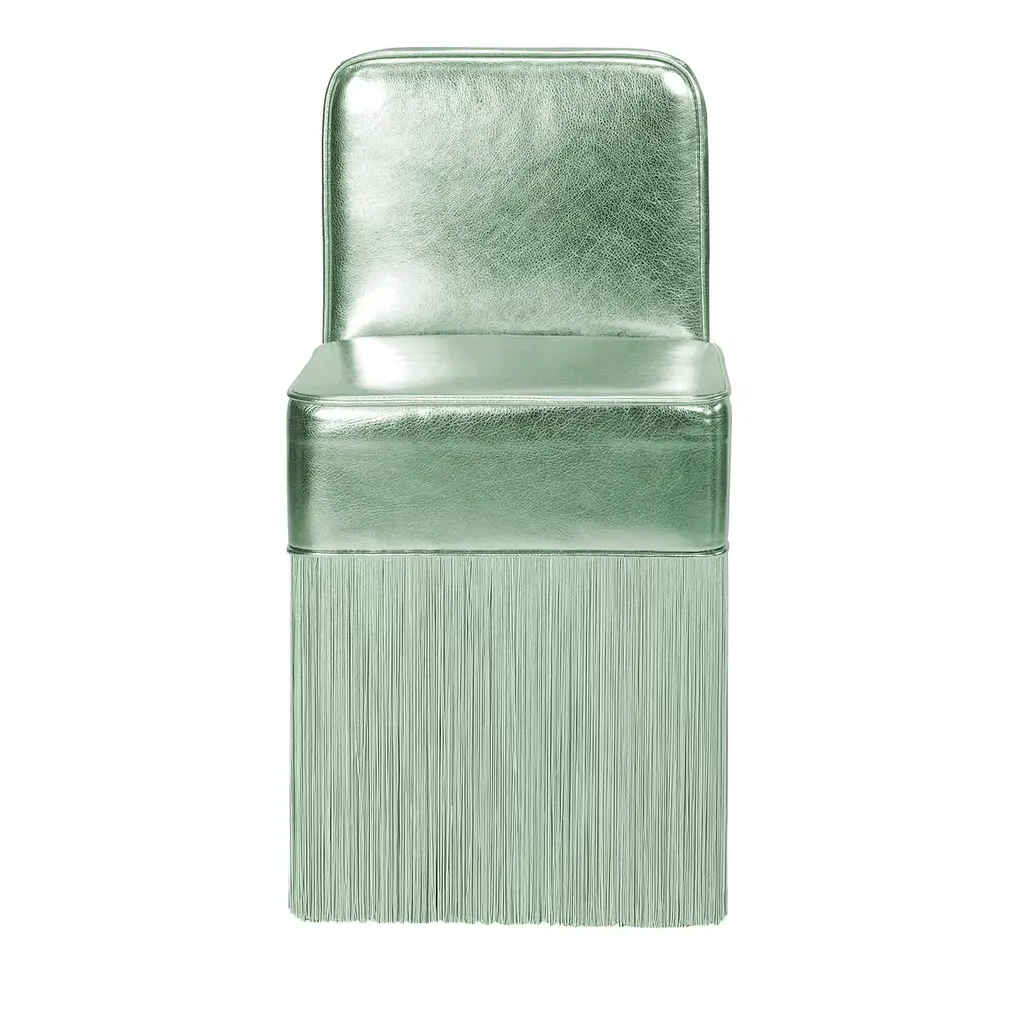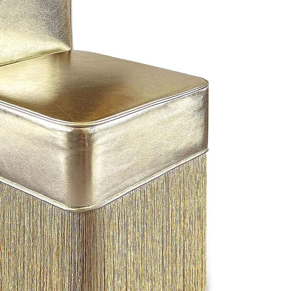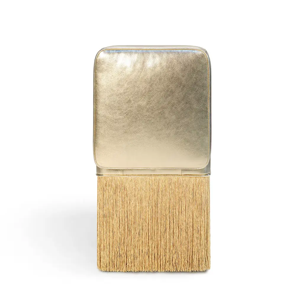 The Lilly armchair's adaptability shines through in various settings. Its minimalist yet comfortable design adds to any space and makes a bold style statement. The seatings of the signature fringed poufs, just like fine chocolates, have been enveloped into foil-finished leather making them irresistible. From the latest Gleaming collection by Lorenza Bozzoli Couture, the Lilli armchair stands out with its lustrous allure. Each bespoke piece is stamped on the bottom of the pouf’s lining and personally signed, numbered, and dated by designer.