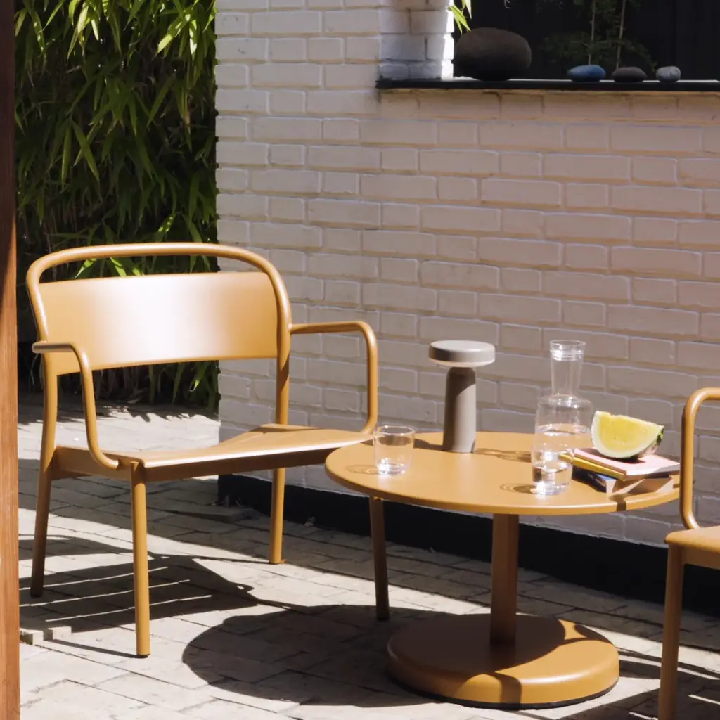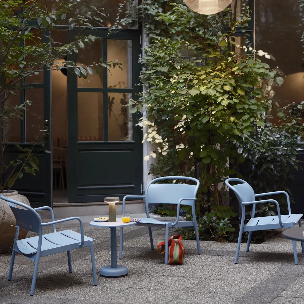 The Steel Lounge Armchair, designed by Thomas Bentzen, is a minimalist outdoor chair crafted from galvanized, powder-coated steel. The slatted seat promotes water drainage, making it suitable for all-weather outdoor use. With a smoothly curved backrest and seat, the chair provides both comfort and support, and its sturdy build ensures long-lasting durability. Available in colors dark green, burnt orange, pale blue, black, and grey the chair is also stackable up to four, making storage convenient.