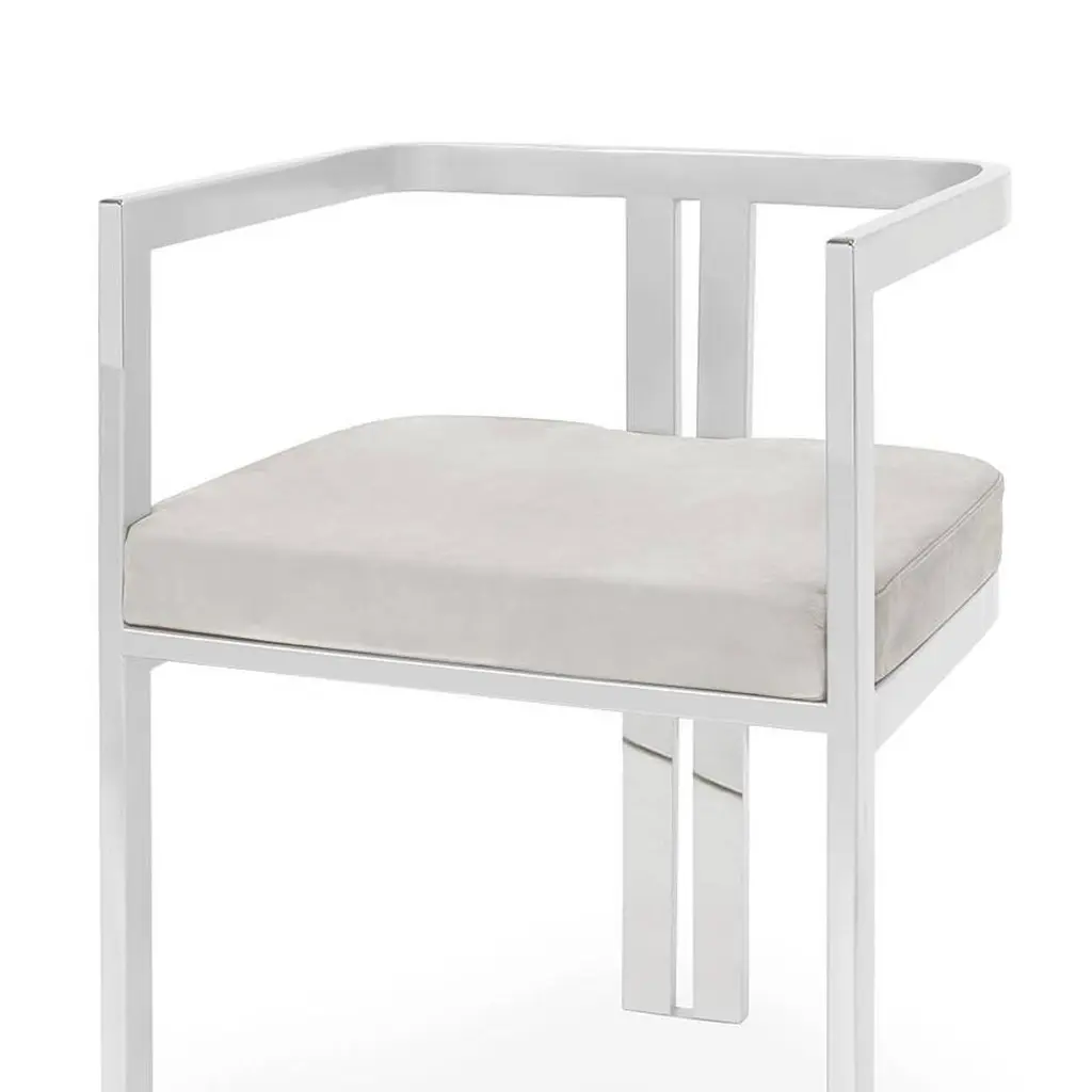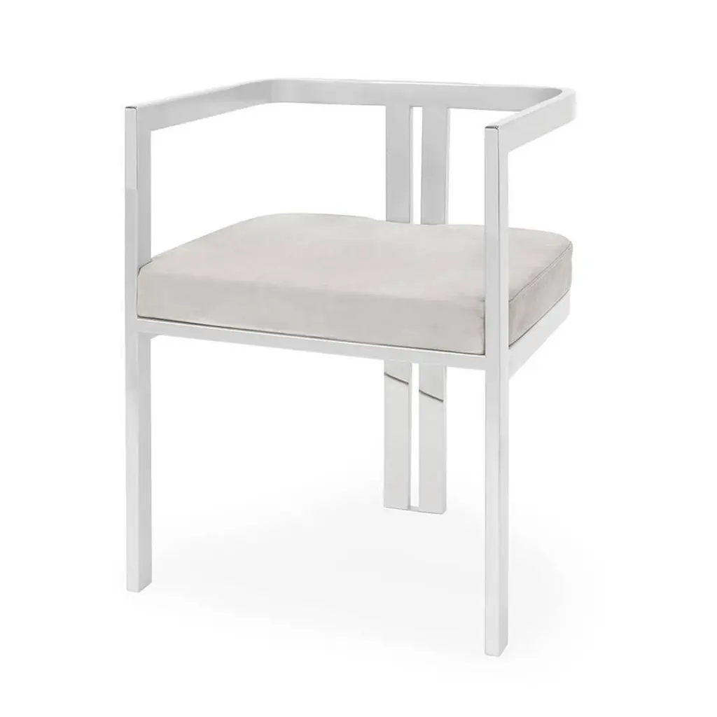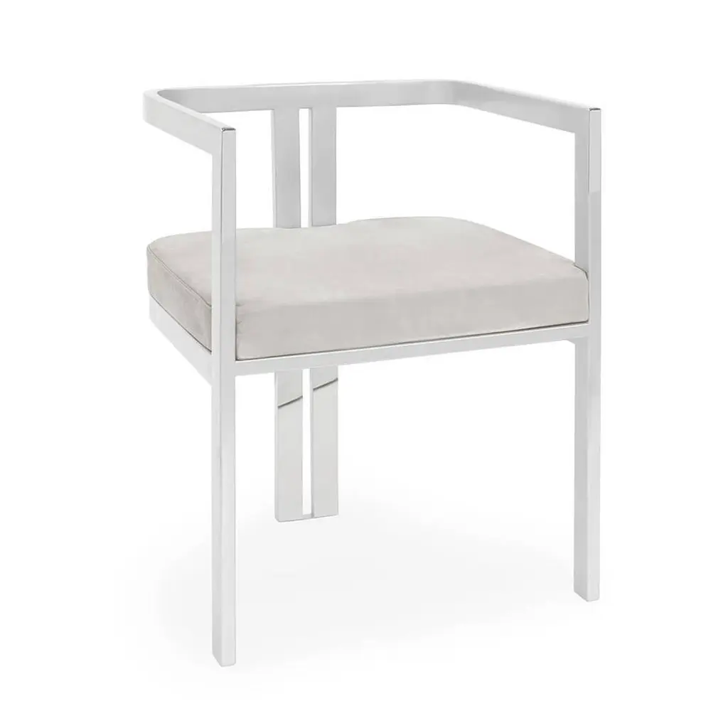 Armchair Linkin with structure in satinated gold metal finish, with grey velvet fabric seat. Subtlearmchair in 1970s deco style.Also available in chrome metal finish with ecruvelvet fabric seat.