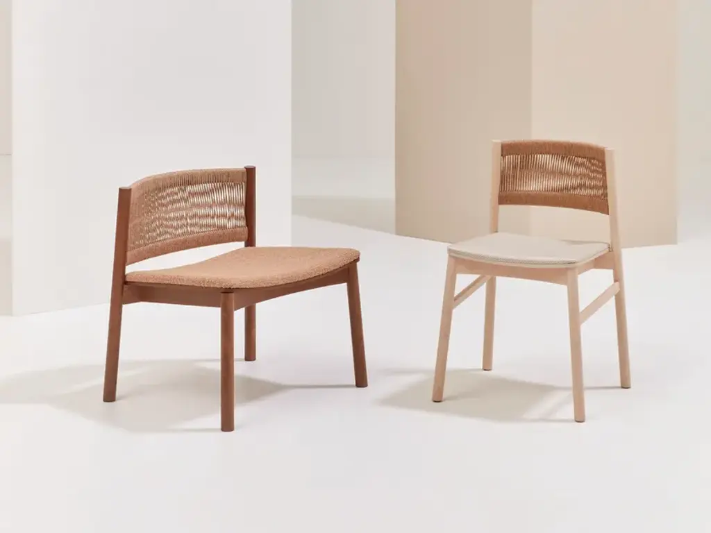 Load 851 is a small armchair with a solid beech wood frame, a backrest made of cellulose cord, and an upholstered seat.Load is a collection that makes the correspondence between form and function its fundamental principle.Starting from a chair reduced to its bare essentials, the typological and aesthetic creativity of this collection unfolds, which—besides the chair—includes an armchair, a small armchair, and a stool.Load is also available in versions with a backrest woven in nautical rope, a craftsmanship inspired by Billiani’s territory, situated between hills and plains and not far from the sea.