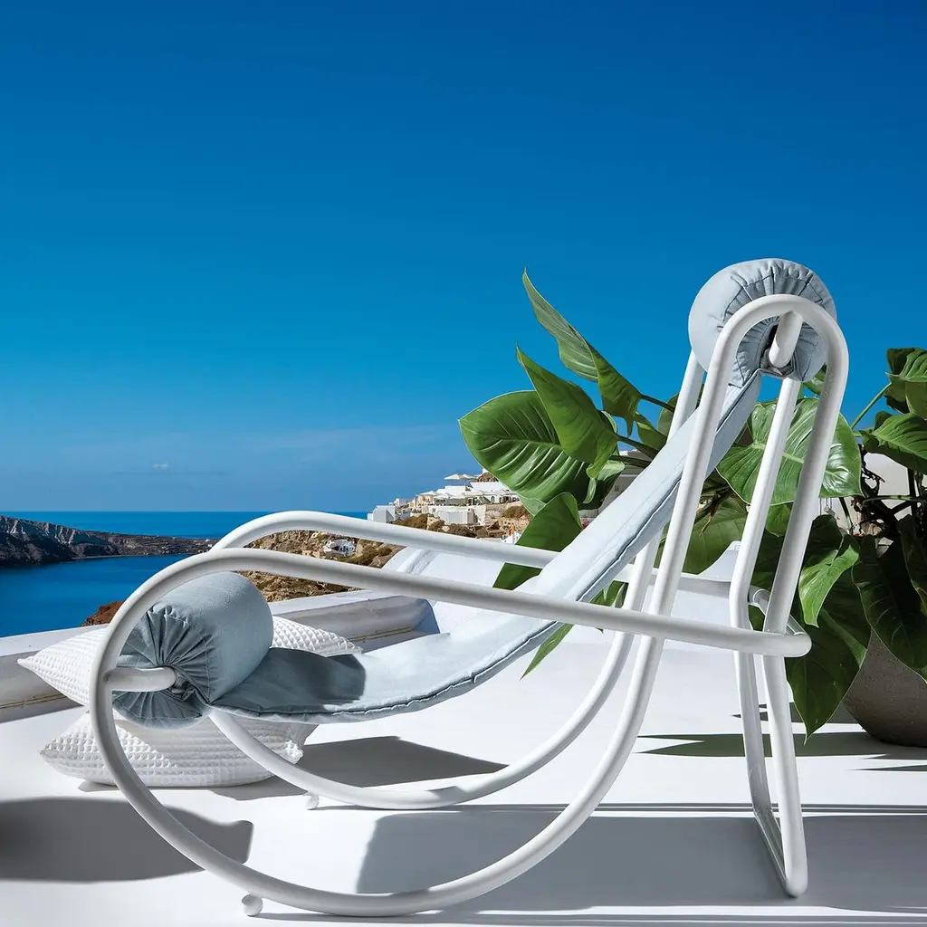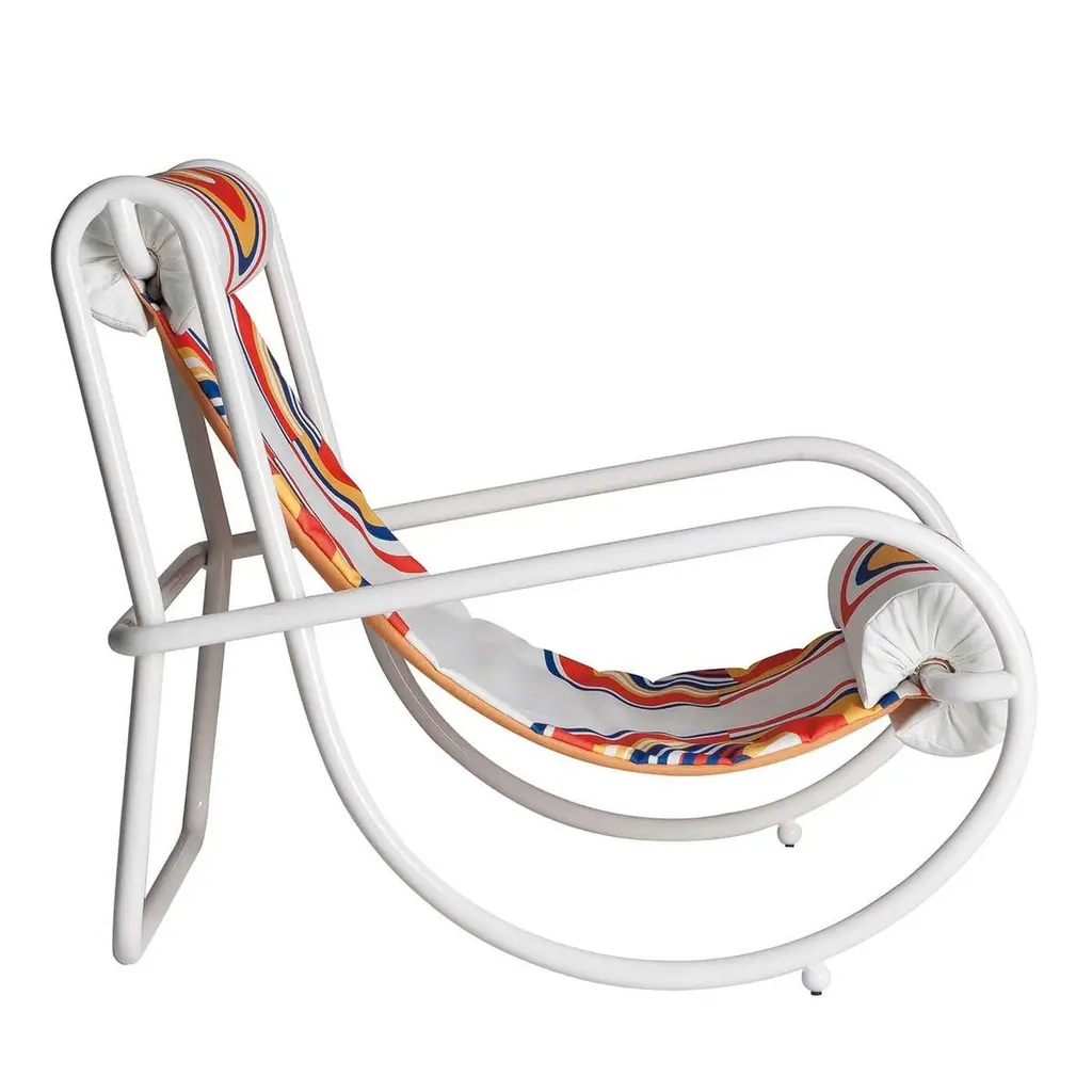 Recalling the classic shape of curved wooden rocking chairs, the voluptuous geometry of the steel tubular frame of this armchair convey a unique aesthetic that merges functional and stylistic elements. Designed by Italian architect Gae Aulenti in 1964 as part of the Locus Solus Collection of outdoor furniture, the white finish of the structure provides the perfect frame for the exclusive, colorful print of the fabric sling and bolsters marking the headrest and leg rest. The new editions re-introduced by Exteta in 2016 can be customized in all its catalog fabrics.